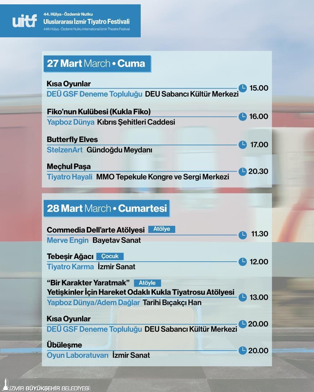 The festival will start on March 27 at 15:00 at Sabancı Kültür Merkezi with Short Plays by the Experimental Theatre Group of Dokuz Eylül University Faculty of Fine Arts. On the same day, at 16:00, Yapboz Dünya will stage Fiko’s Hut on Kıbrıs Şehitleri Caddesi. At 17:00, Butterfly Elves by Stelzen Art will be performed at Gündoğdu Meydanı. At 20:30, Meçhul Paşa by Tiyatro Hayali will be staged at Tepekule Congress and Exhibition Center.