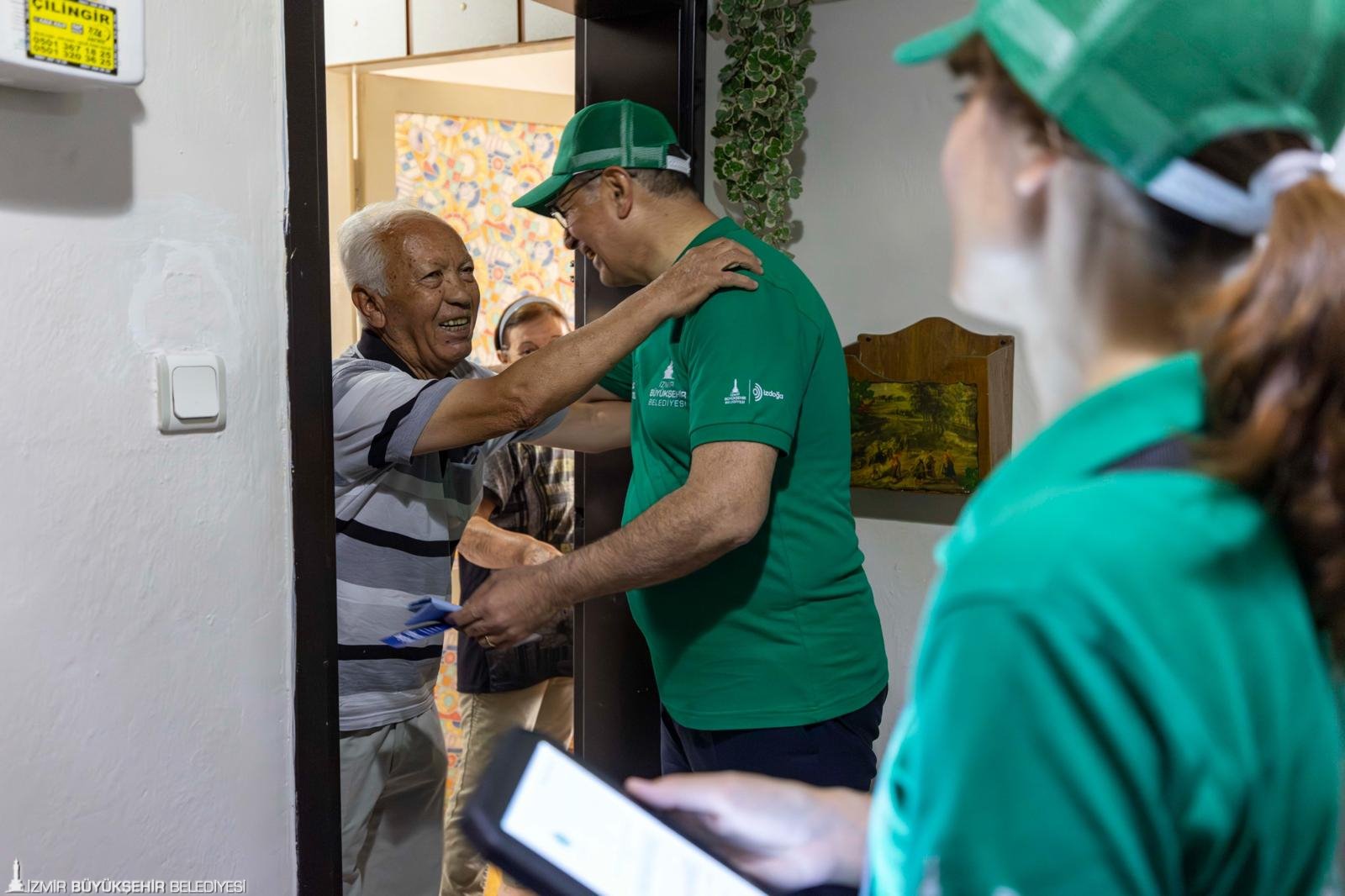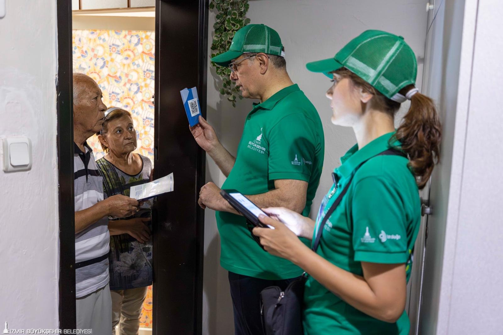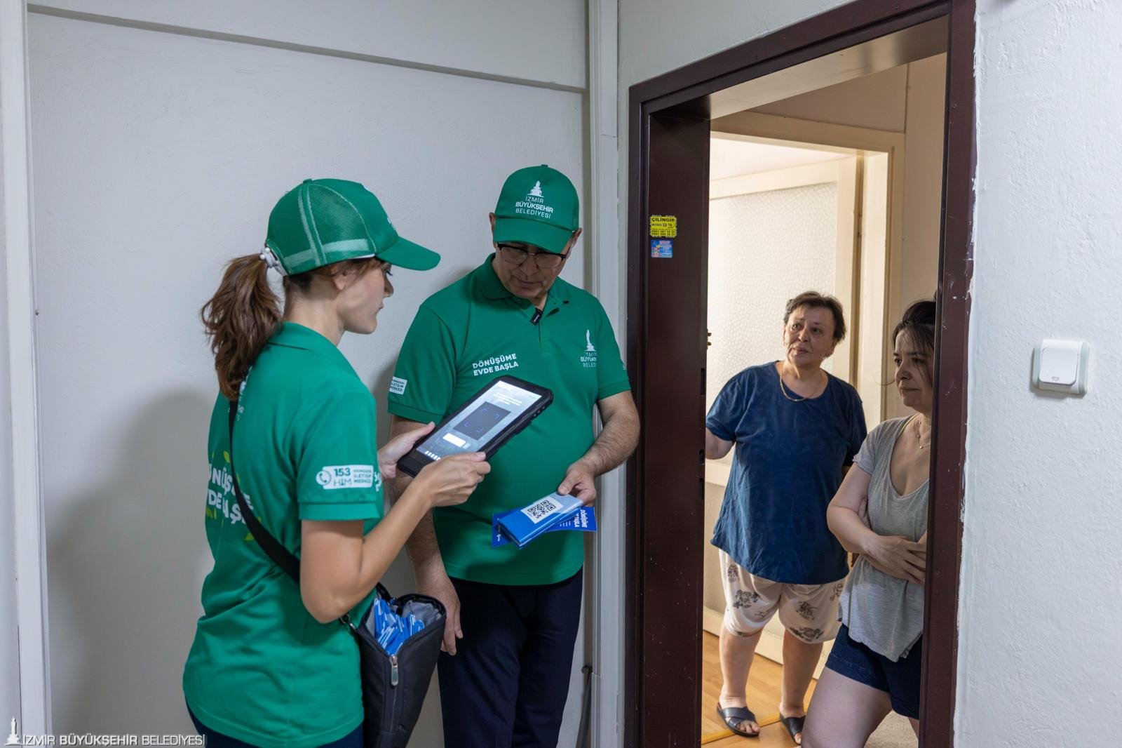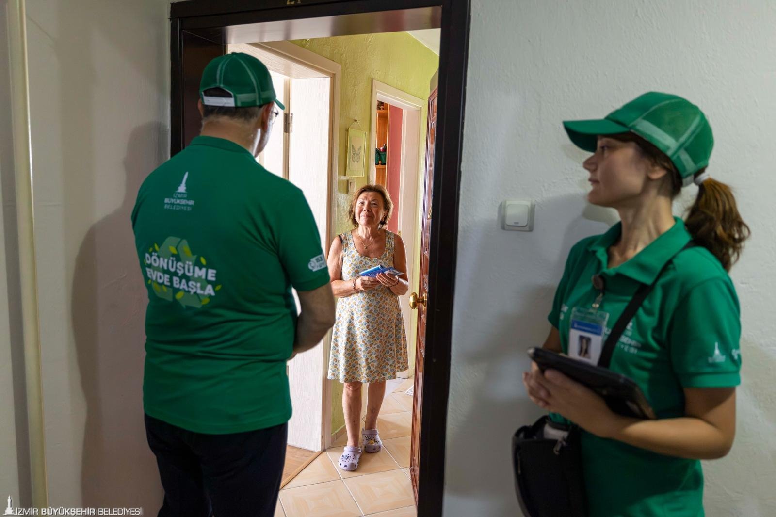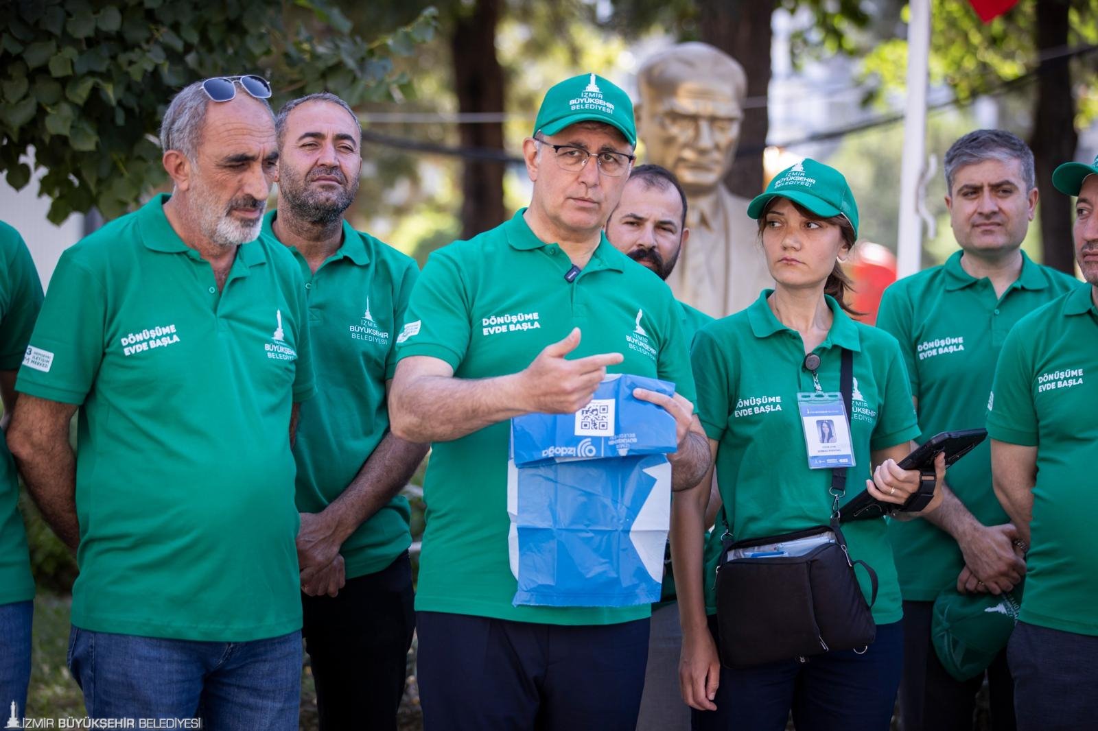 Başkan Tugay, Manavkuyu Mahallesi’nde bulunan Papatya Apartmanı’na girerek ilk kapıyı çaldı. Kapıyı açan Hüsne Tekmen, karşısında personel kıyafeti giyen ve şapka takan Başkan Tugay’ı görünce şaşkınlığını gizleyemedi. Başkan Tugay’ı evine davet eden Tekmen, projenin önemli olduğunu belirterek, destek vereceklerini söyledi. Sonrasında apartmanı gezen Başkan Tugay, QR kodlu poşetlere nelerin atılıp nelerin atılmayacağını, hangi zamanlarda poşetlerin toplanacağını apartman sakinlerine anlattı.