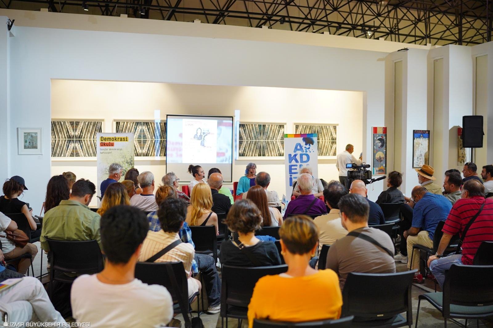Nazan Kesal, konuşmasında anti demokratik rejimlerde sanatın ve sanatçının rolünden bahsederken, sanatın her türlü baskıya karşı bir umut taşıdığını aktardı. Gençleri yaratıcı bulduğunu, bu nedenle ilerleyen süreçte sanatta sürprizler ile karşılaşacağımızı belirtti. Yüksel Aksu ise İzmir’in kadim kültürünün demokratik bir geleneği olduğunu, kentin çok kültürlü dokusunu vurgulayarak anlattı.