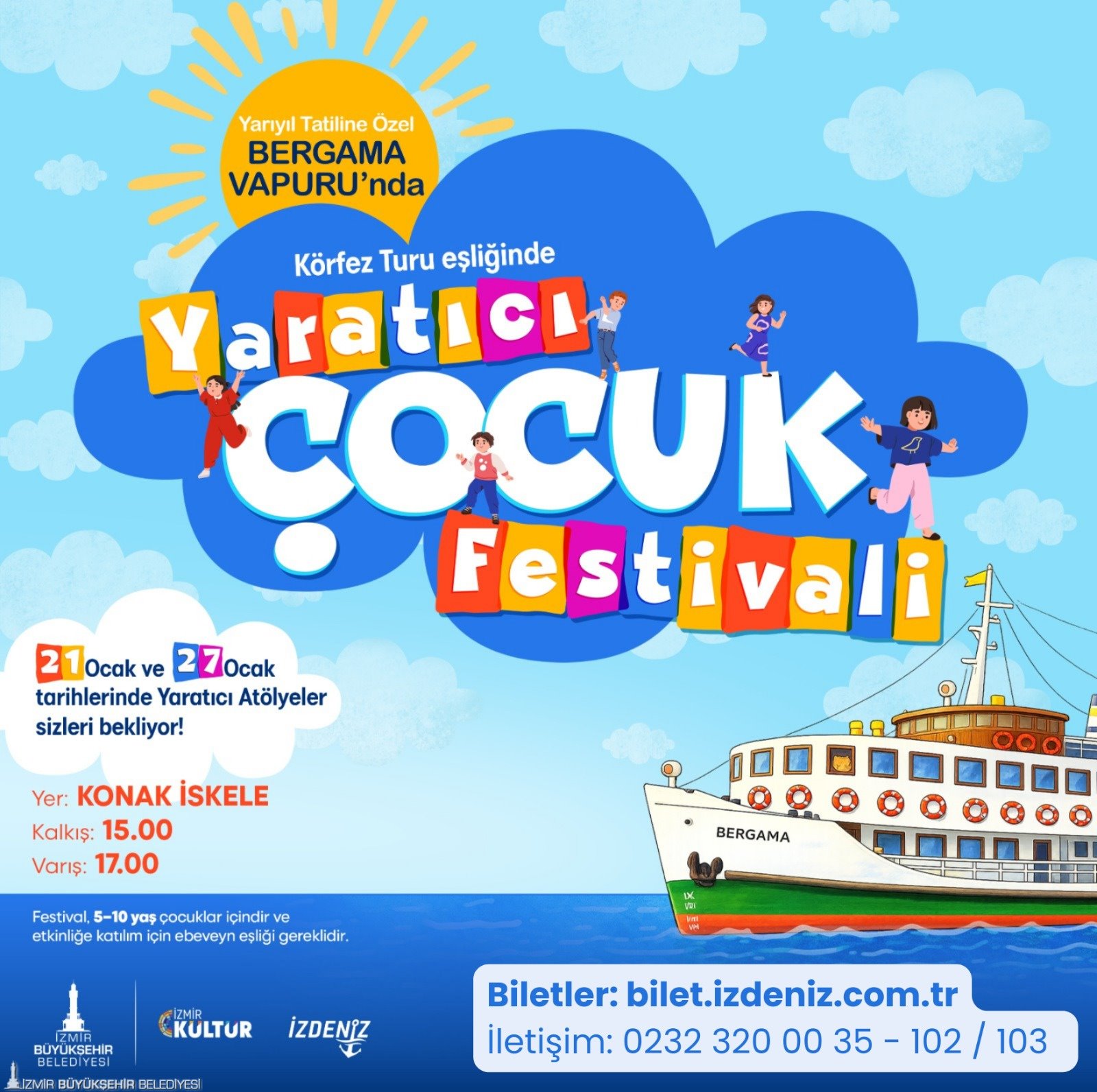İZDENİZ ve İzkültür, yarıyıl tatilinde çocuklara özel turlar düzenliyor. 5 ile 10 yaş arasındaki çocukları kapsayacak turlar, 21 Ocak Çarşamba ve 27 Ocak Salı düzenlenecek. Kalkış iskelesi Konak olarak belirlenirken, turlar 15.00-17.00 saatleri arasında 2 saat olarak düzenlenecek. Tur boyunca İzmir’in renkleri boyama atölyesi, gizemli ada yaratıcı drama atölyesi, hayalimdeki vapur kolaj atölyesi yapılacak. Etkinlik biletleri www.bubilet.com.tr ve bilet.izdeniz.com.tr siteleri üzerinden satılıyor.