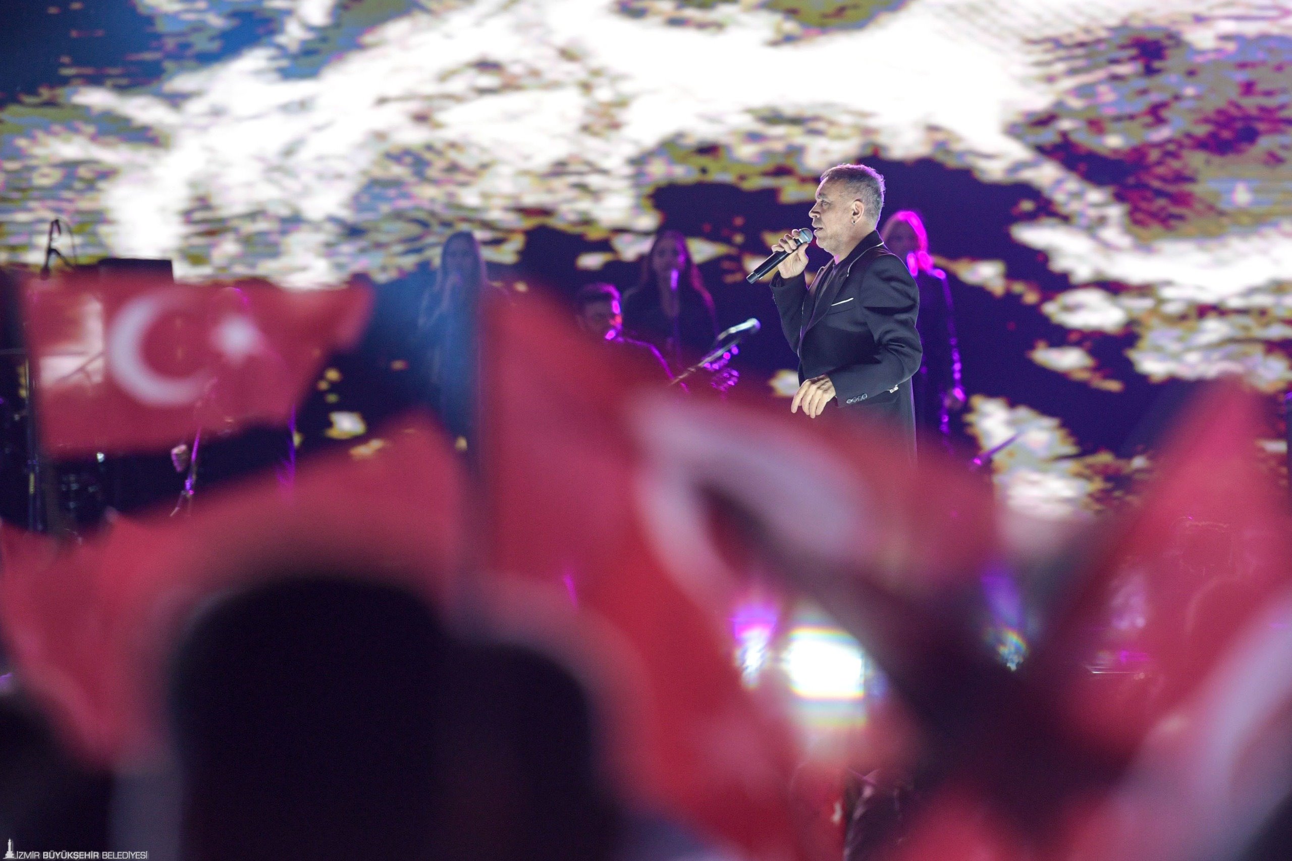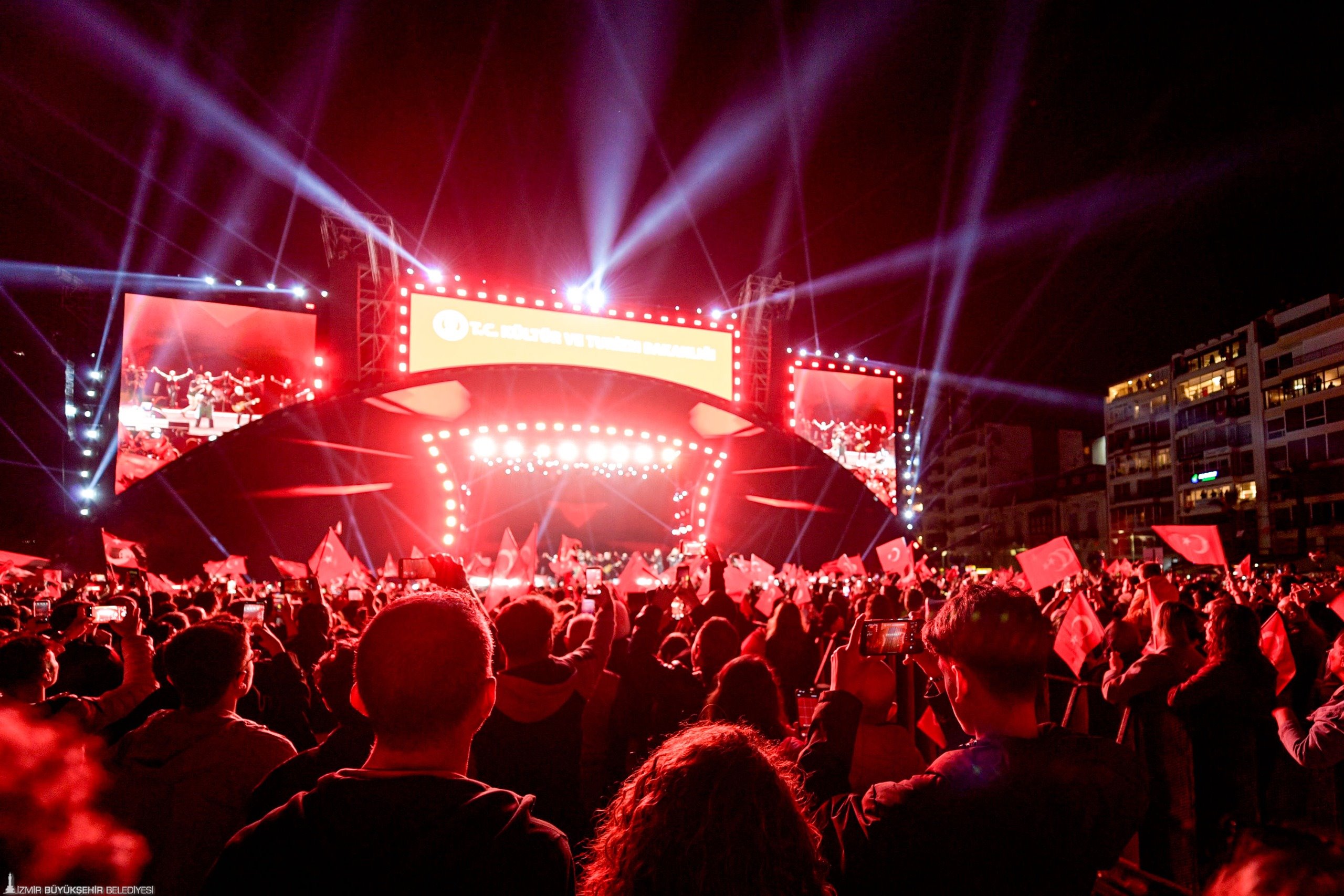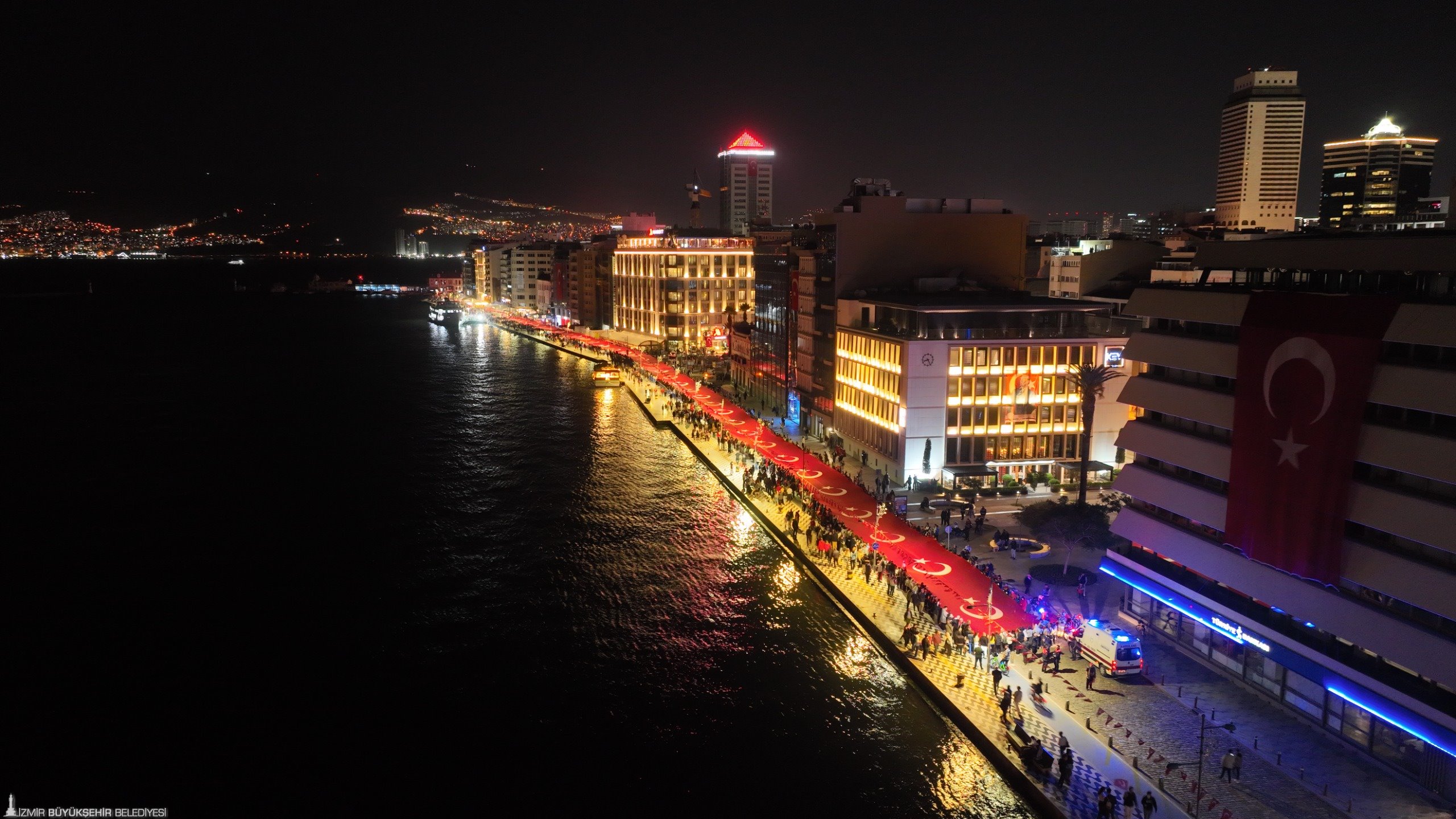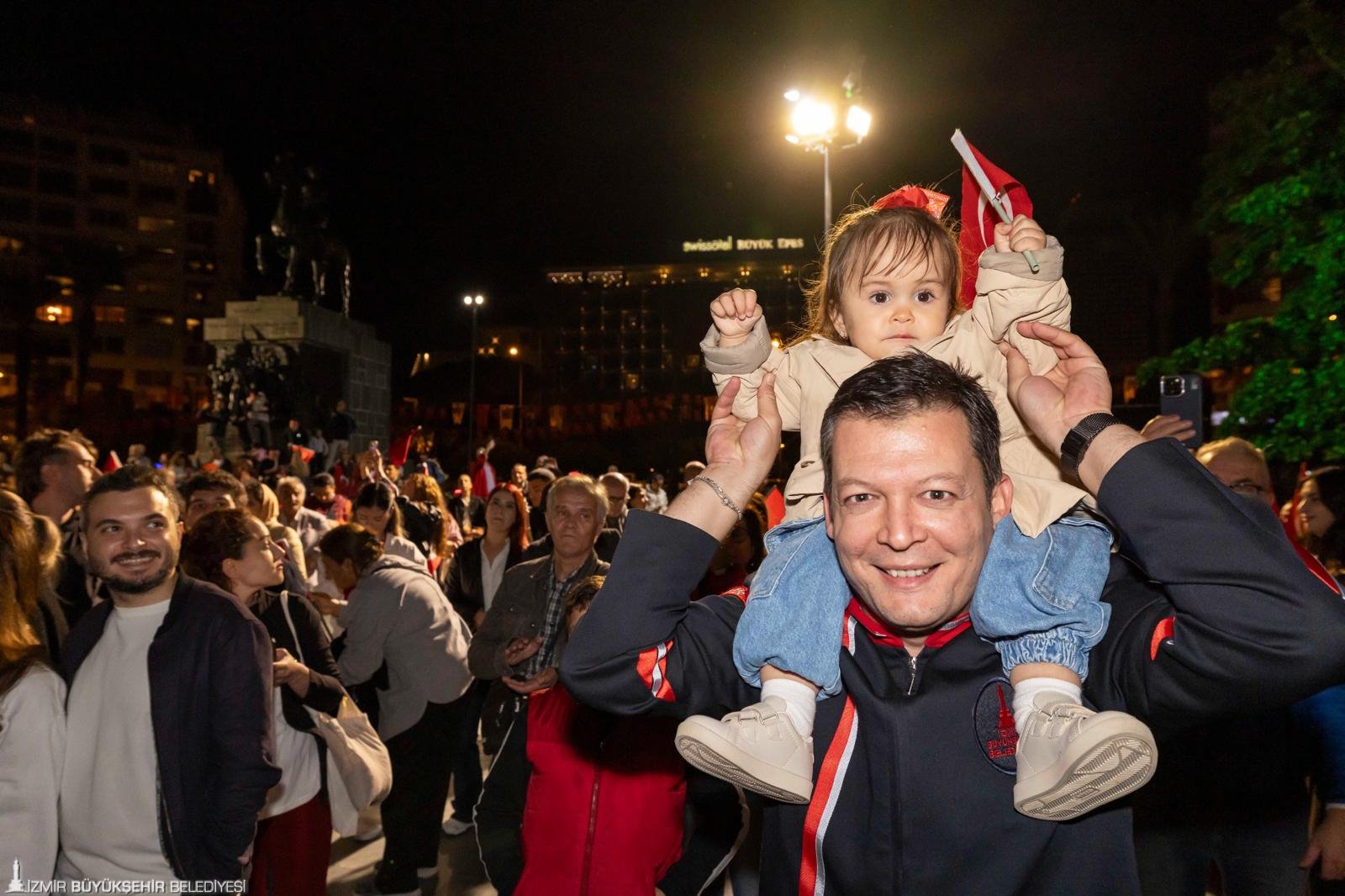 Kortej, Konak Pier önünde 350 metrelik Türk bayrağı ve fener alayı ile birleşti. Bandonun çaldığı marşlar eşliğinde kortej Cumhuriyet Meydanı'na doğru devam etti. Meydanda yapılan havai fişek gösterisi fener alayı yürüyüşüne renk kattı. Cumhuriyet coşkusu, saat 21.00’de Gündoğdu Meydanı’nda düzenlenen Haluk Levent konseri ile doruğa çıktı.