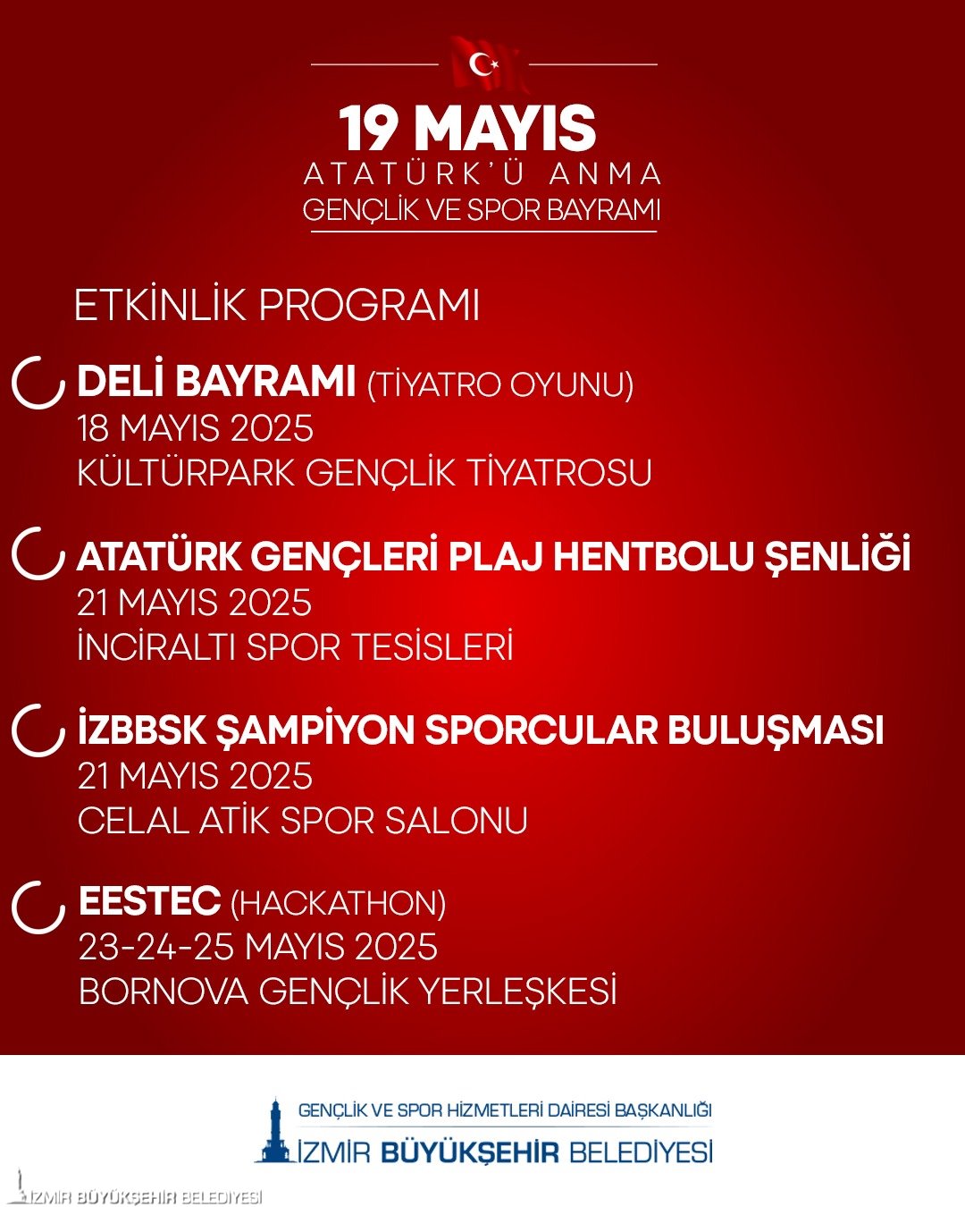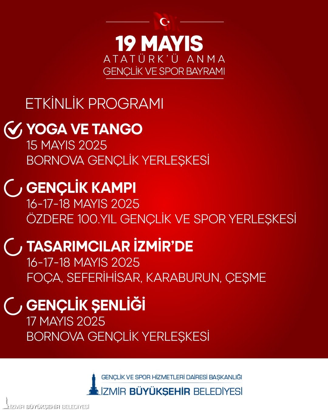 Genç İzmir Bornova Gençlik Yerleşkesi’nde 17 Mayıs’ta gençlik şenliği düzenlenecek. Tüm gün çeşitli atölyeler, ödüllü yarışmalar, bilgi yarışması, zipline ve Macera Parkuru etkinlikleri müzik eşliğinde yapılacak. 18 Mayıs’ta Kültürpark Gençlik Tiyatrosu’nda Genç İzmir Tiyatro Topluluğu’nca yazar Turgut Özakman’ın Deli Bayramı oyunu sahnelenecek.