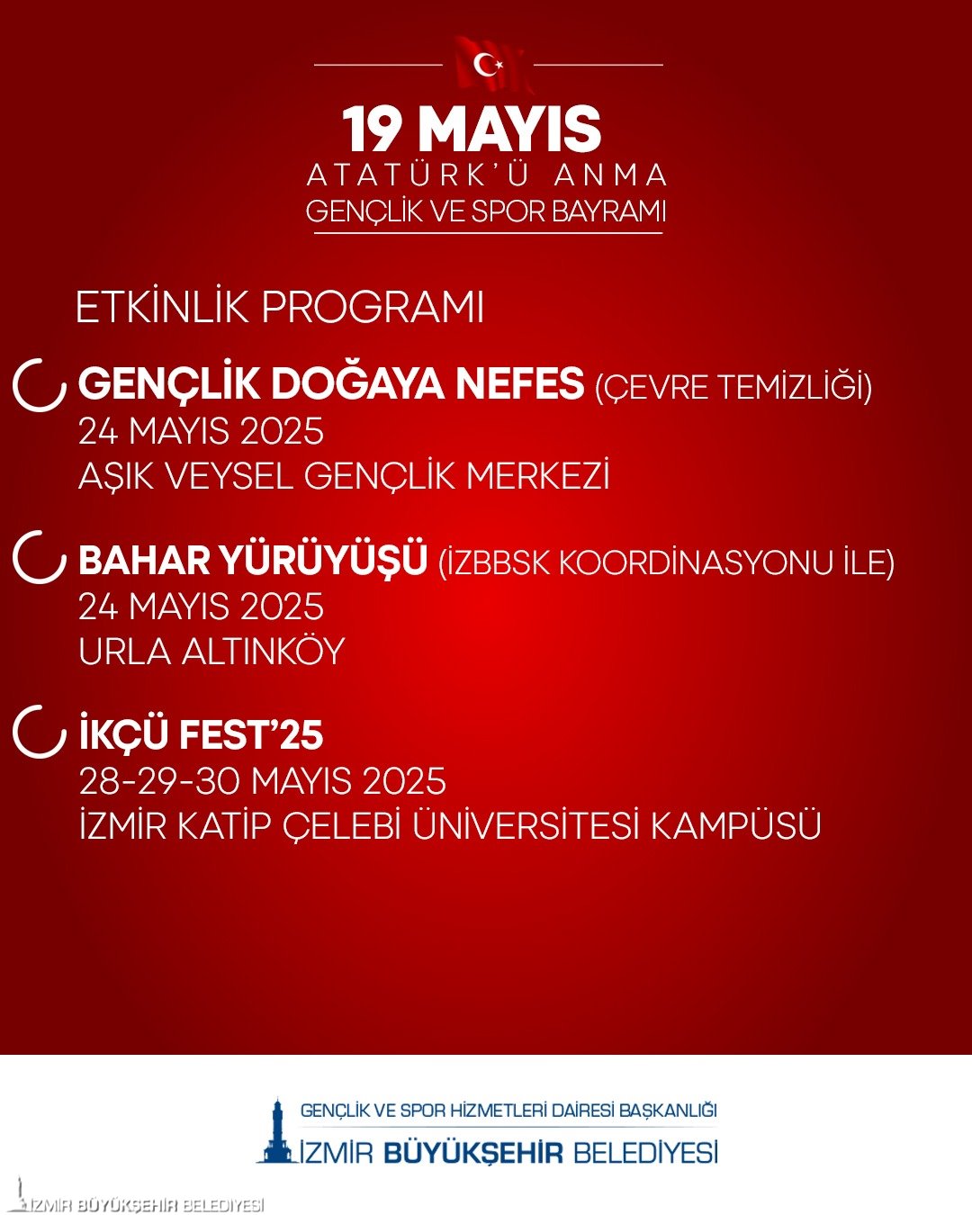 İzmir Büyükşehir Belediyesi 19 Mayıs Atatürk’ü Anma, Gençlik ve Spor Bayramı kutlamaları kapsamında mayıs ayına yayılan bir etkinlik programı hazırladı. İzmir, Türkiye'nin dört bir yanından gelen gençlerin buluşma noktası olacak.
