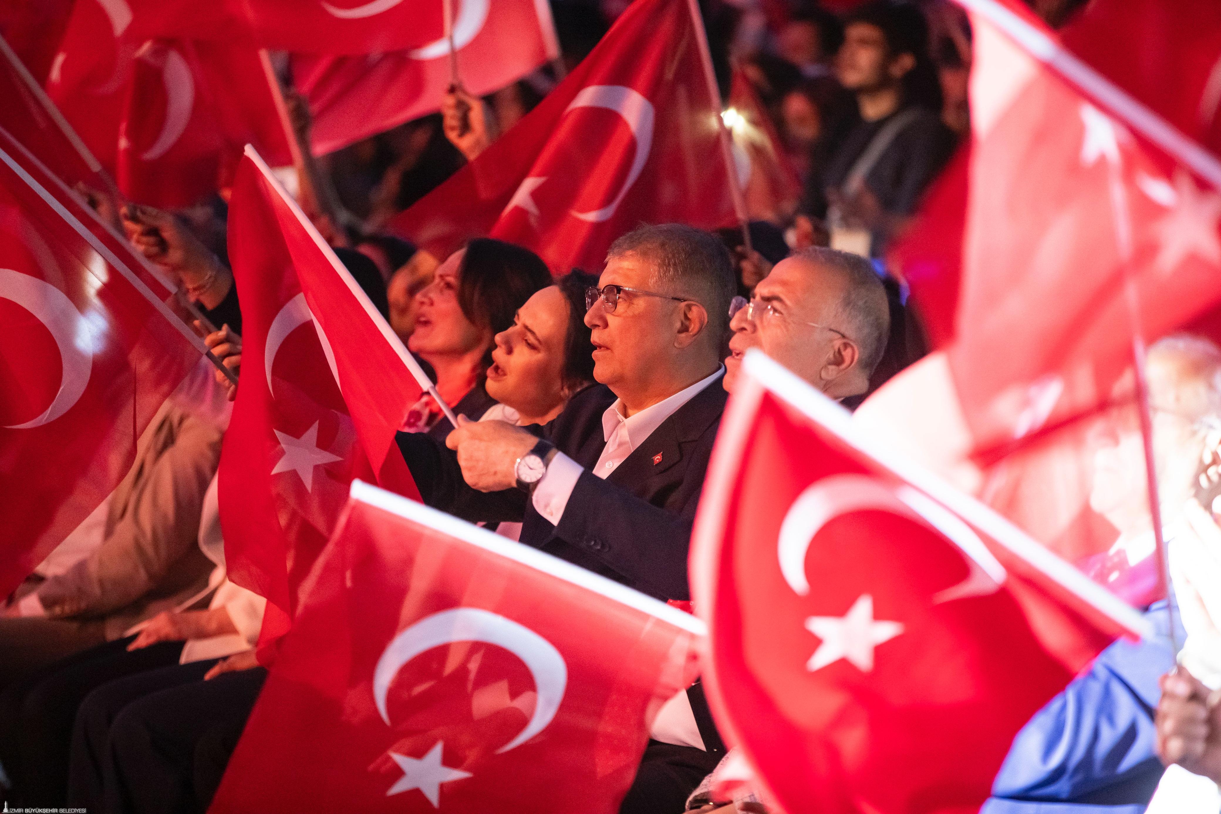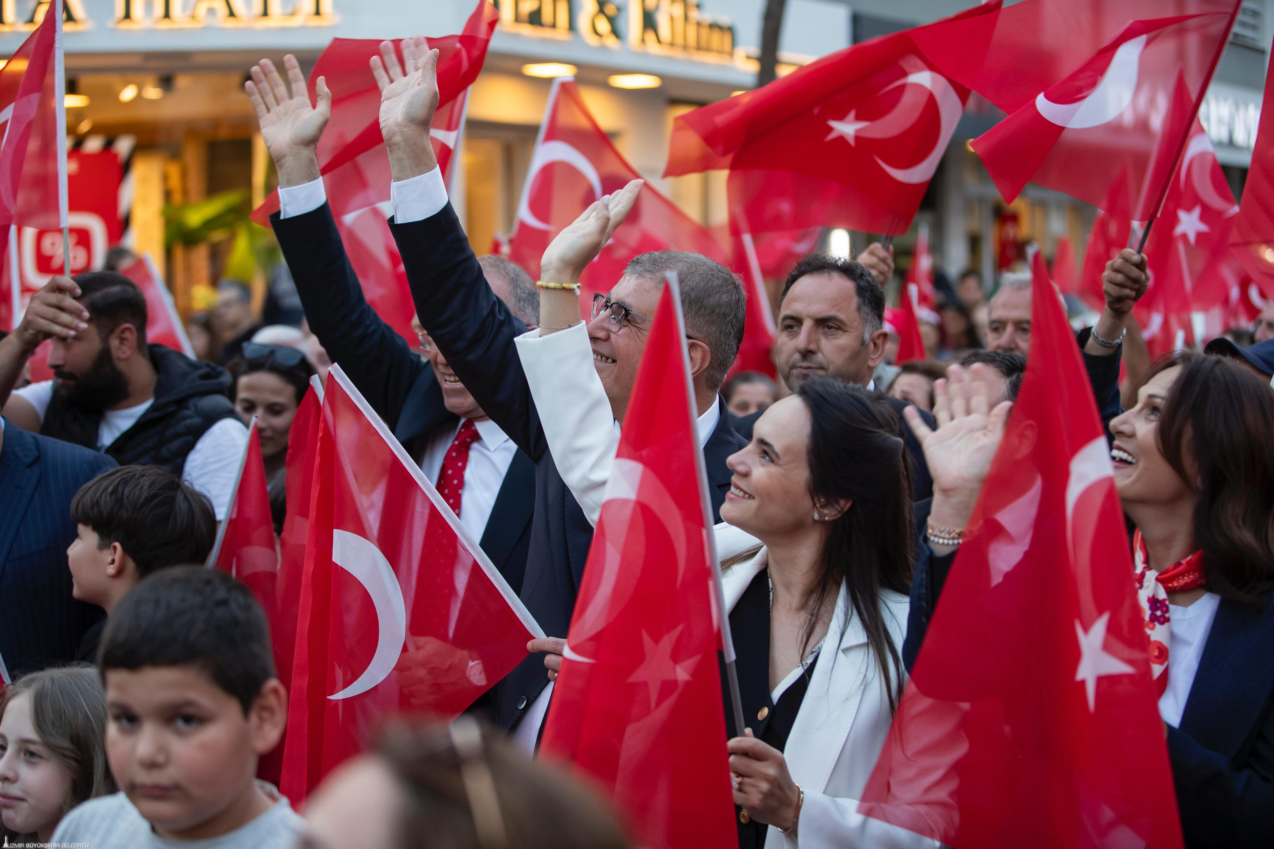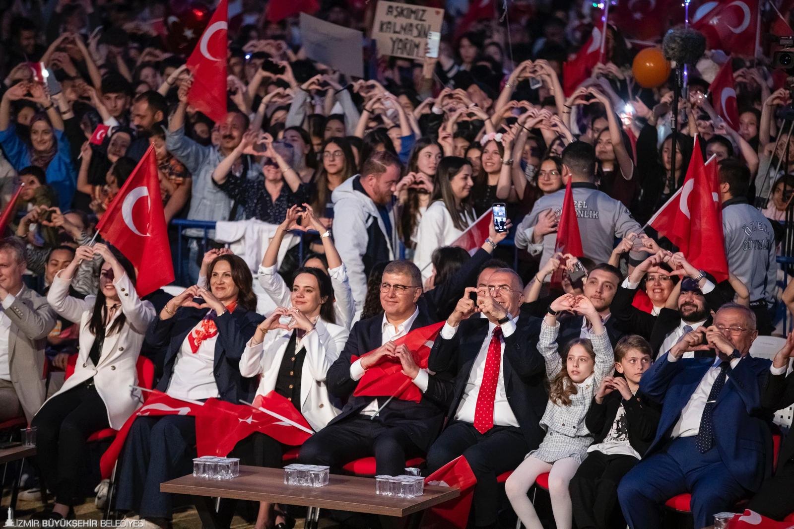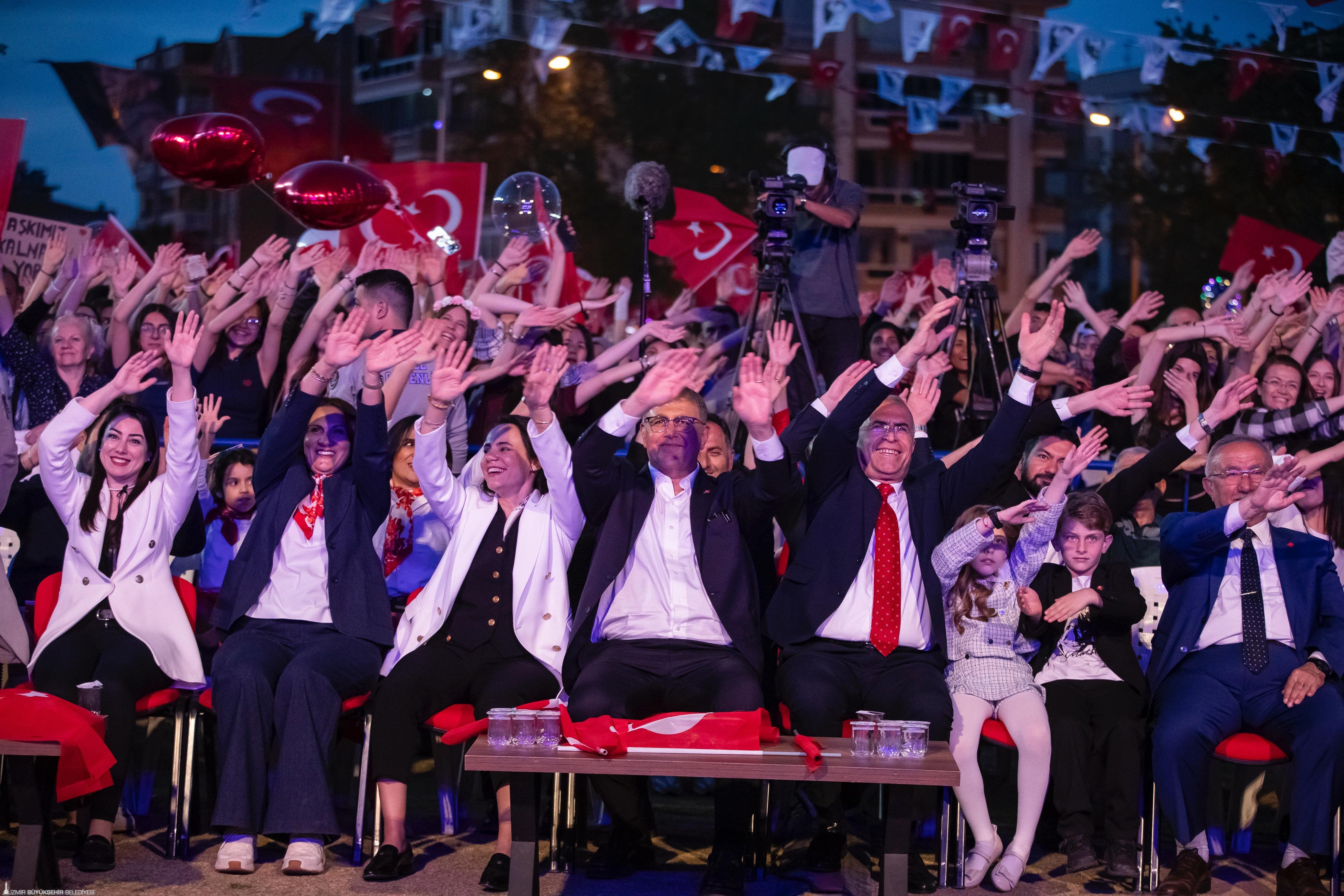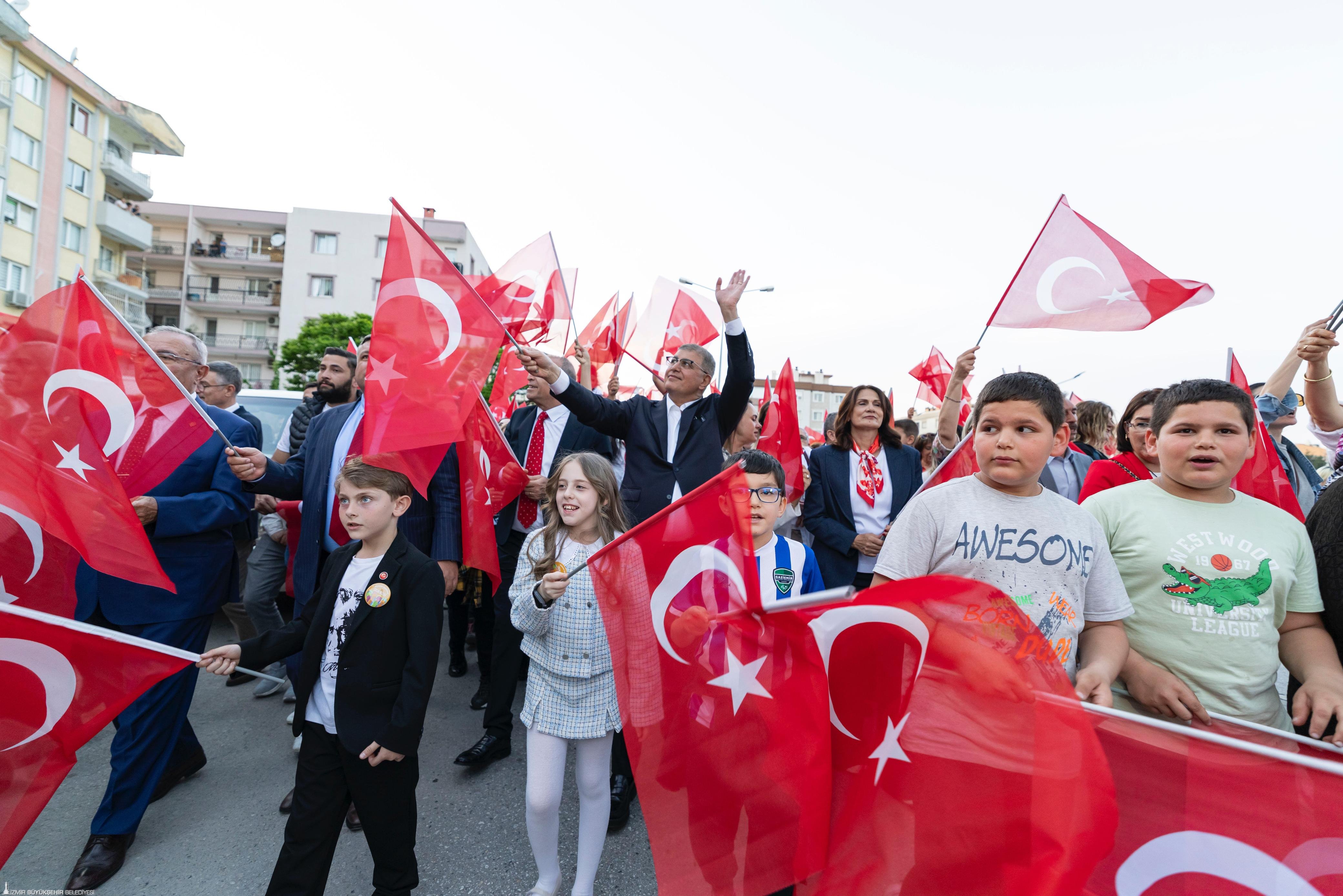 Korteje katılan yurttaşlar, Türkan Saylan Caddesi’nden Festival Alanı'na bandonun çaldığı marşlar eşliğinde yürüdü. Gaziemirli yurttaşlar da evlerinin balkonundan ellerindeki Türk bayraklarıyla korteje destek verdi. Başkan Tugay kortej boyunca çocuklarla bir araya gelerek hatıra fotoğrafı çektirdi, İzmirli yurttaşlarla selamlaştı. 23 Nisan coşkusu Festival Alanı’nda devam etti. Ersin Show'un yer aldığı sahne etkinliğinde marşlar söylendi, "Hak, hukuk, adalet" sloganları atıldı. Telefon ışıkları ile tam bir görsel şölen yaşanırken çocuklara bu bayramı armağan eden Gazi Mustafa Kemal Atatürk anıldı.