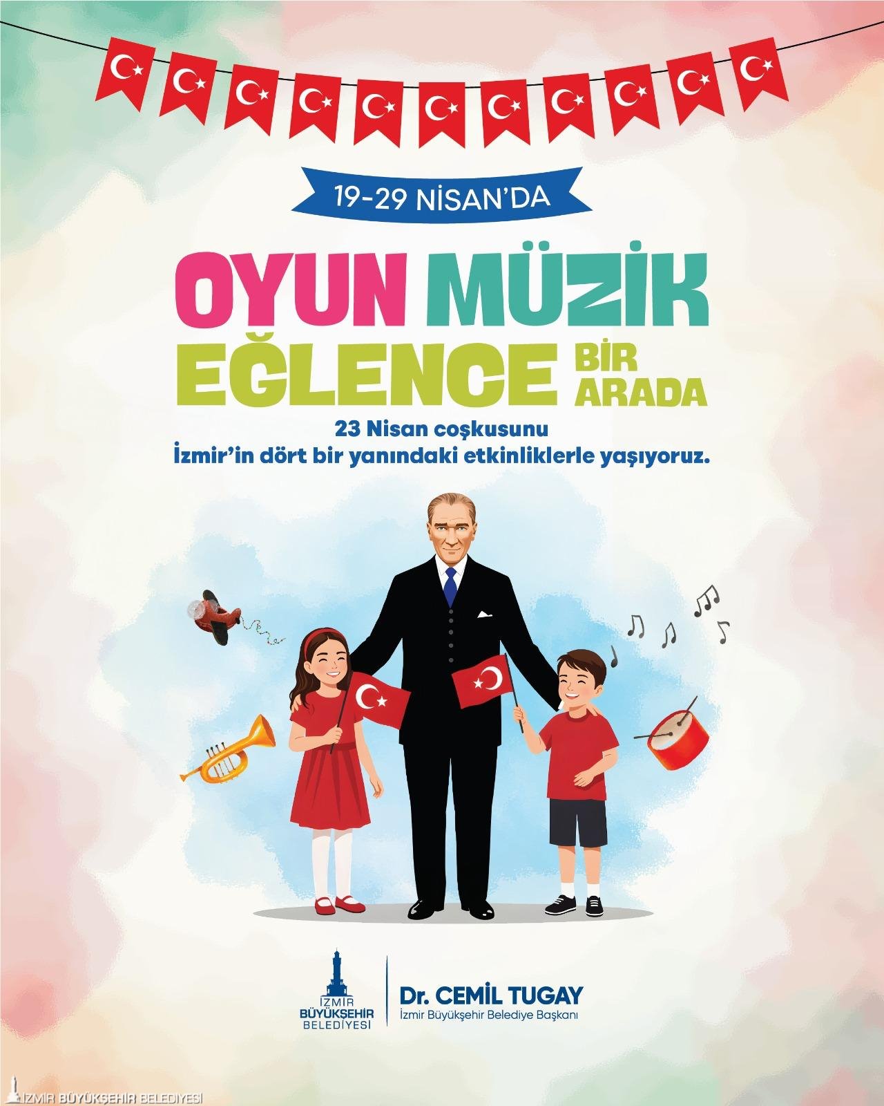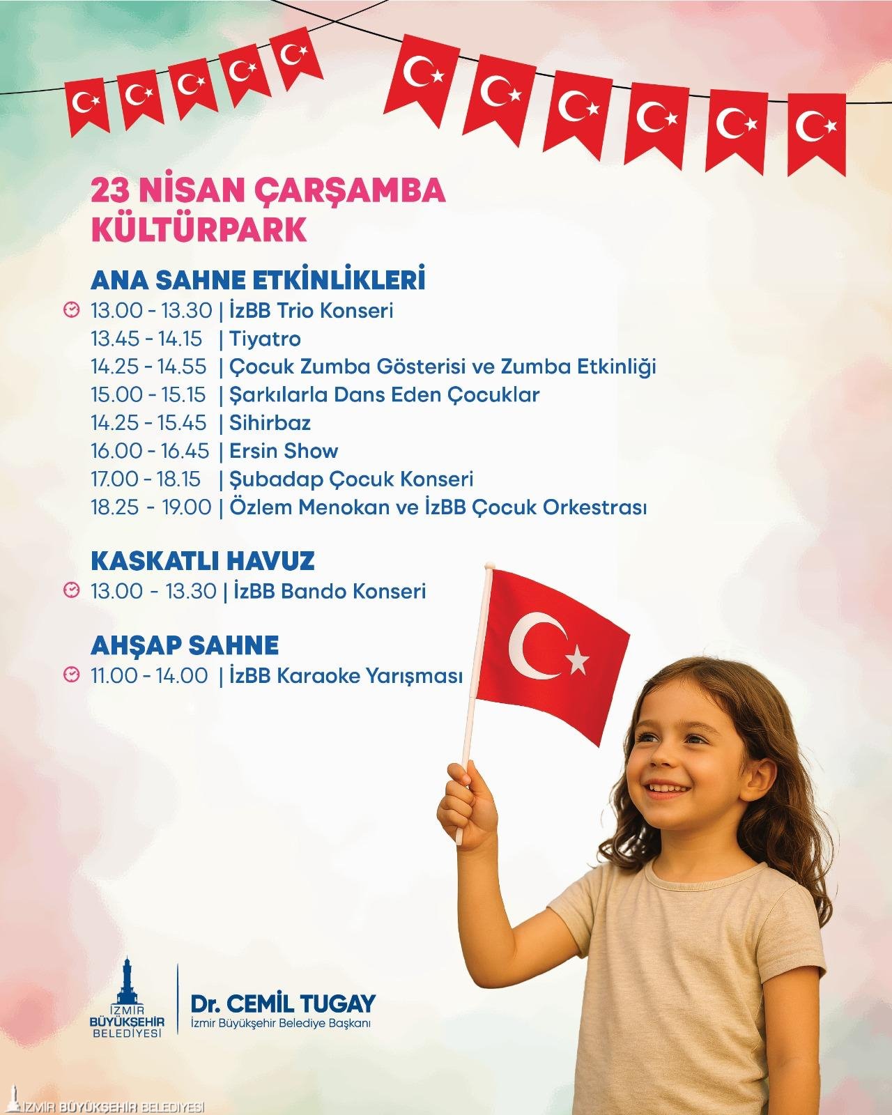 23 Nisan Ulusal Egemenlik ve Çocuk Bayramı, İzmir’de birbirinden eğlenceli etkinliklerle kutlanacak. Kültürpark’ta kurulacak oyun alanları, sahne etkinlikleri ve atölyeler, çocukların coşkusunu doruğa çıkaracak. Kentin farklı noktalarında çeşitli spor etkinlikleri, konserler, atölyeler ve şenlikler düzenlenerek İzmir’de bayram havası oluşturulacak. Resmi program, 23 Nisan’da 09.30’da Cumhuriyet Meydanı’nda başlayacak. Kent protokolü tarafından Atatürk Anıtı’na çelenk konulacak. 10.00’da ise kutlama töreni başlayacak.