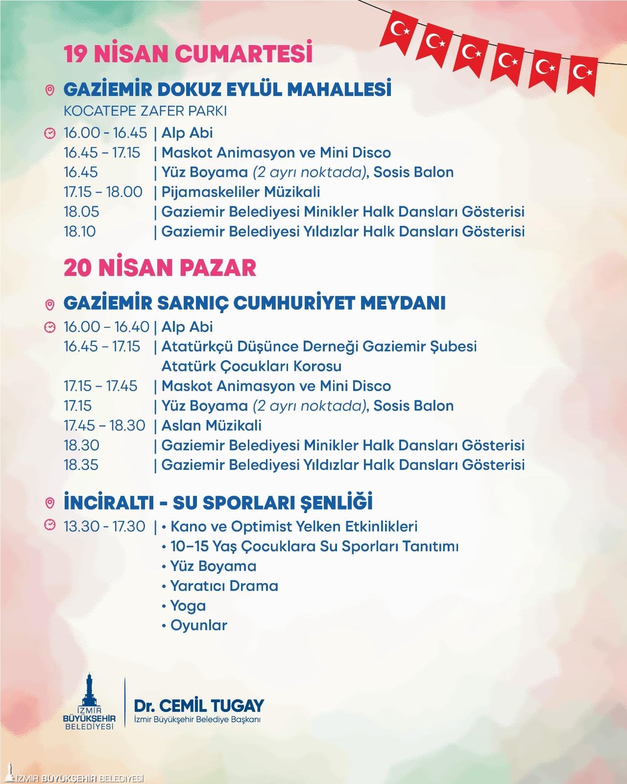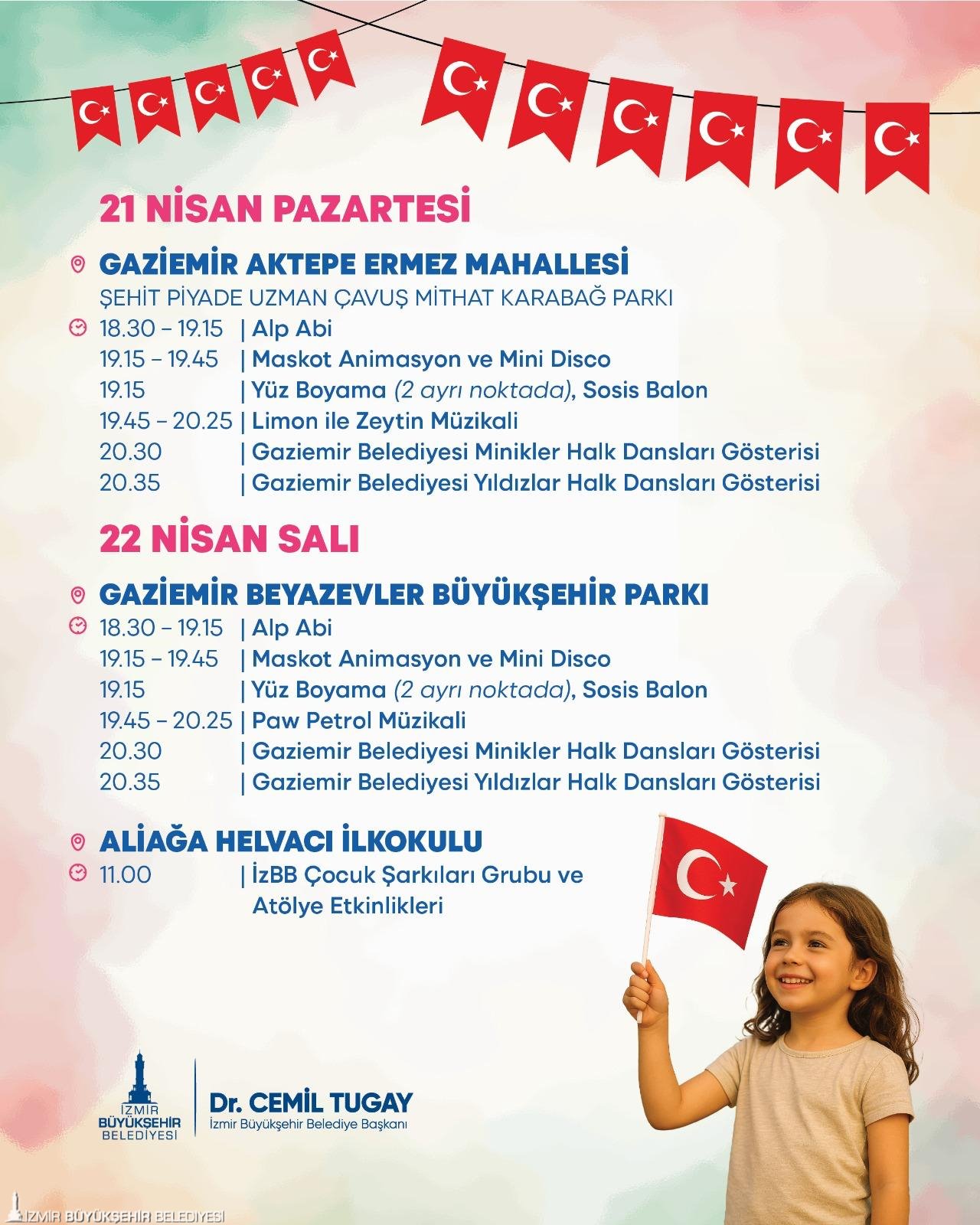 Aliağa Helvacı İlkokulu bahçesinde 22 Nisan günü saat 11.00’de ve Karaburun merkezinde bulunan meydanda 26 Nisan günü saat 14.00’te atölye etkinlikleri ve İzmir Büyükşehir Belediyesi Çocuk Şarkıları Grubu konseri var.
