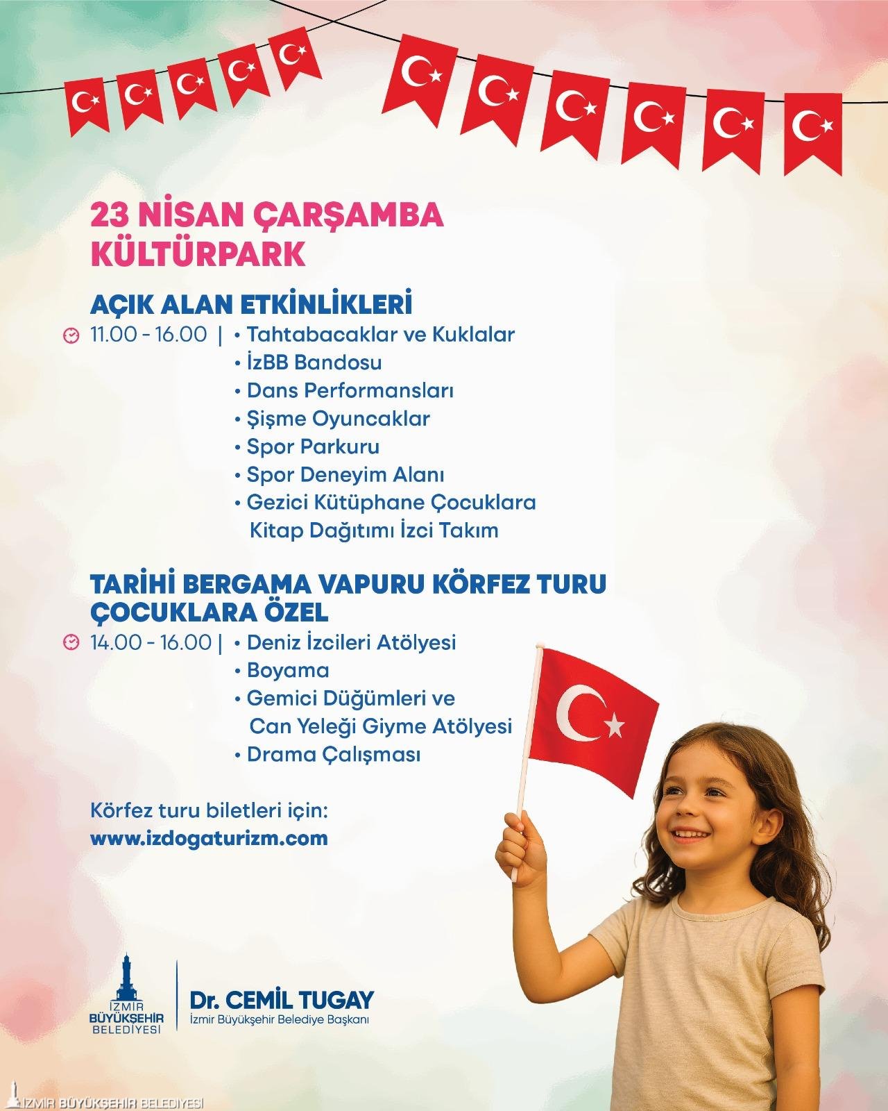 İzmirli çocuklar için İZDENİZ ve İZDOĞA tarafından çok özel bir etkinlik daha planlandı. Konak İskele’den kalkacak tarihi Bergama Vapuru, 23 Nisan’a özel çocuklar için Körfez turu yapacak. Etkinliğe 7-12 yaş arası çocuklar ebeveynleriyle katılabilecek. 14.00-16.00 saatleri arasındaki turda drama çalışması, Deniz İzcileri Atölyesi, Gemici Düğümleri ve Can Yeleği Giyme Atölyesi düzenlenecek. Bir yetişkin ve bir çocuğun katılımını kapsayacak turun biletleri için www.izdogaturizm.com adresi ziyaret edilebiliyor.