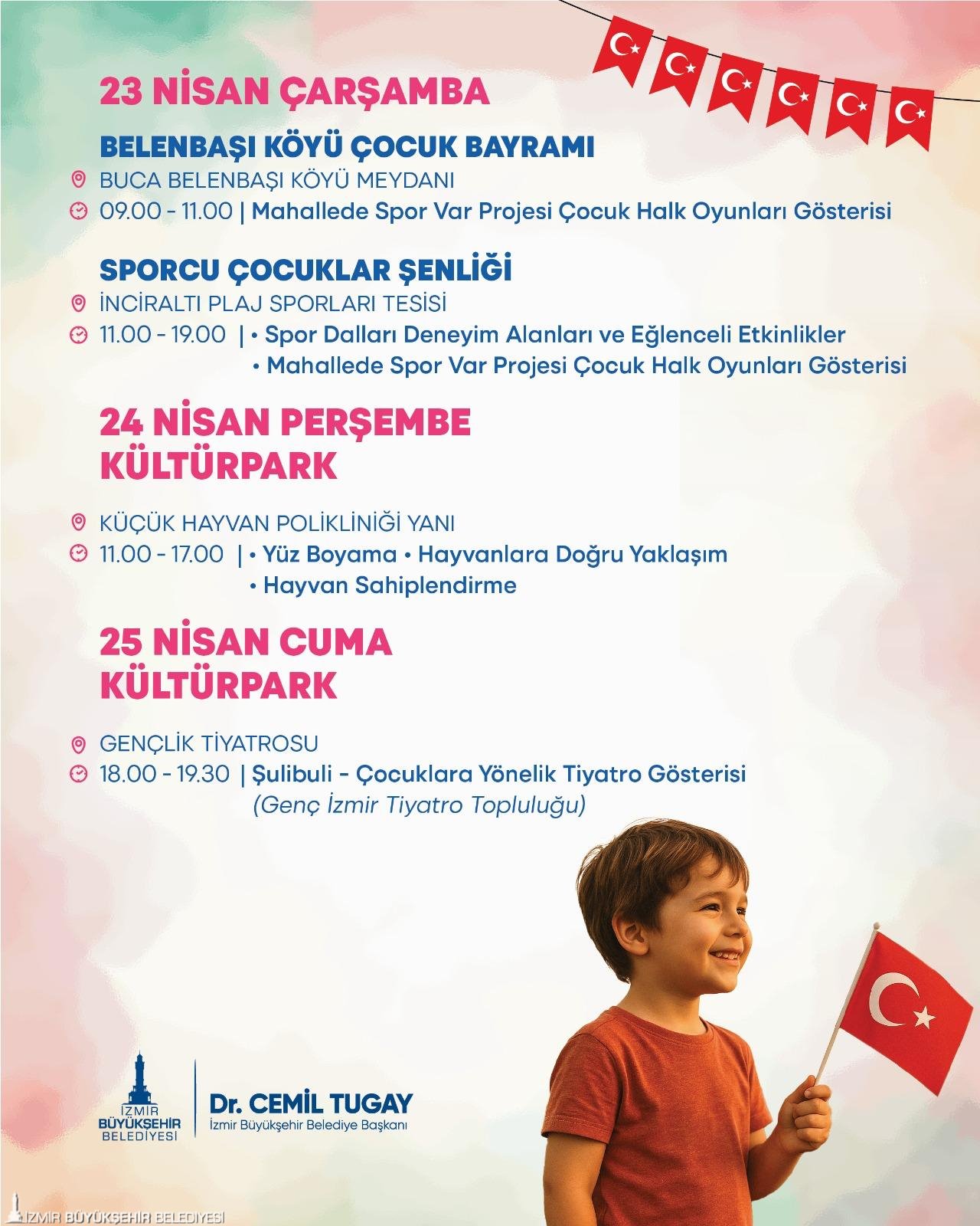 İzmir Büyükşehir Belediyesi Şehir Tiyatroları, 23 Nisan günü saat 14.00’te İsmet İnönü Sahnesi’nde “Soytarılar Okulu” adlı oyunu ücretsiz sergileyecek. Saat 15.00’te ise İzmir Büyükşehir Belediyesi Köy Tiyatroları Karşıyaka Zübeyde Hanım Mahallesi Parkı’nda “7 den 77'ye Çocuk Bayramı” etkinliği kapsamında tiyatro oyunu ve pandomim gösterimi gerçekleştirecek. Ayrıca İzmir Büyükşehir Belediyesi THM Orkestrası konseri düzenlenecek.