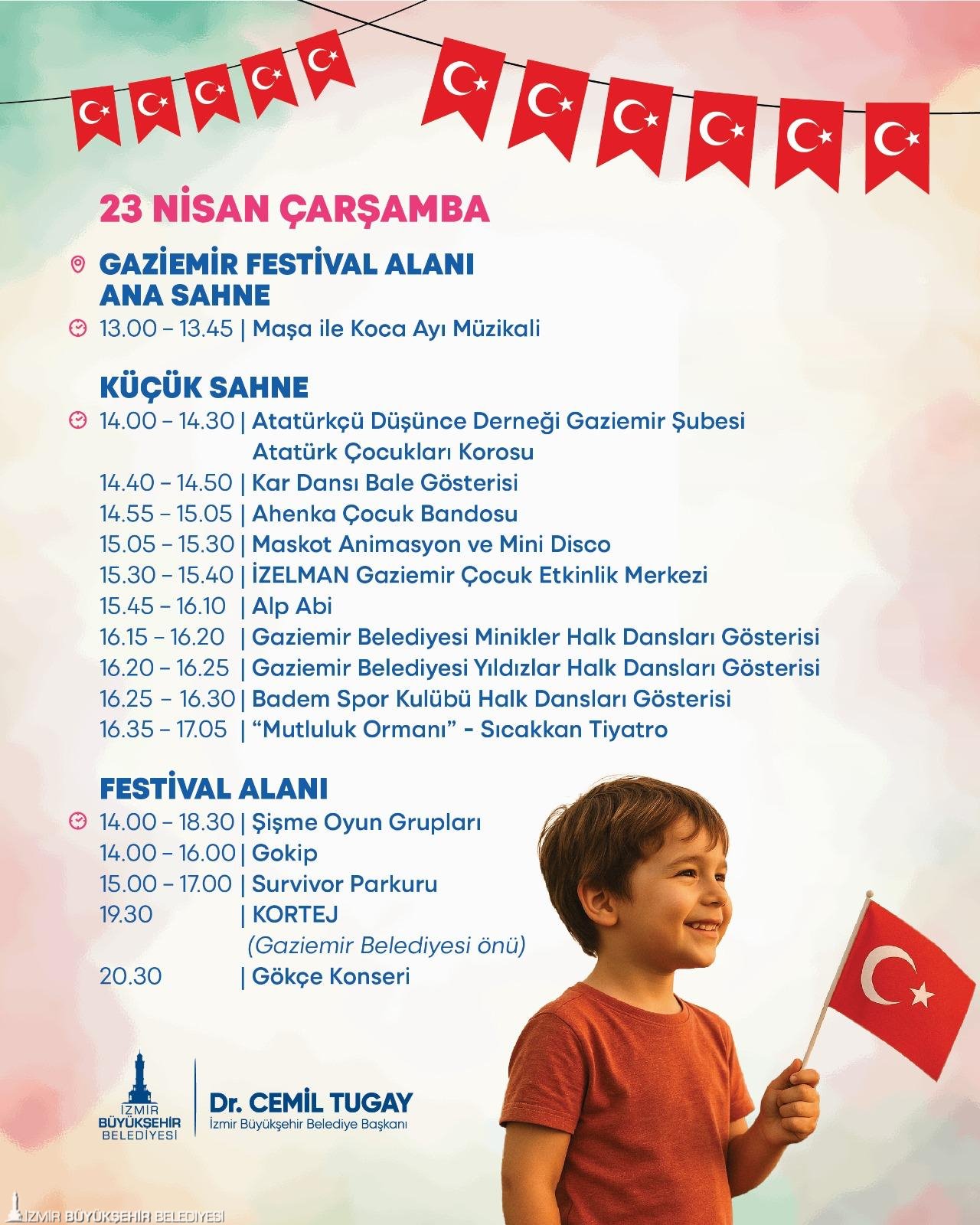 İzmir Büyükşehir Belediyesi ve Gaziemir Belediyesi iş birliği ile düzenlenecek 27. Gaziemir 23 Nisan Ulusal Egemenlik ve Çocuk Bayramı Programı, 19-23 Nisan tarihlerinde yapılacak. Gaziemir’deki kutlamalarda animasyon ve yüz boyama gibi eğlenceli etkinliklerden müzikallere kadar çok sayıda etkinlik yer alacak. Festival, Gökçe konseri ile sona erecek.