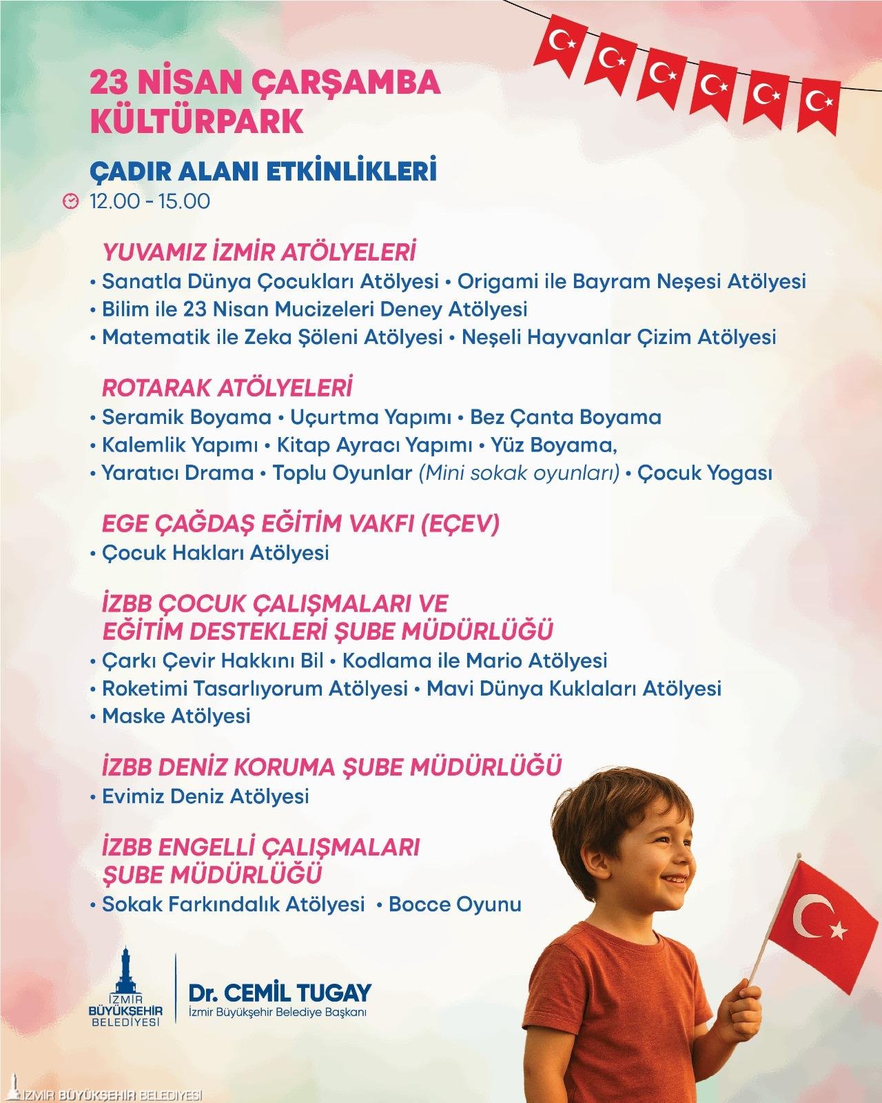 Kültürpark’ta kurulan çadır alanında 12.00-15.00 saatlerinde atölyeler olacak. İZELMAN AŞ Yuvamız İzmir Çocuk Etkinlik Merkezlerinin Sanatla Dünya Çocukları Atölyesi, Origami ile Bayram Neşesi Atölyesi, Bilim ile 23 Nisan Mucizeleri Deney Atölyesi, Matematik ile Zekâ Şöleni Atölyesi ve Neşeli Hayvanlar Çizim Atölyesi çocukların keyifli zaman geçirmesini sağlayacak. Rotarak atölyelerinde ise seramik boyama, uçurtma yapımı, bez çanta boyama, kalemlik yapımı, kitap ayracı yapımı, yüz boyama, yaratıcı drama, toplu oyunlar ve çocuk yogası yer alacak. Atölye çalışmaları kapsamda ayrıca Ege Çağdaş Eğitim Vakfı’nın (EÇEV) Rüzgâr Gülü Atölyesi, Çocuk Çalışmaları ve Eğitim Destekleri Şube Müdürlüğü’nün Çarkı Çevir Hakkını Bil Atölyesi, Kodlama ile Mario Atölyesi, Roketimi Tasarlıyorum Atölyesi, Mavi Dünya Kuklaları Atölyesi, Maske Atölyesi, Deniz Koruma Şube Müdürlüğü’nün Evimiz Deniz Atölyesi ve Engelli Çalışmaları Şube Müdürlüğü’nün Sokak Farkındalık Atölyesi ile Bocce oyunu olacak.