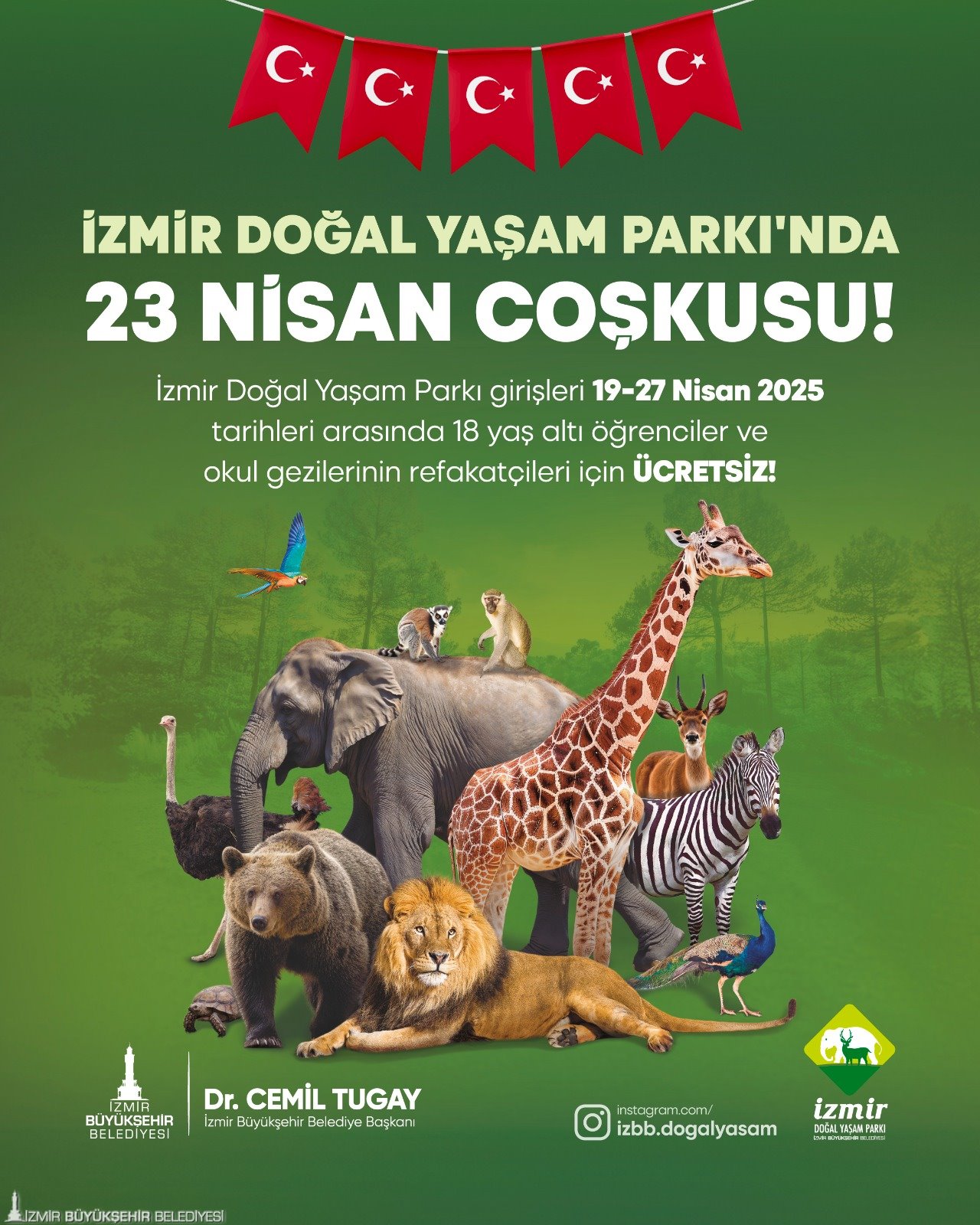 İzmir Doğal Yaşam Parkı’nda da 23 Nisan coşkusu yaşanacak. Doğal Yaşam Parkı’nın girişleri 19-27 Nisan tarihlerinde 18 yaş altı öğrenciler ve okul gezilerinin refakatçileri için ücretsiz olacak.