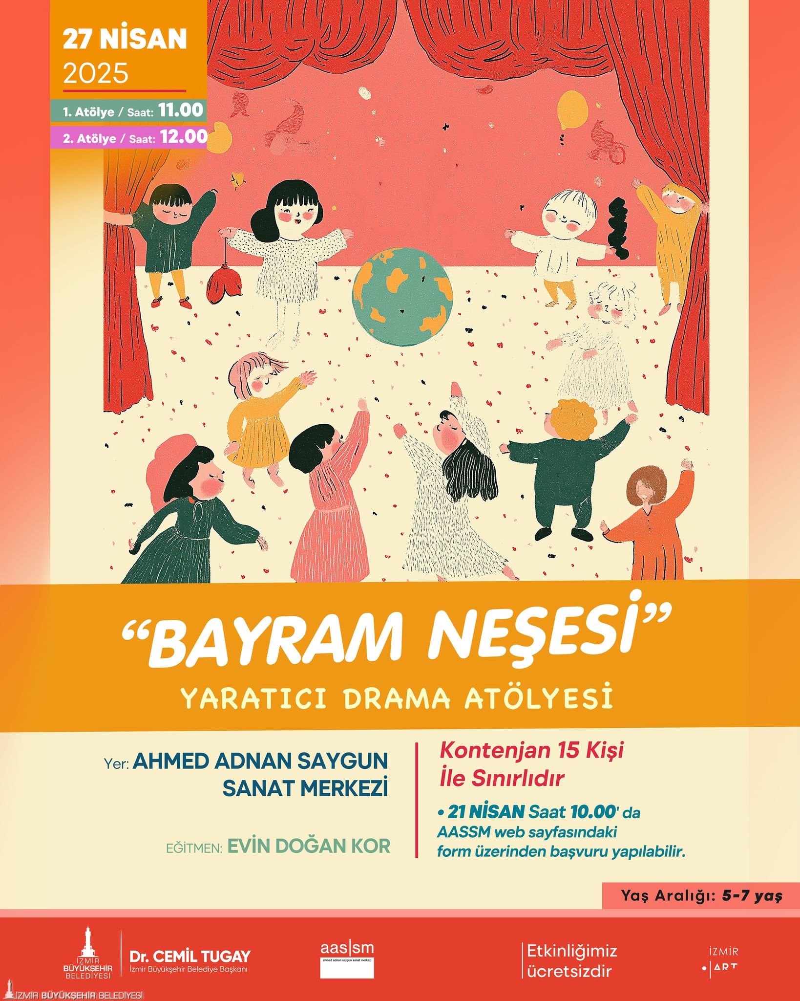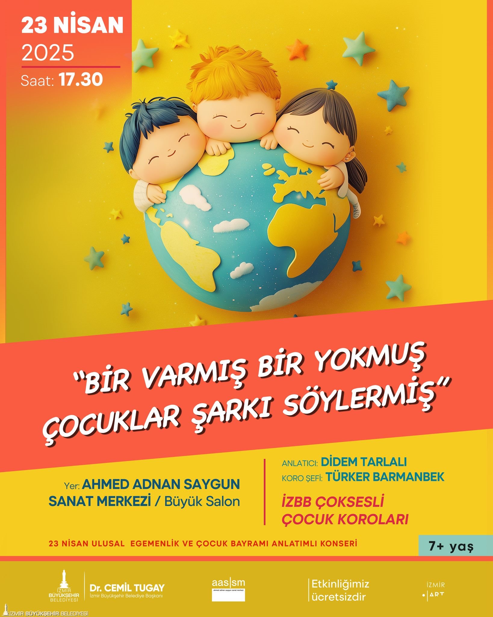 İzmir Büyükşehir Belediyesi Ahmed Adnan Saygun Sanat Merkezi (AASSM) tarafından tasarlanan “Bir Varmış Bir Yokmuş, Çocuklar Söylermiş” isimli anlatımlı konser, 23 Nisan Çarşamba günü 17.30’da çocukların umut, barış, sevgi ve hoşgörü dolu dünyasını sanatla buluşturacak. AASSM’de 27 Nisan günü ise “Bayram Neşesi” adlı yaratıcı drama atölyesi de var. Saat 11.00 ve 12.00’de iki ayrı seans şeklinde yapılacak ücretsiz atölye, 5-7 yaş arası 15 çocuk ile sınırlı olacak. Katılım için 21 Nisan saat 10.00’da AASSM web sayfasındaki form üzerinden başvuruda bulunulabilecek.