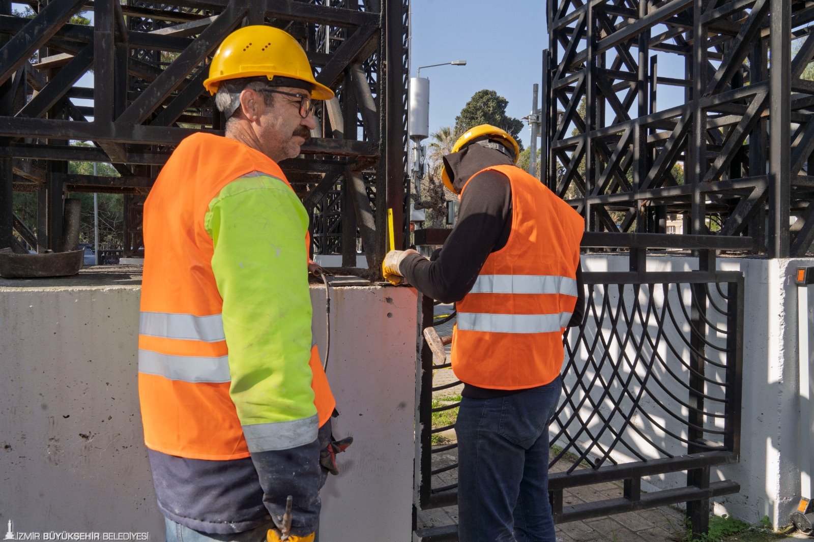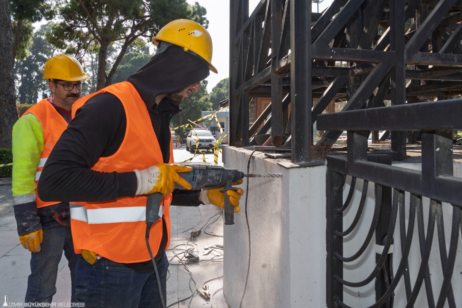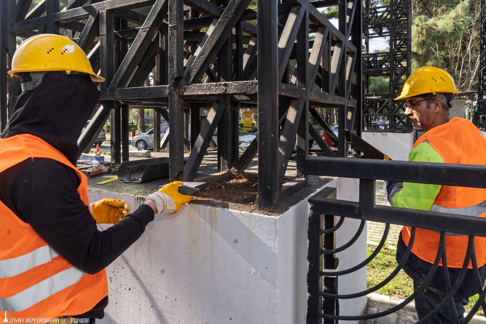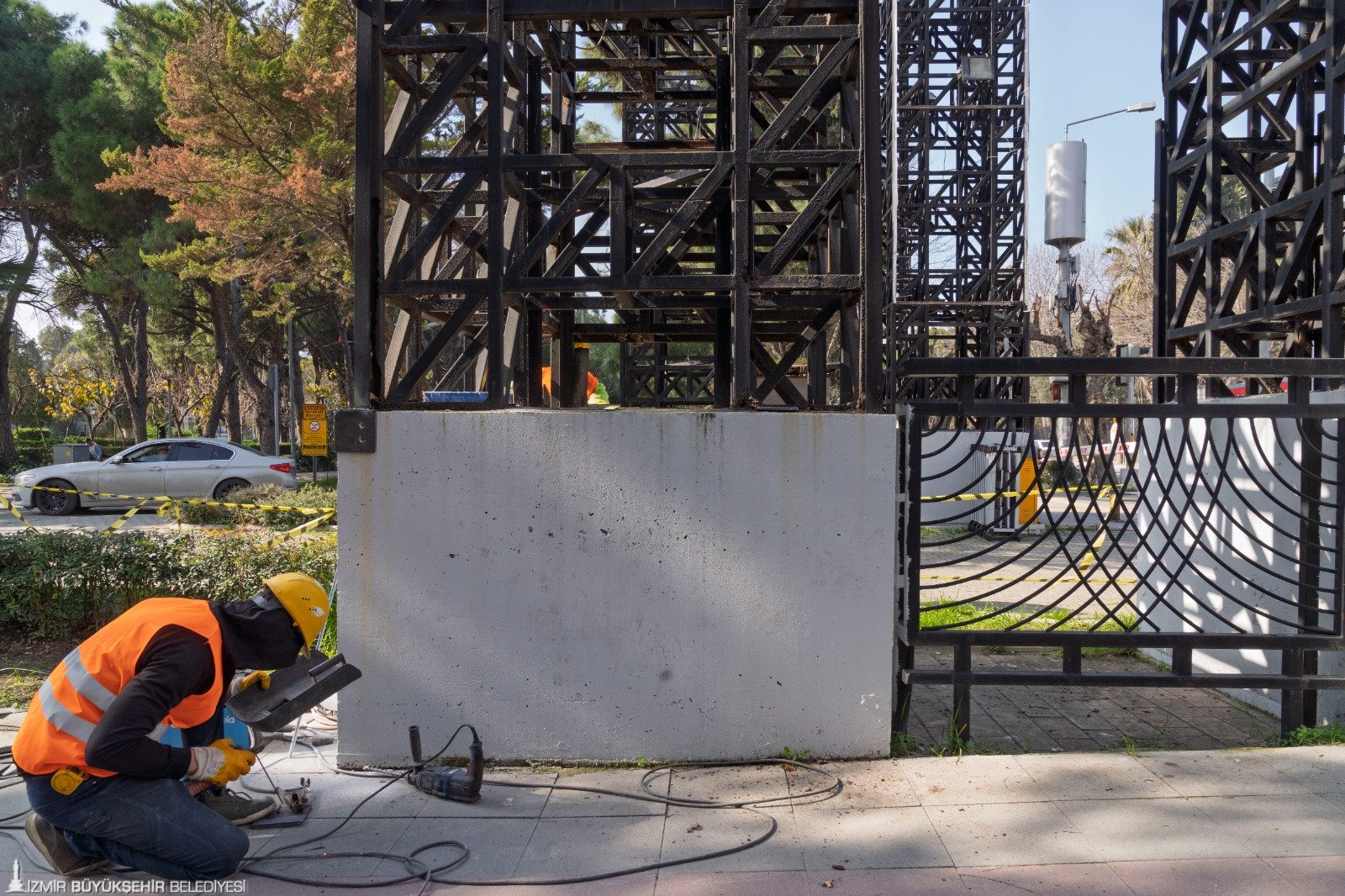 İzmir Büyükşehir Belediyesi, Kültürpark’ın tarihi kapılarından 26 Ağustos Kapısı’nda güçlendirme çalışmasına başladı. Yapı İşleri Dairesi Başkanlığı ekipleri uzun yıllardır kente hizmet veren ve hava koşulları gibi çeşitli nedenlerle yıpranan tarihi kapının çelik aksamını güçlendirecek. Çalışmaların bir hafta içinde tamamlanması planlanıyor.