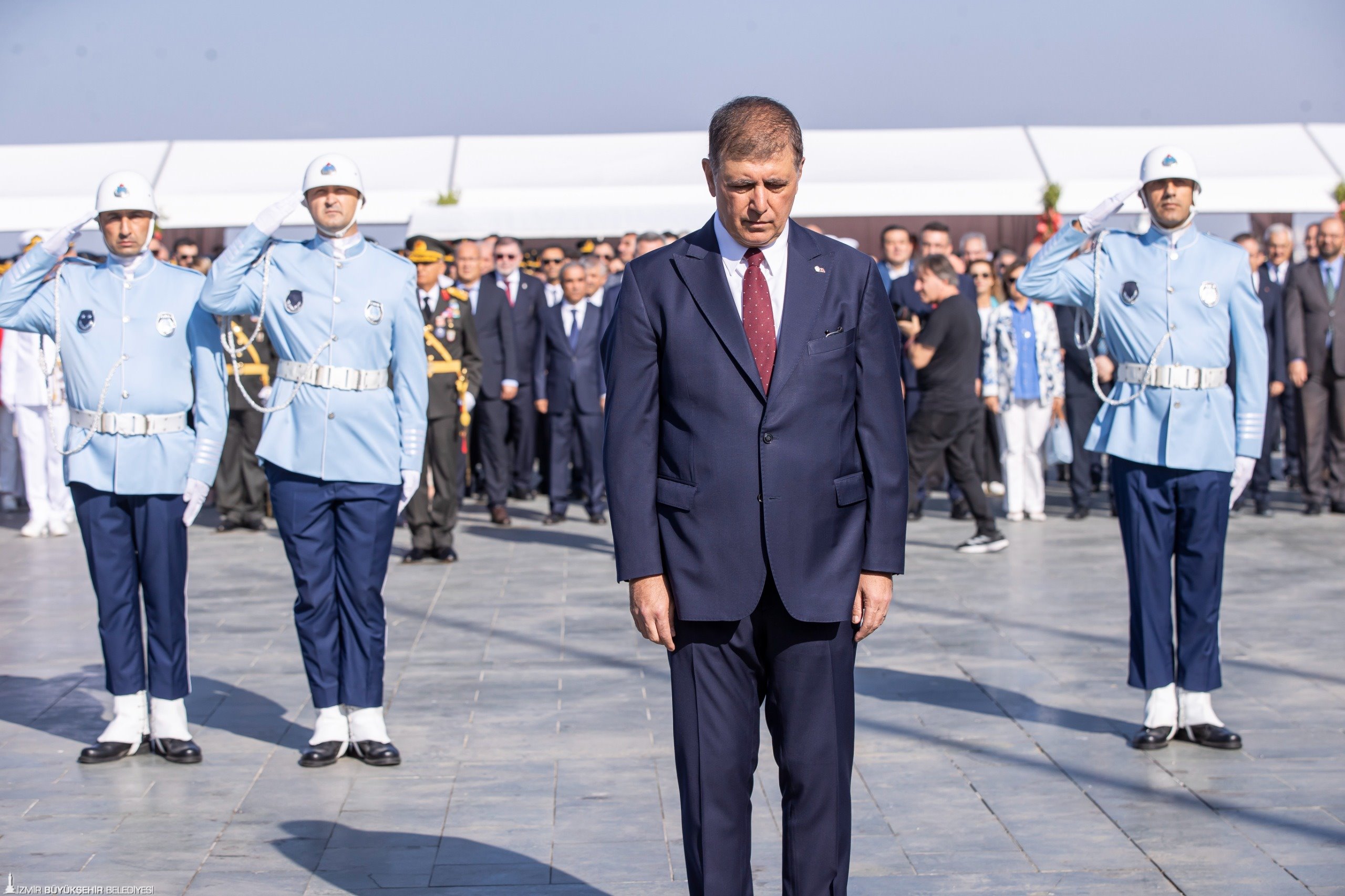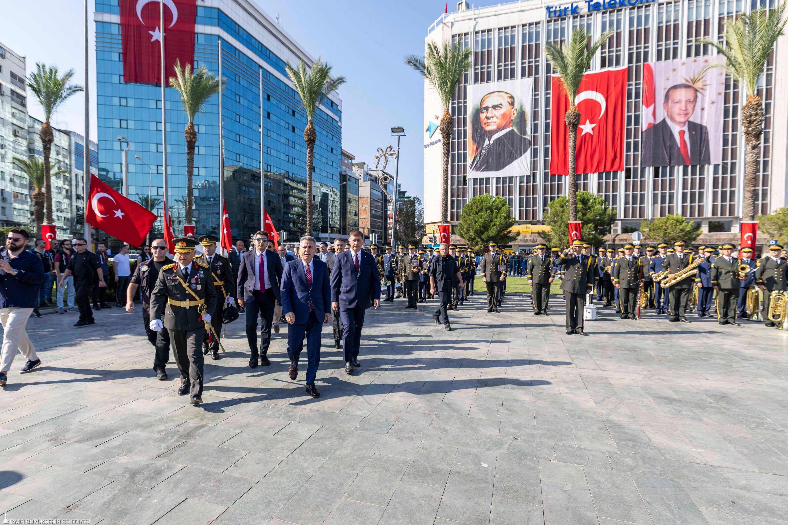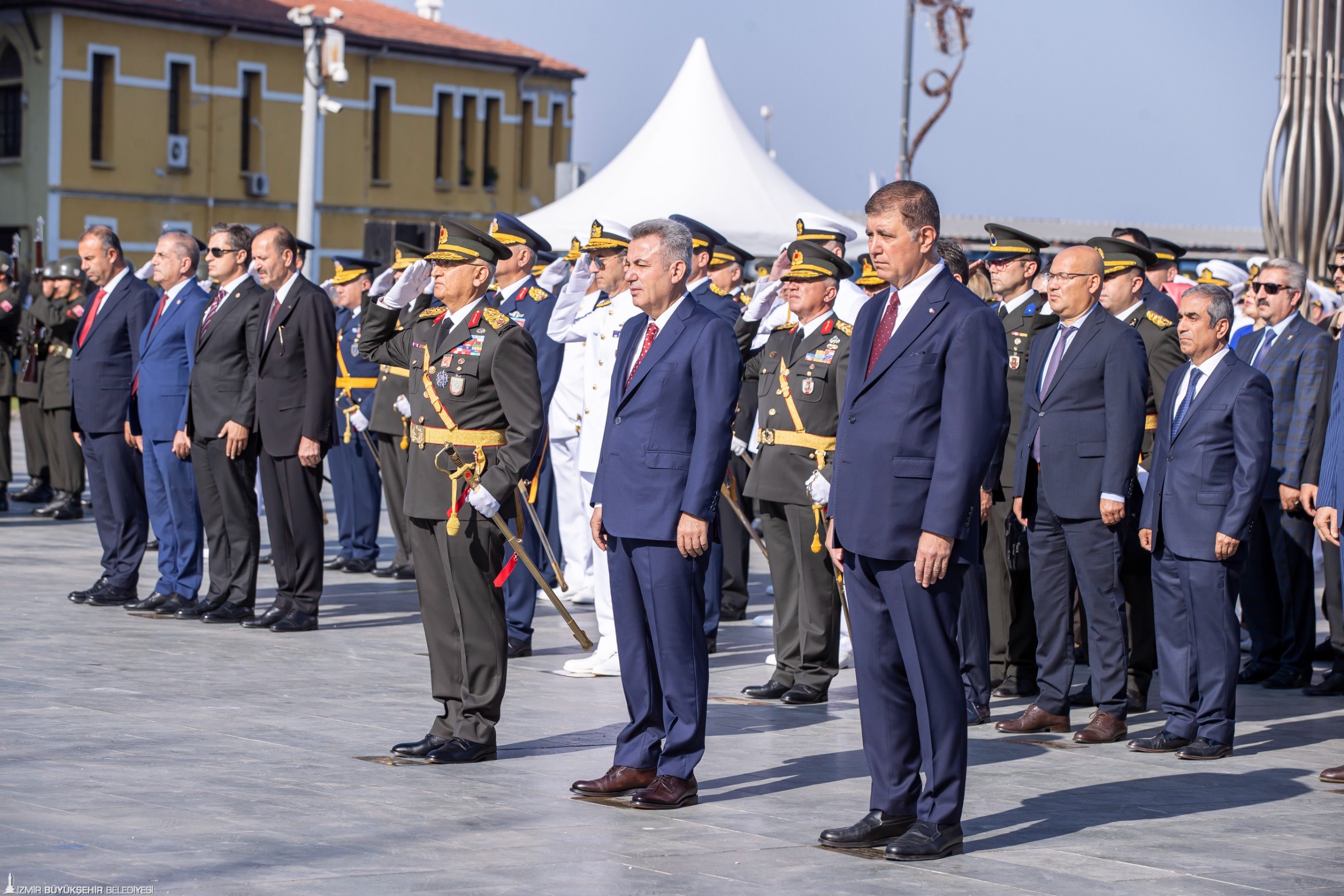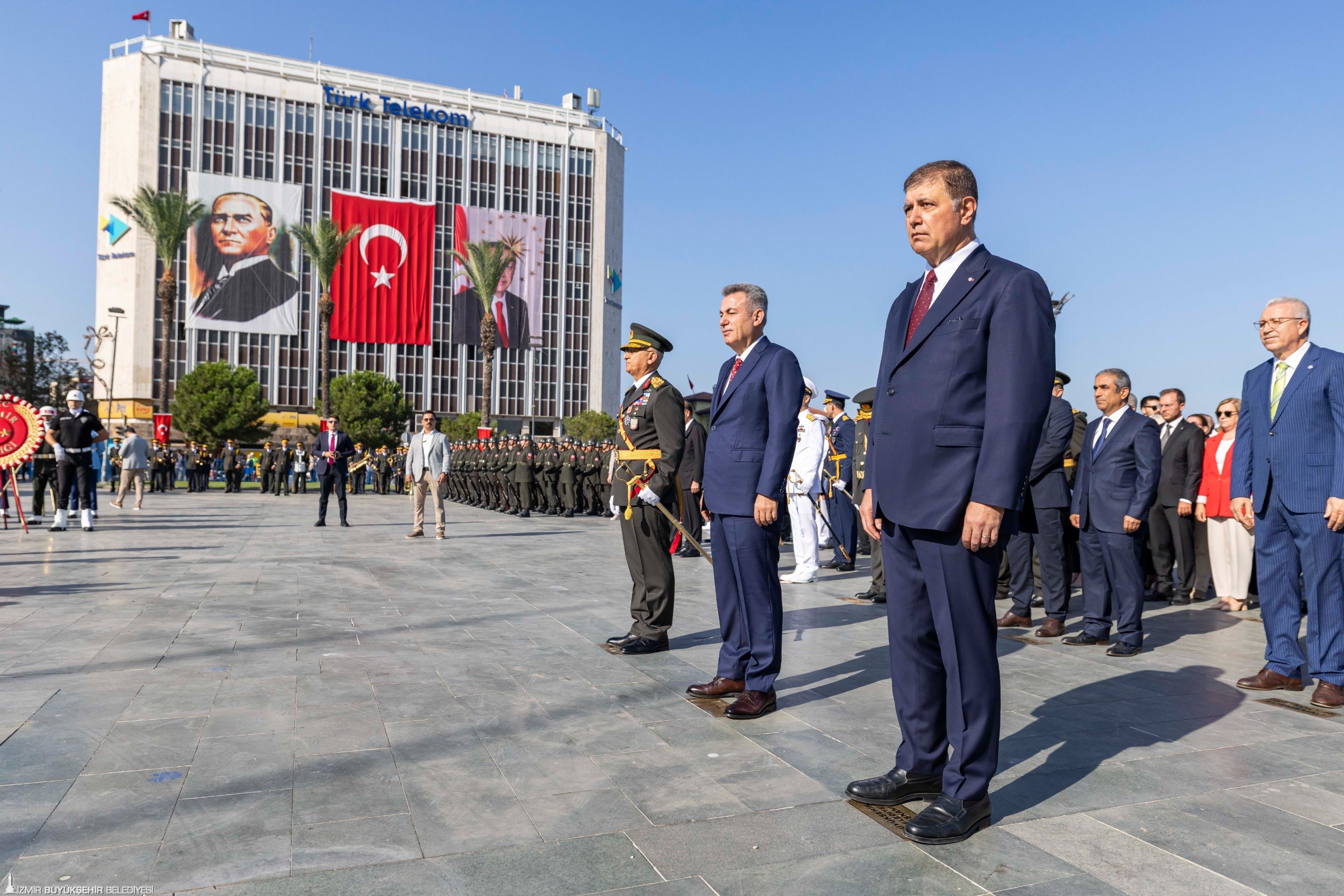 30 Ağustos Zafer Bayramı kutlamaları Cumhuriyet Meydanı'ndaki resmi törenle başladı. Törene İzmir Büyükşehir Belediye Başkanı Dr. Cemil Tugay, Ege Ordusu ve Garnizon Komutanı Orgeneral İrfan Özsert, İzmir Valisi Dr. Süleyman Elban, CHP Genel Başkan Yardımcısı ve Parti Sözcüsü İzmir Milletvekili Deniz Yücel, CHP İzmir Milletvekili Ednan Arslan, MHP İzmir Milletvekili Tamer Osmanağaoğlu, İYİ Parti İzmir Milletvekili Hüsmen Kırkpınar ile sivil toplum örgütlerinin temsilcileri, üniversite rektörleri katıldı. Tören, Cumhuriyet Meydanı’nda bulunan Atatürk Anıtı'na çelenk sunulması ve saygı duruşundan sonra İstiklal Marşı'nın okunmasıyla devam etti.