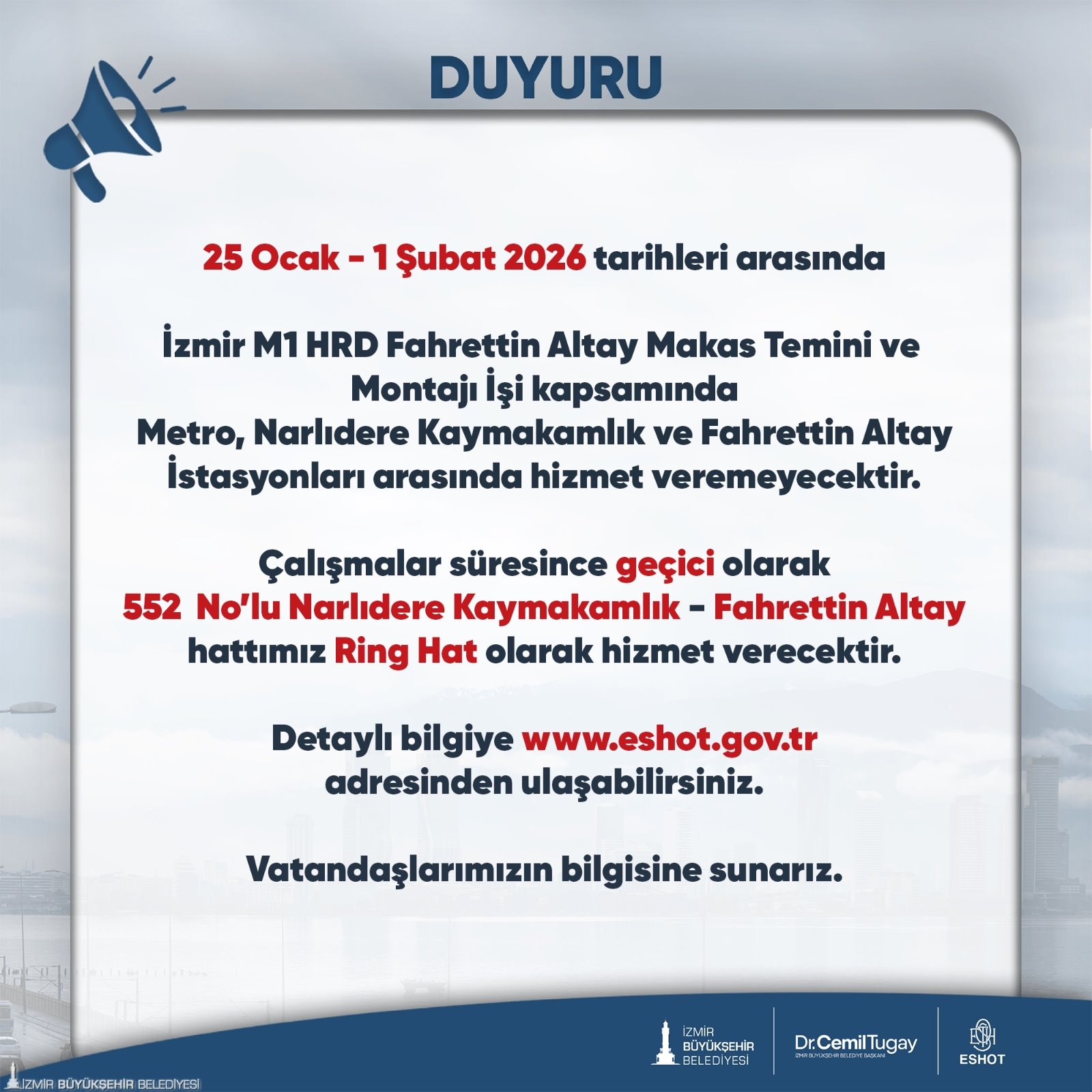 İzmir Metrosu’nda güvenliği artırmak amacıyla Fahrettin Altay İstasyonu’ndaki dört demiryolu makası yenilenecek. 25 Ocak Pazar günü başlayacak çalışmalar nedeniyle Fahrettin Altay ile Narlıdere Kaymakamlık istasyonları arasında metro seferleri geçici olarak durdurulacak. Makas değişim çalışmalarının 2 Şubat’a kadar tamamlanması planlanıyor. Bu süre içinde ulaşımın aksamaması amacıyla ESHOT 552 numaralı ring hattı hizmete alınacak. 25 Ocak-1 Şubat tarihleri arasında Fahrettin Altay ile Narlıdere Kaymakamlık arasında çalışacak hatta; hafta sonu ilk sefer 06.00’da, hafta içi 05.45’te başlayacak ve son sefer 00.00’da gerçekleşecek.