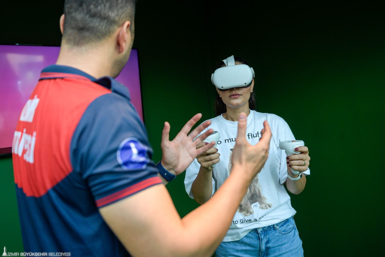 İzmir Büyükşehir Belediyesi İtfaiye Dairesi Başkanlığı Eğitim Şube Müdürlüğü’nde eğitmen olarak görev yapan İlker Şirin, yurttaşları yangınlara karşı bilinçlendirmek ve yangın anında nasıl müdahale edeceklerini öğretmek için bu çalışmaları yürüttüklerini söyledi. İlker Şirin, “Katılımcılar için üç senaryo hazırlandı. Sanal gerçeklik gözlüğü takarak mutfak, elektrik panosu ve ofis yangınlarından birine müdahale ediyorlar. Simülasyonda seçilen senaryo gereği, kullanıcılar kendini bir anda yangının çok yakınında buluyor. Elindeki sanal gözlüklerin elcikleri ile simülasyon içerisinde yangına müdahaleye başlıyorlar. Bu oyundaki amaç yangını hızlı ve etkili şekilde söndürmek. Biz de katılımcıların yangın sırasında ve sonrasında nasıl davrandıklarını gözlemliyoruz. Onların gerçek hayatta karşılaşacakları yangınlara karşı doğru tekniklerle müdahalenin nasıl olacağını anlatıyoruz. Böylece itfaiye olay yerine varana kadar hem kendi güvenliklerini hem de çevre güvenliğini sağlayabiliyorlar” dedi.