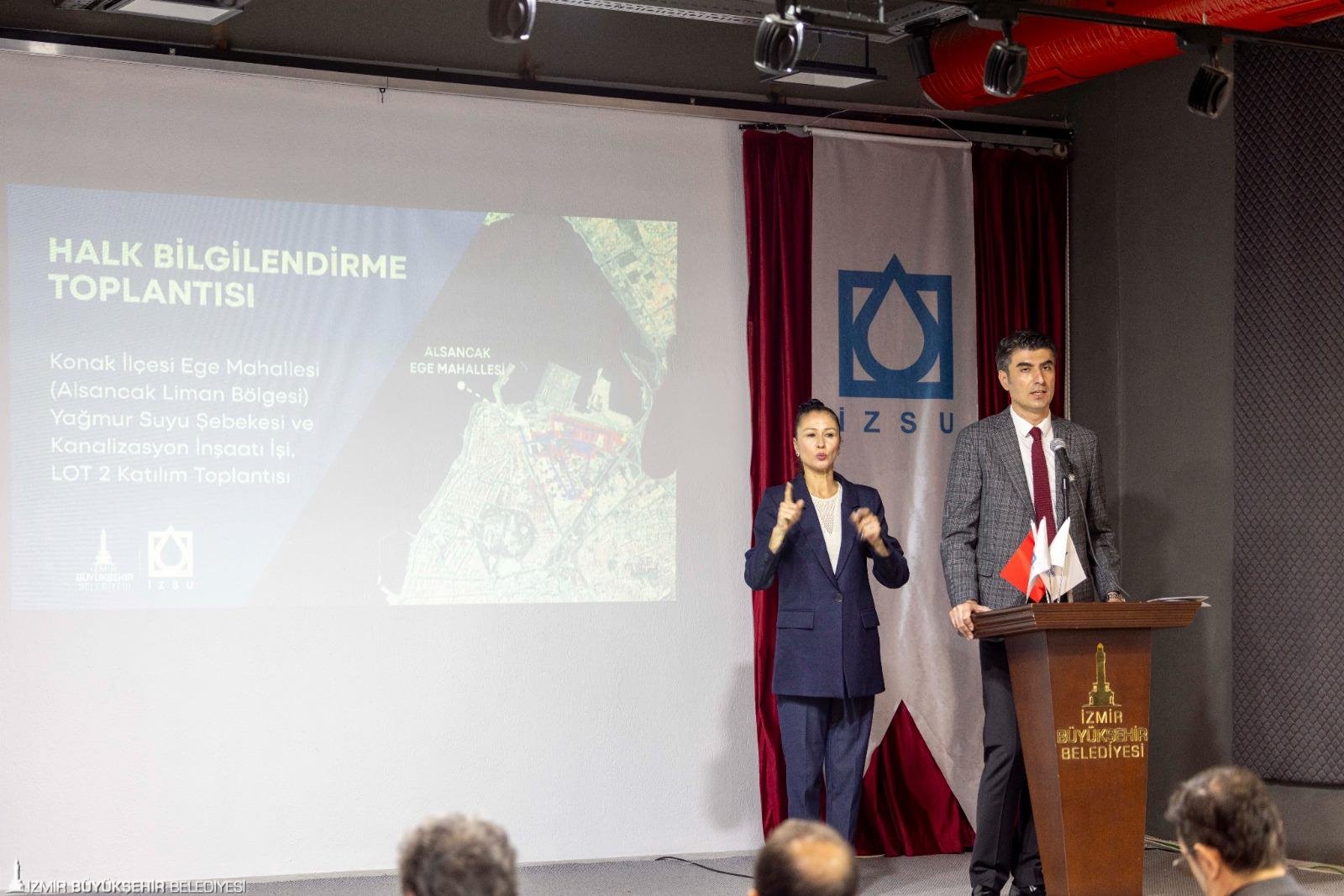 İzmir Büyükşehir Belediyesi İZSU Genel Müdürlüğü tarafından gerçekleştirilecek tarihi alt yapı yatırımlarından “Konak İlçesi Ege Mahallesi (Alsancak Liman Bölgesi) Yağmur Suyu Şebekesi ve Kanalizasyon İnşaatı Projesi” bölge sakinleri ve muhtarlara tanıtıldı. Uluslararası Basın Merkezi’nde düzenlenen toplantıya İZSU Genel Müdürü Gürkan Erdoğan ile İZSU Genel Müdür Yardımcıları, bürokratlar, muhtarlar, sivil toplum örgütlerinin, meslek odalarının temsilcileri ile yurttaşlar katıldı. Bir saat süren toplantıda inşaat aşamasının detayları, çevresel ve sosyal etkiler ile alınacak önlemler aktarıldı. Türkiye Deprem, Sel ve Yangın Acil İmar Projesi (TEFWER) kapsamında yapılacak proje ile bölgedeki sel ve taşkın riski ortadan kalkacak. Ayrıca gökdelenlerin inşa edildiği yeni yapılaşma alanı olan bölgede ihtiyaç duyulan kanalizasyon altyapısı inşa edilecek.