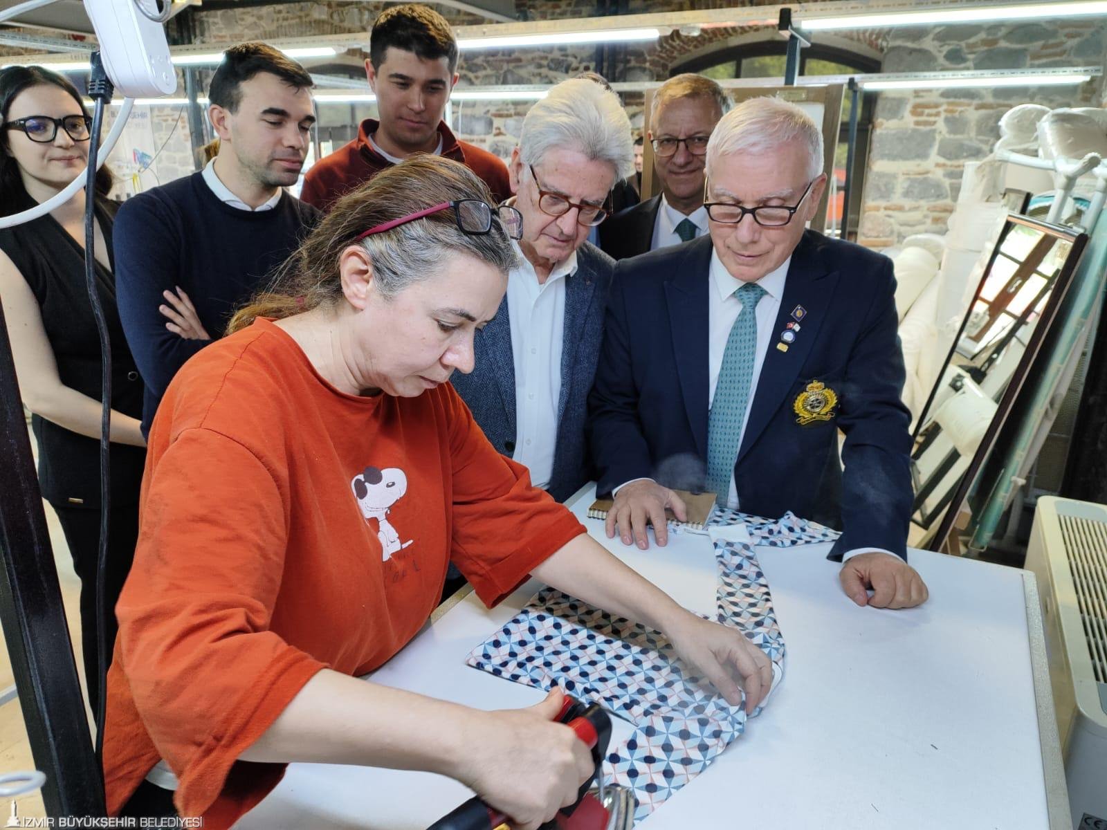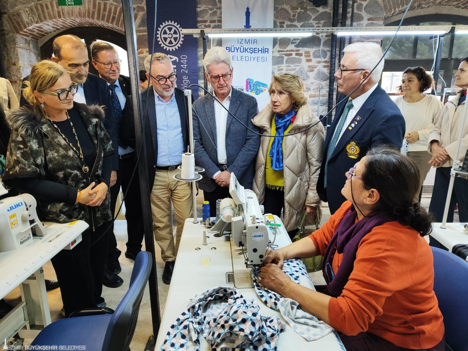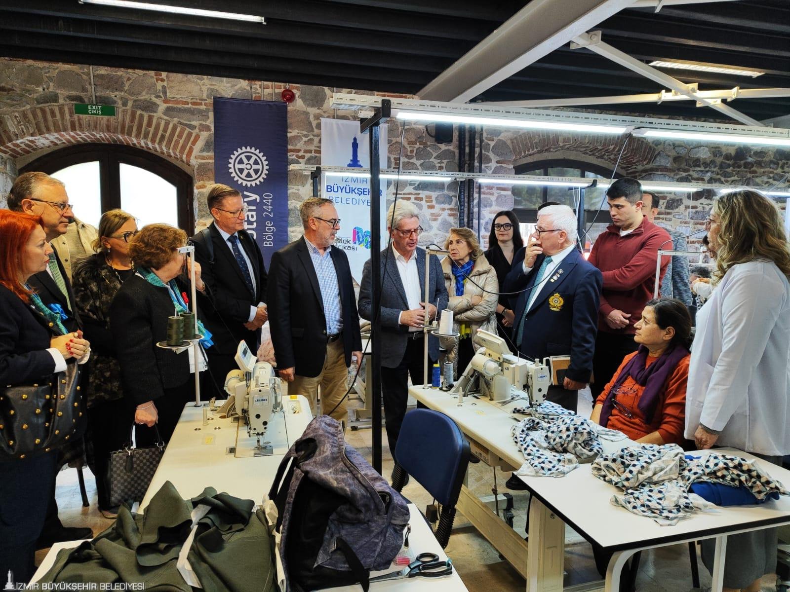 İzmir Büyükşehir Belediyesi’nin, İzmir’de yaşayan ve dikişe ilgi duyan kadınların mesleki becerilerini geliştirmelerini ve hazır giyim sektöründe ihtiyaç duyulan nitelikli iş gücüne katılmalarını amaçlayan Altın İğne Projesi, uluslararası düzeyde de dikkat çekiyor. Uluslararası Rotary Dünya Başkanı Francesco Arezzo, İzmir ziyaretinde Meslek Fabrikası Halkapınar Kurs Merkezi’nde proje kapsamında yürütülen eğitim çalışmalarını inceledi. Ziyarete İzmir Büyükşehir Belediyesi Başkan Vekili Dr. Zafer Levent Yıldır, Genel Sekreter Yardımcısı Prof. Dr. Pınar Okyay, belediye yöneticileri, Rotary temsilcileri ve proje paydaşları katıldı. Atölyeler gezildi, kursiyer kadınlarla bir araya gelinerek yürütülen çalışmalar hakkında bilgi alındı.