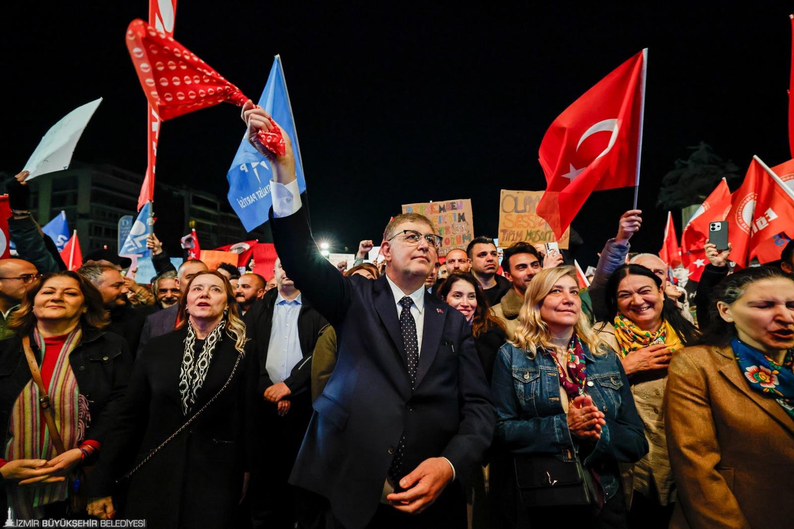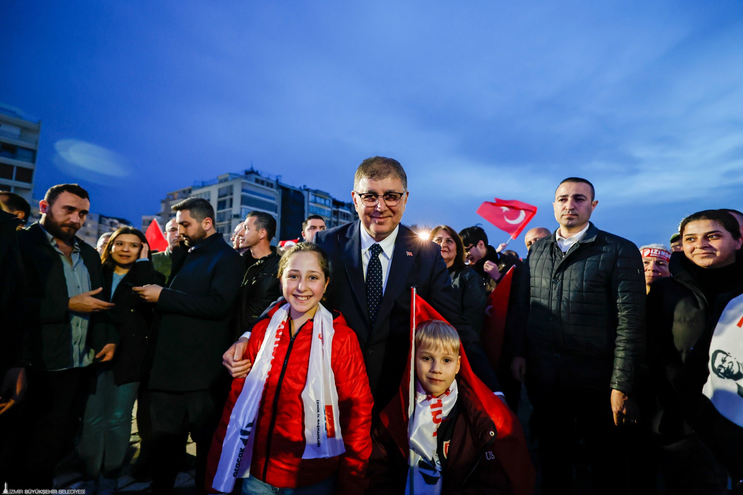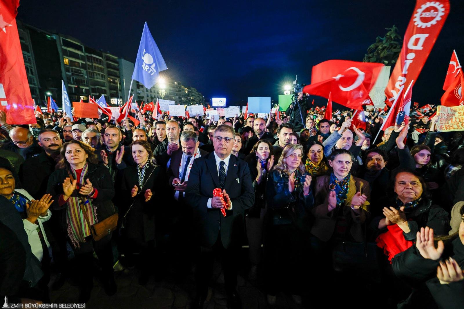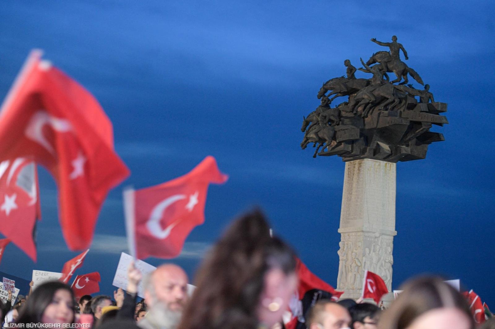 İstanbul Büyükşehir Belediye Başkanı Ekrem İmamoğlu’nun tutuklanmasının ardından tüm yurtta protestolar sürerken, İzmir’de de binlerce yurttaşın katılımıyla Adalet Buluşması düzenlenmeye devam ediliyor. Gündoğdu Meydanı’nda yapılan buluşmaya, İzmirli yurttaşar ellerinde Türk bayrağı ve dövizlerle katıldı. İzmirlilerle bir araya gelerek gençlere seslenen İzmir Büyükşehir Belediye Başkanı Dr. Cemil Tugay, “Gazi Mustafa Kemal Atatürk’ün bize bıraktığı emanetine ve haklarımıza sonuna kadar sahip çıkmaya devam edeceğim. Her türlü mücadeleyi kendi adıma yapacağım ama hiçbir gencimizin incinmesini, üzülmesini istemiyorum” diye konuştu.