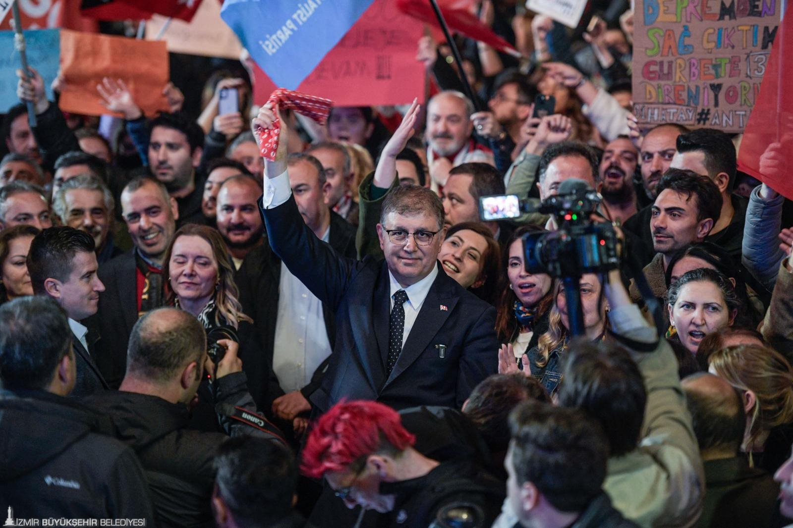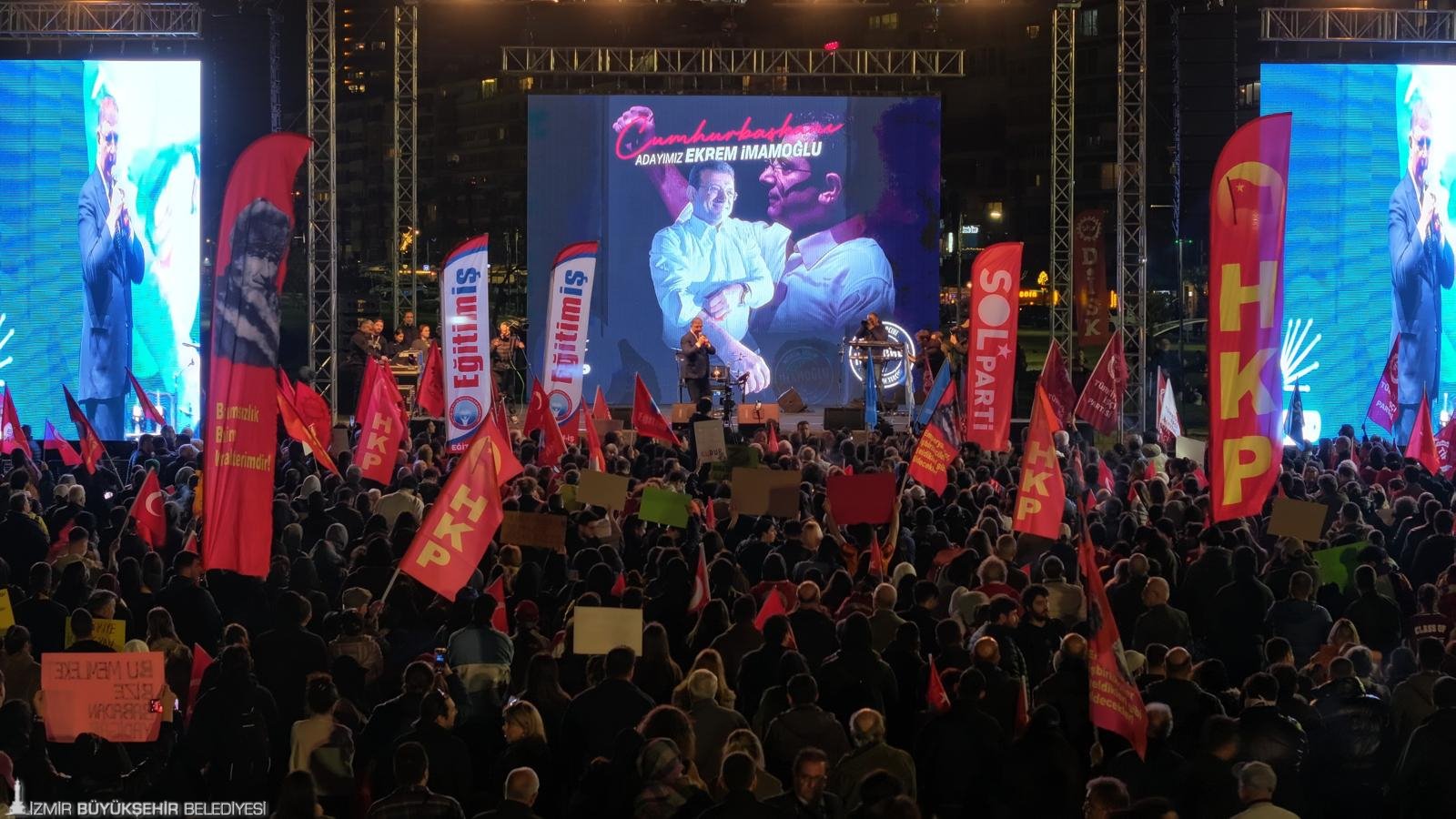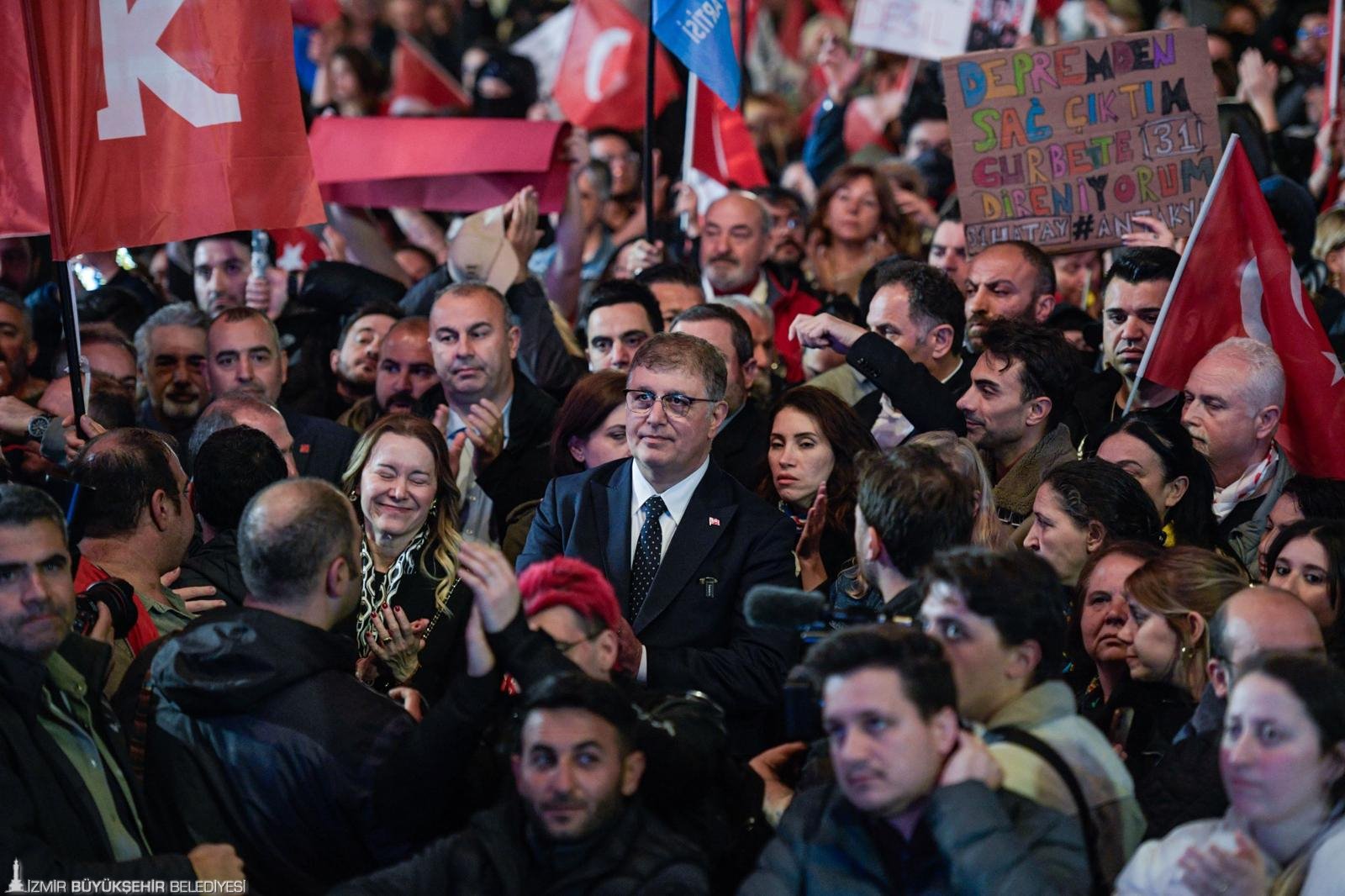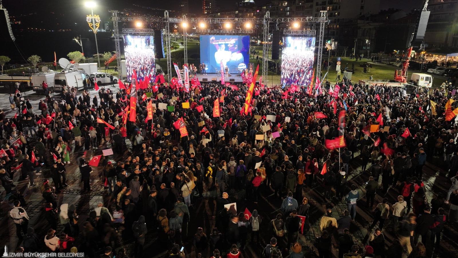 İstanbul Büyükşehir Belediye Başkanı Ekrem İmamoğlu’nun tutuklanmasının ardından tüm yurtta protestolar sürerken, İzmir’de de binlerce yurttaşın katılımıyla Adalet Buluşması düzenlenmeye devam ediliyor. Gündoğdu Meydanı’nda yapılan buluşmaya, İzmirli yurttaşar ellerinde Türk bayrağı ve dövizlerle katıldı. İzmirlilerle bir araya gelerek gençlere seslenen İzmir Büyükşehir Belediye Başkanı Dr. Cemil Tugay, “Gazi Mustafa Kemal Atatürk’ün bize bıraktığı emanetine ve haklarımıza sonuna kadar sahip çıkmaya devam edeceğim. Her türlü mücadeleyi kendi adıma yapacağım ama hiçbir gencimizin incinmesini, üzülmesini istemiyorum” diye konuştu.