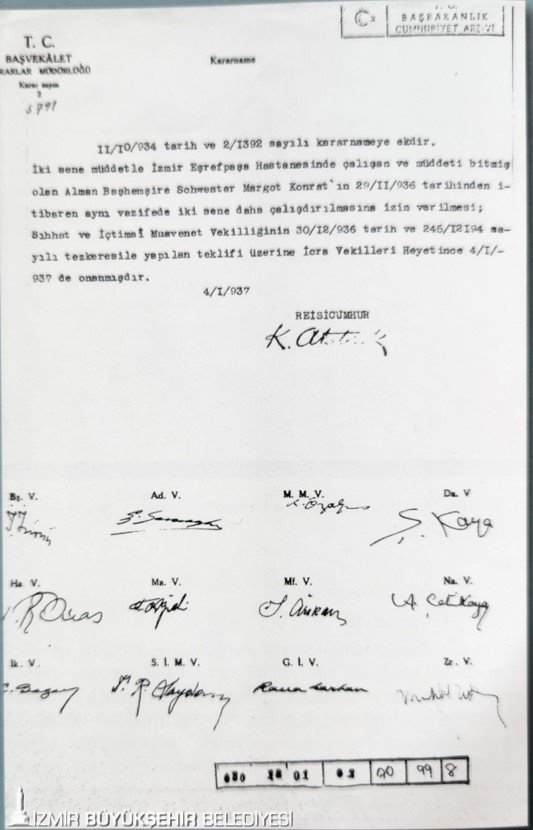 İzmir Büyükşehir Belediye Başkanı Dr. Cemil Tugay, 14 Mart Tıp Bayramı’nda İzmir Büyükşehir Belediyesi Eşrefpaşa Hastanesi’ni ziyaret etti. Hastanede görev alan hekim ve sağlık çalışanlarının bayramlarını kutlayan Başkan Tugay, hastaneye sağlık hizmeti almak için gelen yurttaşlarla da sohbet etti. Ziyarette Yuvamız İzmir’e kayıtlı minikler de yer aldı. Hastanenin ambulansında acil tıp ile ilgili bilgiler alan çocuklar, aynı zamanda bir hekim olan Başkan Tugay’a çiçek takdim etti. Ziyaretin en duygulandıran anı ise Başhekim Doç. Dr. Başak Bayram tarafından Başkan Tugay’a verilen hediye oldu. İki sene boyunca Eşrefpaşa Hastanesi’nde görev alan Alman hemşire Margot Konrat’ın çalışma izninin uzatılmasına ilişkin 1934 ve 1937 tarihli ve dönemin Cumhurbaşkanı Mustafa Kemal Atatürk imzalı iki belge, Başkan Tugay’a takdim edildi.