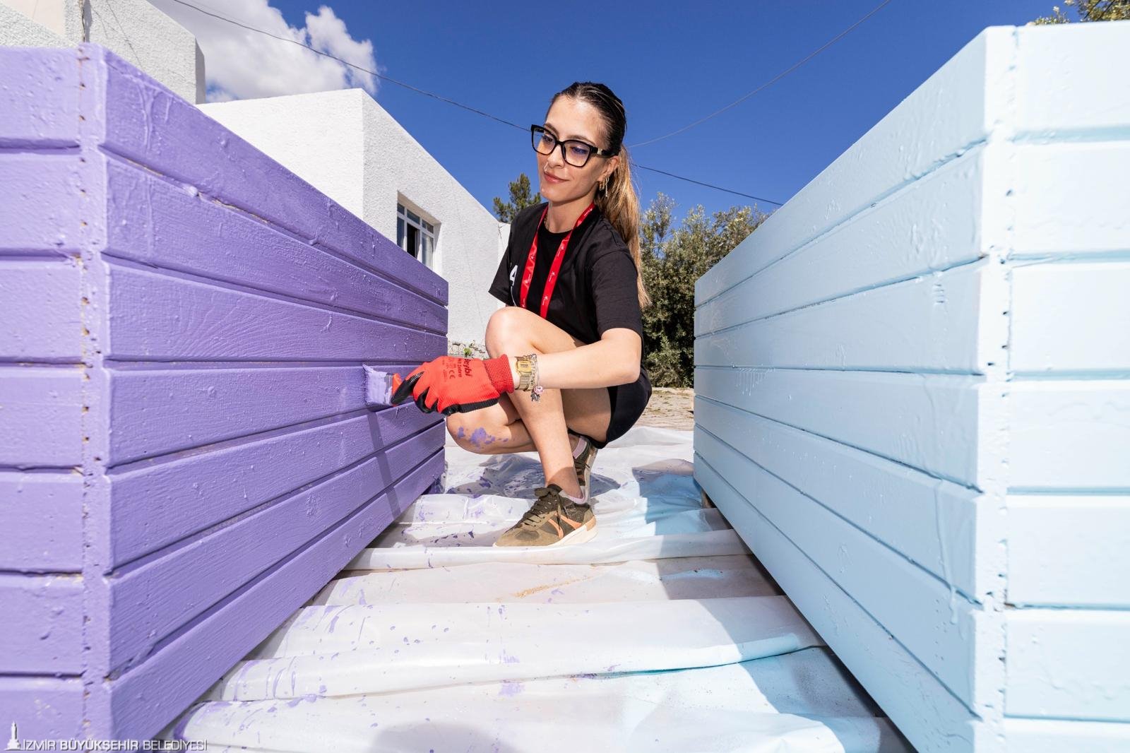 Çalışmalar hakkında bilgi veren Güzel İzmir Hareketi Koordinatörü Esra Yılmaz Keskin, “İzmir Büyükşehir Belediyesi öncülüğünde Tasarımcılar İzmir’de Gençlik Kampı’ndayız. 16 – 19 Mayıs tarihleri arasında bu çalışmayı 4 ilçede gerçekleştiriyoruz. Kıyı Köşe Programı kapsamında 4 ilçemizde tasarım alanları belirlendi. Bir gün tasarım, ikinci gün uygulama şeklinde birlikte tasarlıyoruz, birlikte uyguluyoruz. Katılımcı tasarım anlayışıyla genç tasarımcılar, dün tasarladıkları ürünleri bugün burada yerinde uygulama yapıyorlar. Kendi belirledikleri tasarım kararları çerçevesinde Alaçatı’nın yel değirmeninden esinlenerek yerde bir yel değirmeni tasarımı boyamak istediler. İzmir Büyükşehir Belediyesi’nin ve ilçe belediyelerin atölyelerinde bulunan ürünleri kullanarak neler yaratabiliriz düşüncesinden çıktı bu tasarımlar. Örneğin paletlerle bir oturma birimleri, peyzaj elemanları tasarladılar. Hayvan dostlarımız için kedi evi tasarladılar onu üretiyorlar. Bu şekilde genç tasarımcıların tasarladıkları ürünlerin yerinde uygulaması yapılıyor” şeklinde konuştu.