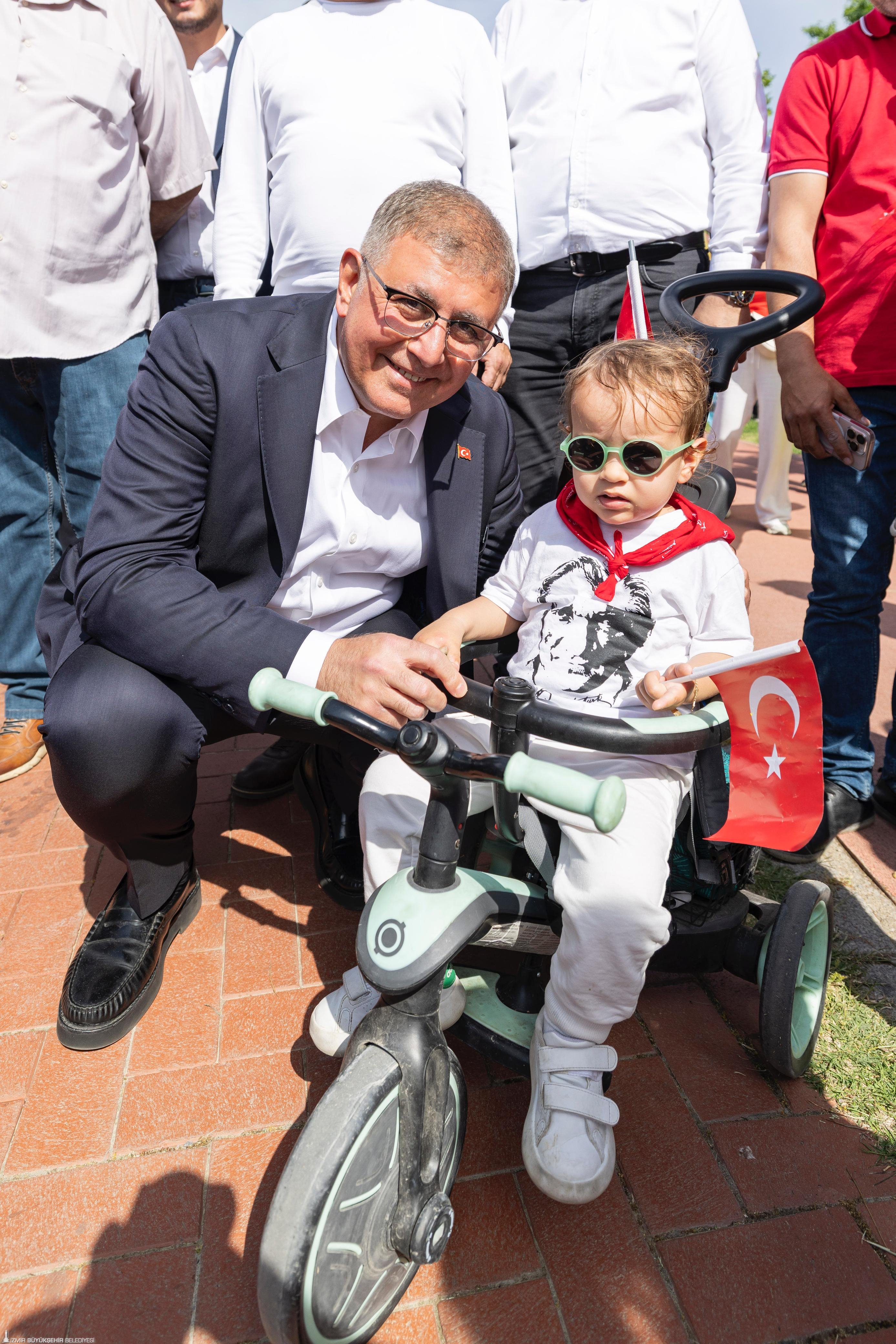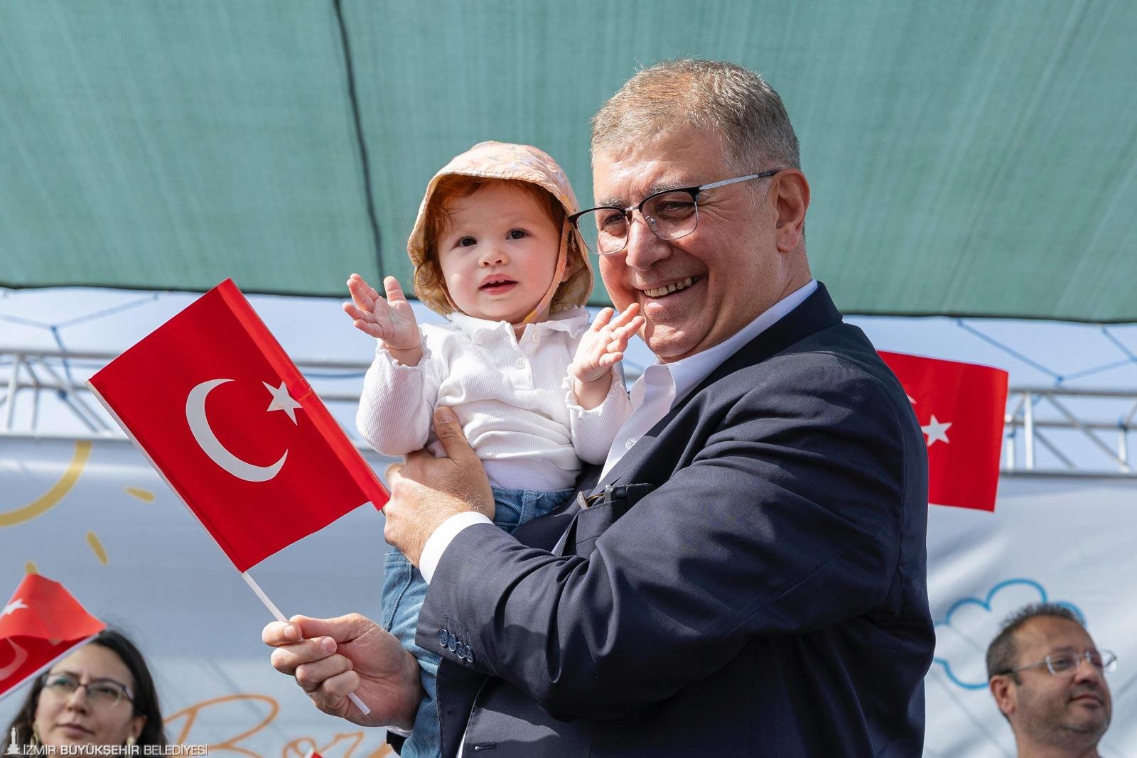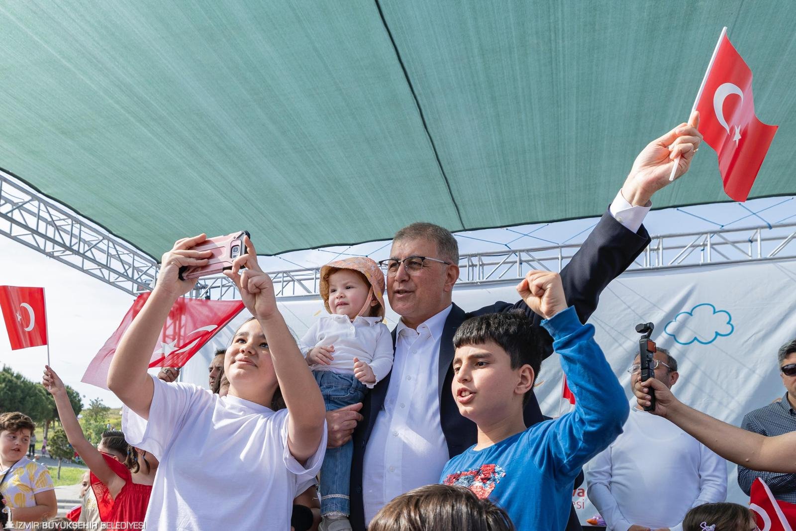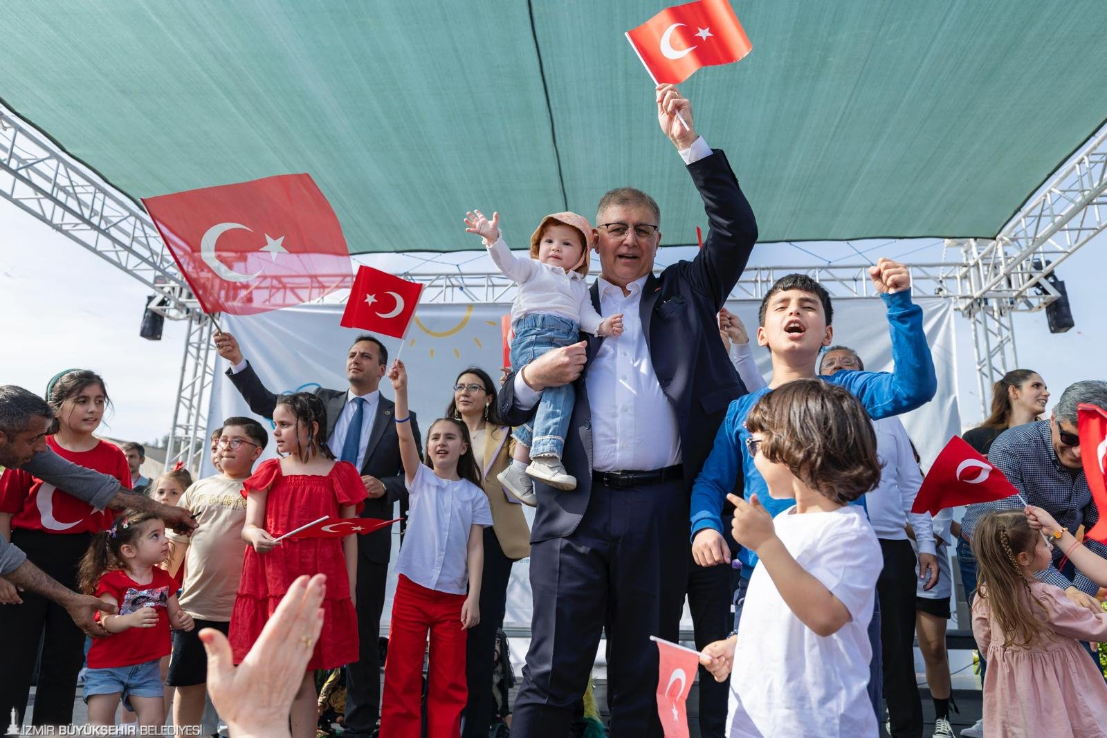 23 Nisan Ulusal Egemenlik ve Çocuk Bayramı’nı kutlayan Başkan Tugay, "Sevgili çocuklar ve sevgili aileleri; bu özel günde sizlerle olmanın büyük mutluluğu içinde hepinizin bayramını yürekten kutluyorum. Bugün sabahtan bu yana İzmir'in farklı yerlerinde çocuklarımızla birlikte olmaya çalıştım. Binlerce çocuğumuzla sarıldık. Burada olduğu gibi hepsi göğüslerinde Türk bayrağı, Atatürk resimleri ile birlikte bizlere aslında bir mesaj veriyorlar. Bu mesajı özellikle büyüklerin, şu anda üzerinde sorumluluk olan herkesin alması gerektiğini düşünüyorum. Çocuklarımız ve gençlerimiz diyorlar ki 'Biz büyük ve asil bir milletin çocuklarıyız, evlatlarıyız. Bu ülkeye başını önüne eğmek, birilerine teslim olmak yakışmaz. Bize büyük, güçlü, refah bir ülkede adalet içinde özgürlüğümüzü yaşayarak, doyasıya çalışarak dünyanın en büyük ülkelerinden birinin vatandaşı olmak yaraşır.' Bunun için, çocuklarımız için çalışır mıyız? Bu mesajı almamız gereken bir gündeyiz” ifadelerini kullandı. Başkan Tugay, “Bugün güzel bir gün, bugün bayram, bugün çocuklarımız eğlensin, biz de onların mutluluğunu paylaşalım. Yürek yüreğe olalım. Hepinizi çok seviyoruz, bayramınız kutlu olsun” diyerek sözlerini tamamladı.