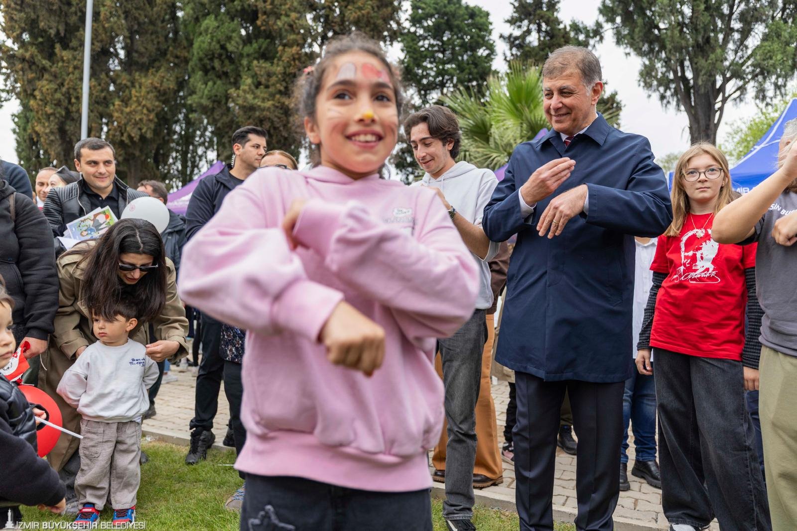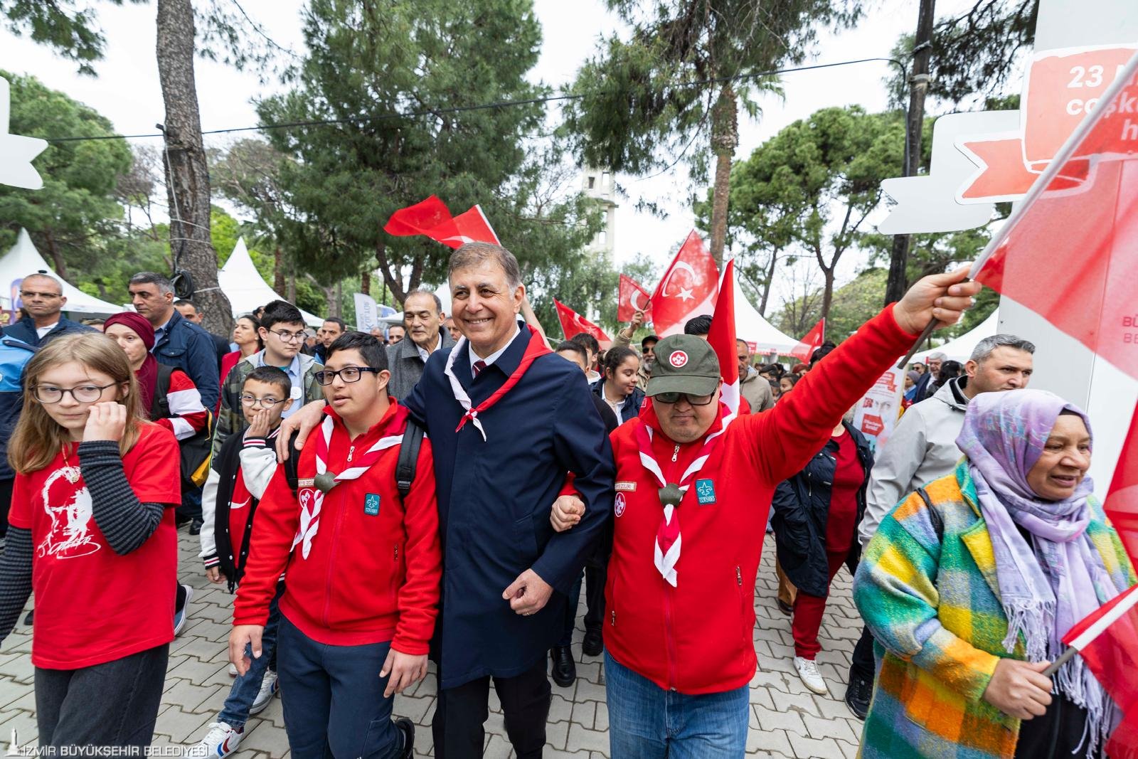 İzmir’de 23 Nisan Ulusal Egemenlik ve Çocuk Bayramı sabahın ilk saatlerinden itibaren coşkuyla kutlanıyor. İzmir Büyükşehir Belediyesi tarafından kentin dört bir yanında düzenlenen etkinlikler, Kültürpark’ta gerçekleştirilen programla taçlandı. Kültürpark’taki kutlamalar, İzmir Büyükşehir Belediye Başkanı Dr. Cemil Tugay’ın katıldığı kortej yürüyüşü ile başladı. Kaskatlı Havuz’dan bando eşliğinde etkinlik alanına kadar süren korteje çocuklar ve aileleri, ellerindeki Türk bayraklarıyla eşlik etti. Başkan Tugay, etkinlik alanına Melek İzciler adlı izci grubundan otizmli Ömercan Anamer ve Osman Türkekul ile birlikte girdi. Çocukların yoğun ilgisiyle karşılanan Tugay, kurulan stantları gezerek çocuklarla sık sık fotoğraf çektirdi.