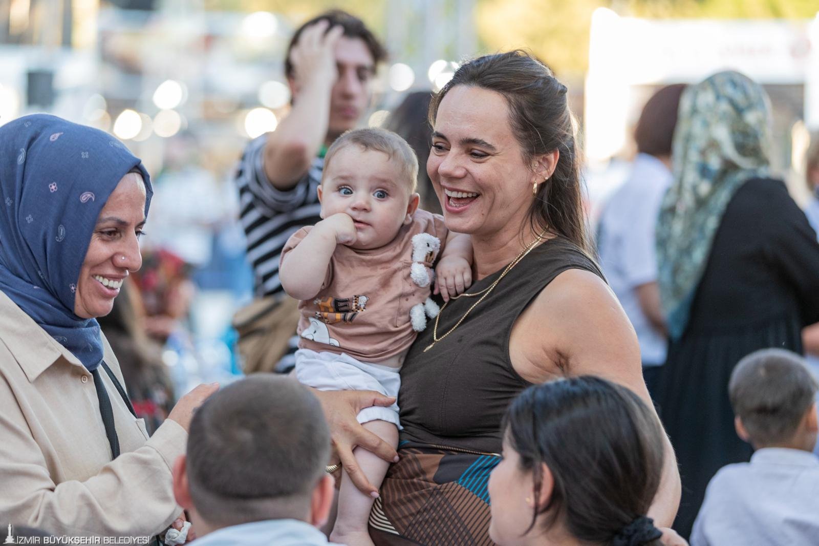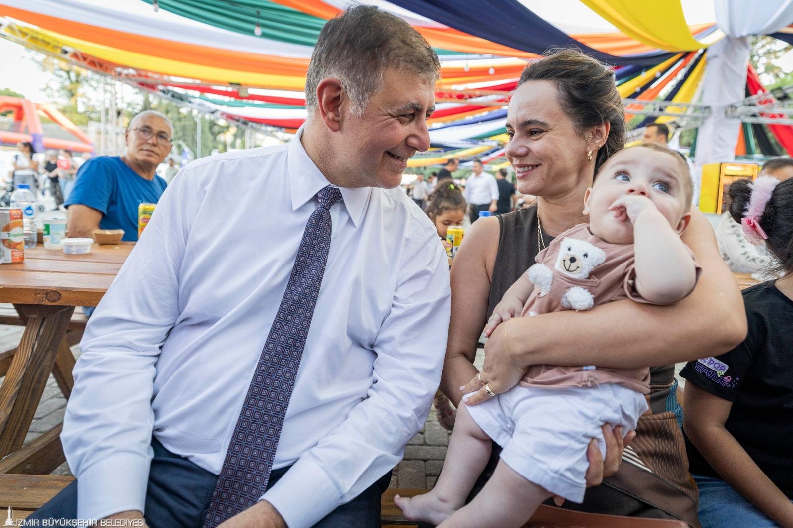 İzmir Büyükşehir Belediyesi, 94. İzmir Enternasyonal Fuarı’nda (İEF) İzmirli çocukları ağırlamaya devam ediyor. İEF’nin üçüncü gününde İzmir Büyükşehir Belediyesi Sosyal Hizmetler Dairesi Başkanlığı’nın Buca Göksu, Konak Ballıkuyu ve 1. Kadriye mahallelerinde bulunan Dayanışma Noktalarından hizmet alan anne ve farklı yaş gruplarından çocuklarla buluşan İzmir Büyükşehir Belediye Başkanı Dr. Cemil Tugay ve eşi Öznur Tugay yeniden çocuklarla bir araya geldi. Buca’nın Göksu Mahallesi ve Konak’ın Ballıkuyu Mahallesi’nde bulunan Dayanışma Noktalarından hizmet alan 16 anne ve farklı yaşlarda 39 çocukla yemek alanında buluşan Başkan Tugay, miniklerin taleplerini dinlerken, günün anısına hatıra fotoğrafı da çektirdi. İstedikleri yemekleri yiyen minikler Başkan Tugay’dan oyun parkı, spor sahası gibi isteklerde bulundu. Başkan Tugay da çocukların isteklerini memnuniyetle yerine getireceklerini söyledi. Konak ilçesinde 32 okul arasında düzenlenen İstiklal Marşı okuma yarışmasında birinci olan ilkokul öğrencisi 10 yaşındaki Şilan Yıldırım’ı tebrik eden Tugay, Şilan’ın mor bisiklet isteğini de geri çevirmedi ve kendisine hediye edeceklerini söyledi. Başkan Tugay ile eşi Öznur Tugay, 6 aylık Azim Elmastaşı da kucağına alarak sevdi.