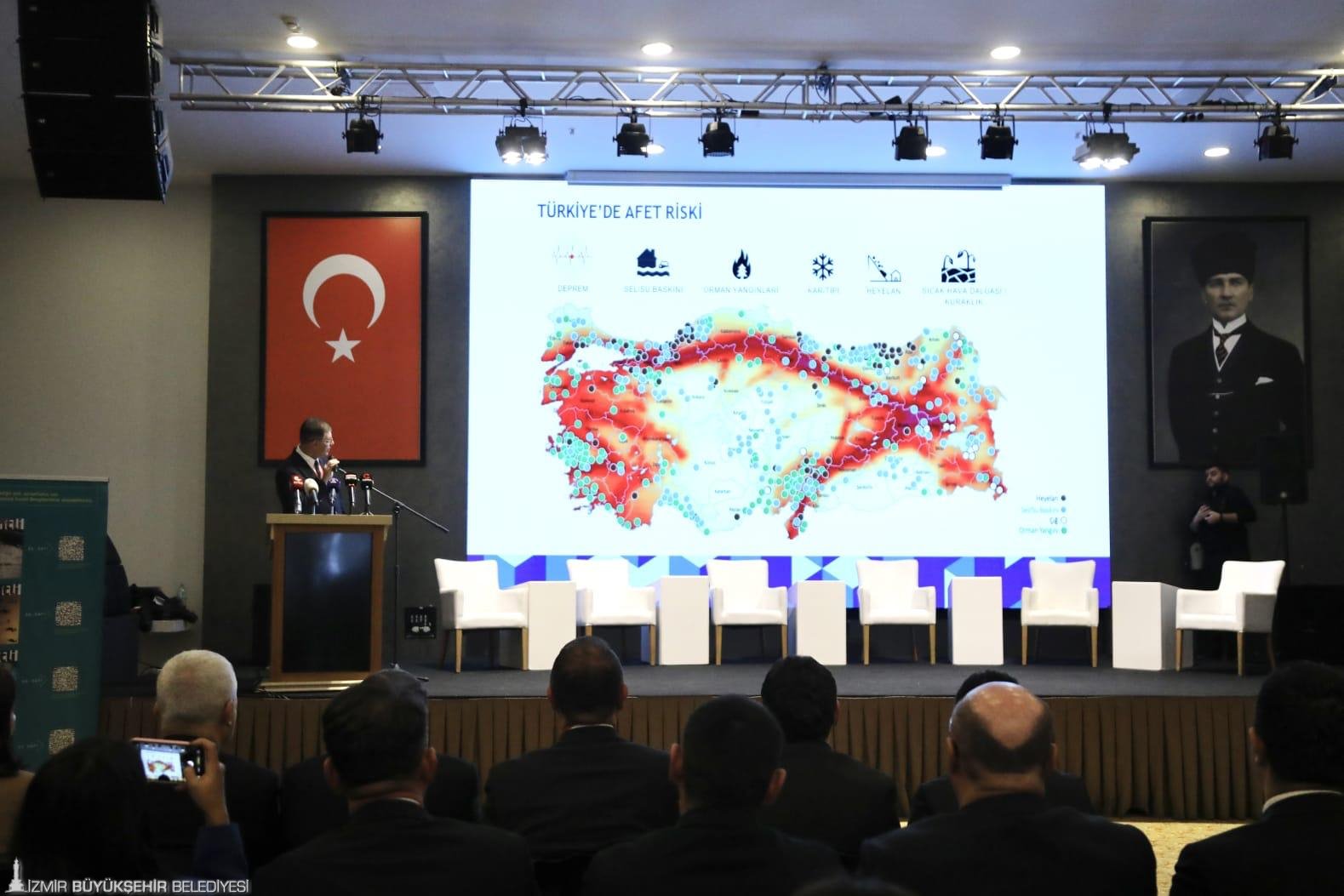 Risk azaltım ve afetle mücadele planlarının sadece merkezi yönetimin görevi değil, yerel yönetimlerin de önemli bir parçası olması gereken konular olduğunu ifade eden Başkan Tugay, “Depremler ve orman yangınları bizim için kısa vadede ciddi sorunlar yaratan konular gibi görünüyor olsa da aslında yaşadığımız en büyük ve en önemli krizin iklim krizi olduğunu ifade etmek isterim. Kuraklık konusu, aşırı sıcak hava dalgaları ve bunların sebep olduğu doğrudan ya da dolaylı toplum sağlığı ile ilgili sonuçlar, çevre problemleri, tarıma yansımasıyla oluşabilecek gıda krizi, ekosistem üzerinde yarattığı tahribatlar… Bizi çölleşmiş bir ülkeye doğru götüren bu tablo, en fazla ciddiye almamız gereken ve en öncelikli çalışmamız gereken konulardan biri olarak önümüzde duruyor” sözlerine yer verdi.