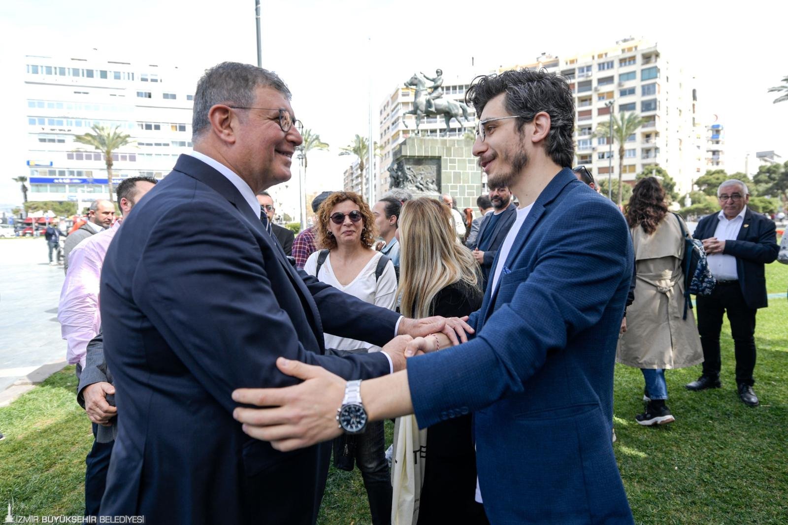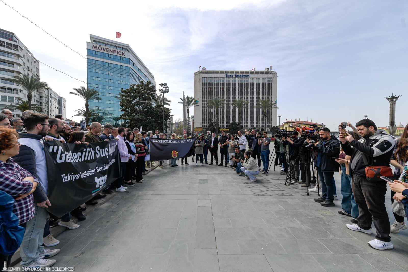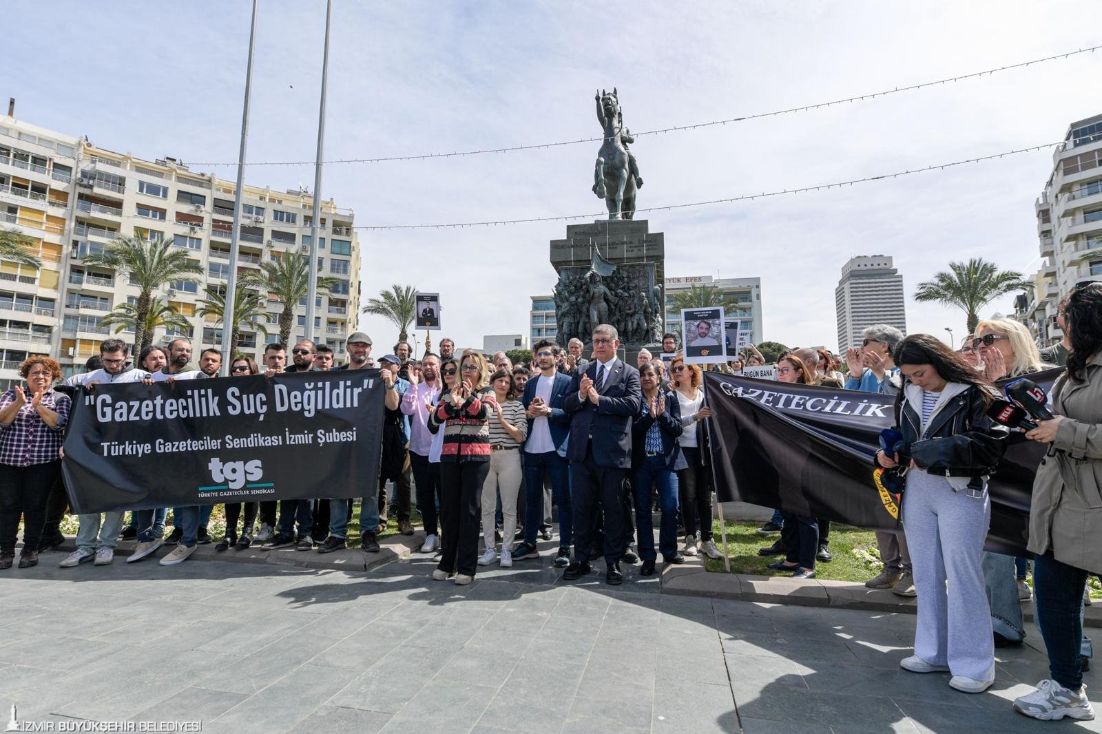 İstanbul Büyükşehir Belediye Başkanı Ekrem İmamoğlu’nun tutuklanmasının ardından yurt genelinde başlayan eylemlerde görev yaparken gözaltına alınan ve tutuklanan gazeteciler için İzmirli gazeteciler bir basın açıklaması yapıldı. İzmir Büyükşehir Belediye Başkanı Dr. Cemil Tugay da Cumhuriyet Meydanı’nda toplanan gazetecilere destek verdi. Başkan Tugay, “Gazeteciler, hiçbir zaman düşmanca taraf olmayan, vicdan ve demokrasi bilincinin, halkın egemenliğinin gözlemcisi olan insanlar. Ne olursa olsun görevlerini yapmaya devam etmeliler. Biz de ne olursa olsun onların hakları için mücadele etmeye, elimizden geldiğince onların yanında olmaya devam etmeliyiz. Bunu yapmak zorundayız. Bu mücadeleler büyük bir güce karşı yapılıyor. Dolayısıyla bize büyük birliktelikler lazım. Dirençli olmak lazım” diye konuştu. Basın açıklamasında, İzmir’deki eylemleri takip ederken kamerasına el konulup gözaltına altına alınan, dün sabah ise serbest bırakılan gazeteci Yağız Barut da yer aldı.