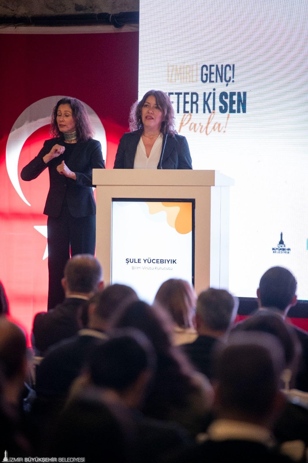 Bilim Virüsü Platformu’nun Kurucusu Şule Yücebıyık, tırnaklarıyla kazıdığı bir kariyer yolculuğu olduğunu belirterek “Kendime ve hayallerime inanmaktan hiç vazgeçmedim” dedi. Yücebıyık çocuğunun 13 yaşında gelecek kaygısını taşımasını örnek göstererek Bilim Virüsü’nün bir seferberlik olarak doğduğunu ifade etti. Yücebıyık, “Hayallerini kaybetmek üzere olan gençler var. Bazı başvuruları okurken gözlerimizden yaşlar aktı. Atatürk’ün dediği gibi gençler varsa umut, gelecek var. Bugün bir ilk yaşanıyor. Bir belediye öncülüğünde seferberlik başlatılıyor. Herkes emeğini katıyor. Biz gençlerin arkasındayız, yanındayız, birlikte yürüyeceğiz. Sevgili gençler arkanızda bir torpiliniz yok ama bugün arkanızda bir şehir var, Başkan’ımız Cemil Tugay var, iş dünyası var. İzmir sizinle” dedi.