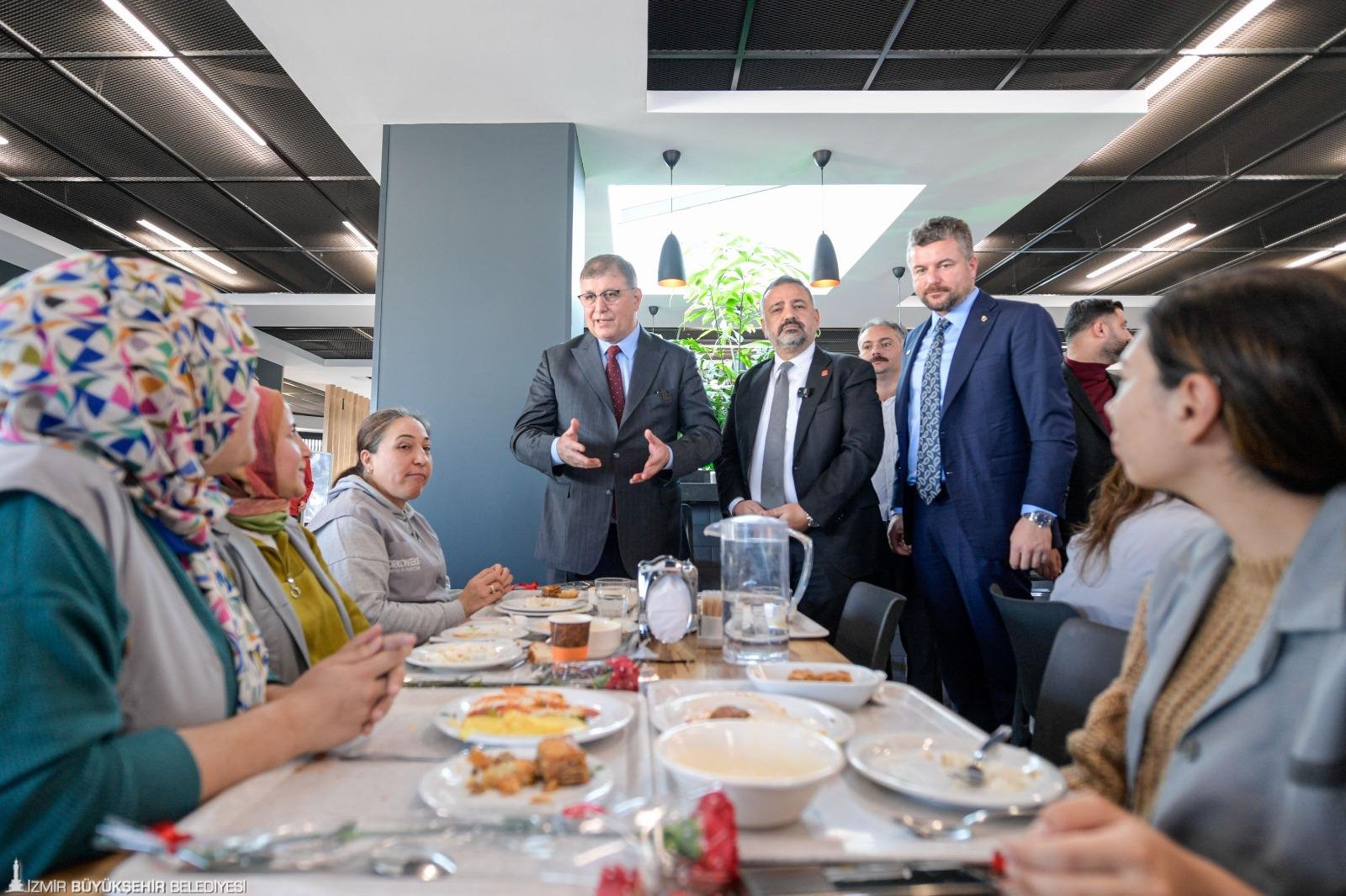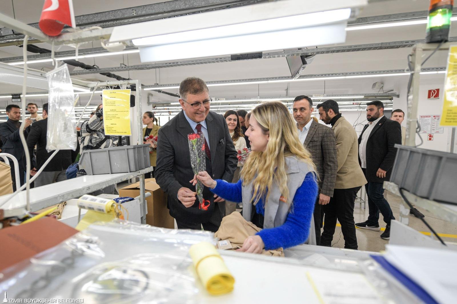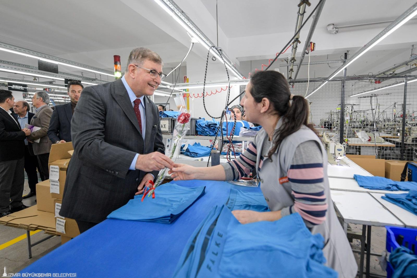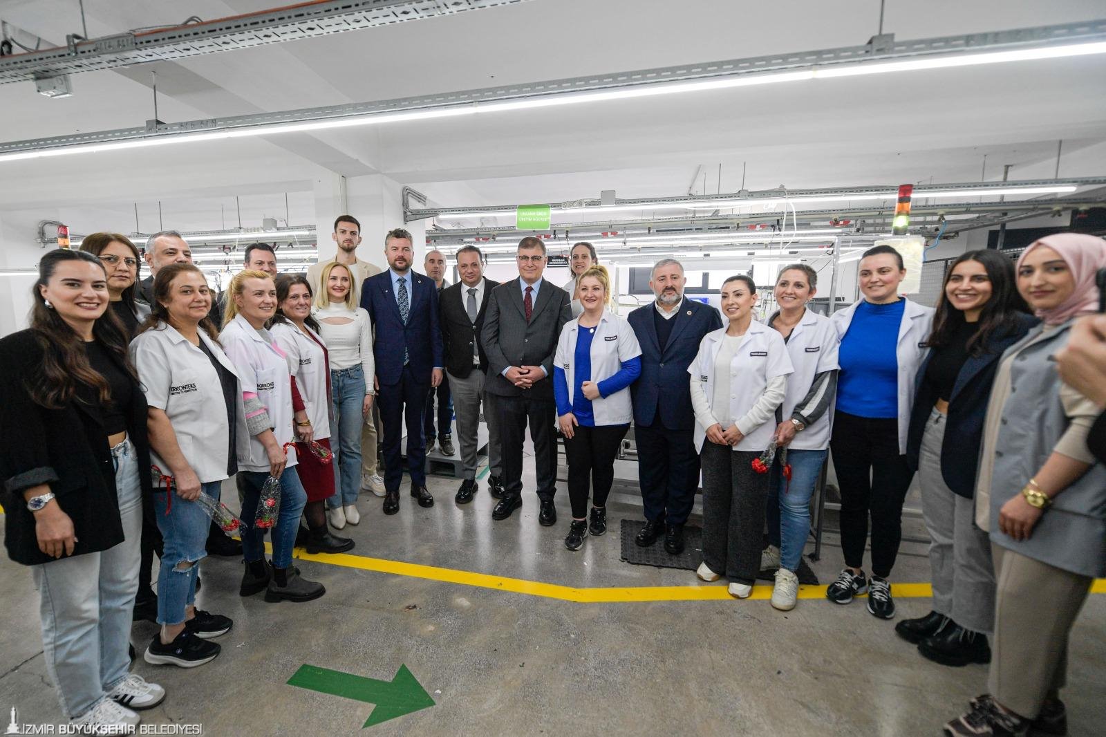 İzmir Büyükşehir Belediye Başkanı Dr. Cemil Tugay, CHP İzmir İl Başkanlığı’nın 8 Mart Dünya Emekçi Kadınlar Günü programı kapsamında Buca’da kadın işçilerle bir araya geldi. Çalışanlarının yüzde 85’i kadın olan Narkonteks Tekstil AŞ’yi ziyaret eden Başkan Dr. Cemil Tugay, üretim yapan kadın işçilere karanfil dağıttı ve birlikte yemek yedi. Başkan Tugay’a CHP İzmir İl Başkanı Şenol Aslanoğlu, Buca Belediye Başkanı Görkem Duman, CHP Kadın Kolları üyeleri de eşlik etti. Narkonteks Tekstil AŞ Yönetim Kurulu Başkanı ve Buca Ege Organize Sanayi Bölgesi Yönetim Kurulu Başkanı Toygar Narbay, Yönetim Kurulu Başkan Yardımcısı Tolga Narbay ve yönetim kurulu üyeleri Tugay’a üretimlerine ilişkin sunum yaptı.