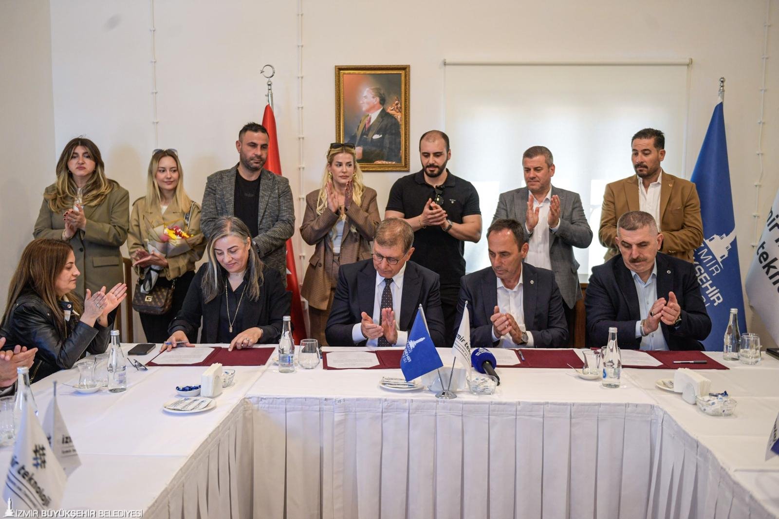 İzmir İnovasyon ve Teknoloji AŞ ile Genel-İş arasında, SODEMSEN koordinasyonunda yürütülen toplu iş sözleşmesi görüşmeleri anlaşmayla sonuçlandı. Taraflar, müzakerelerin ardından tüm maddelerde uzlaşmaya vararak sözleşme metnini imza aşamasına getirdi. 1 Mart’tan itibaren yürürlük kazanan, 29 Şubat 2028’e kadar geçerli olacak toplu iş sözleşmesinde, çalışanların ücret, sosyal hak ve izin koşullarında önemli iyileştirmeler sağlandı. İmzalar, İzmir Büyükşehir Belediye Başkanı Dr. Cemil Tugay, DİSK/Genel İş Toplu İş Sözleşmesi Daire Başkanı Faruk Saral, DİSK Ege Bölge Temsilcisi Deniz Şahin Gümüştekin, DİSK Genel-İş 1 Nolu Şube Başkanı Engin Topal tarafından atıldı. 83 çalışanı ilgilendiren sözleşmenin imza töreninde konuşan Başkan Tugay, en büyük gücü çalışanlardan aldıklarını belirterek “Allah güç versin; çalışalım, hep beraber yolumuzdan şaşmayalım ve daha iyi toplu iş sözleşmelerine hep beraber imza atalım. Hayırlı olsun” diye konuştu.