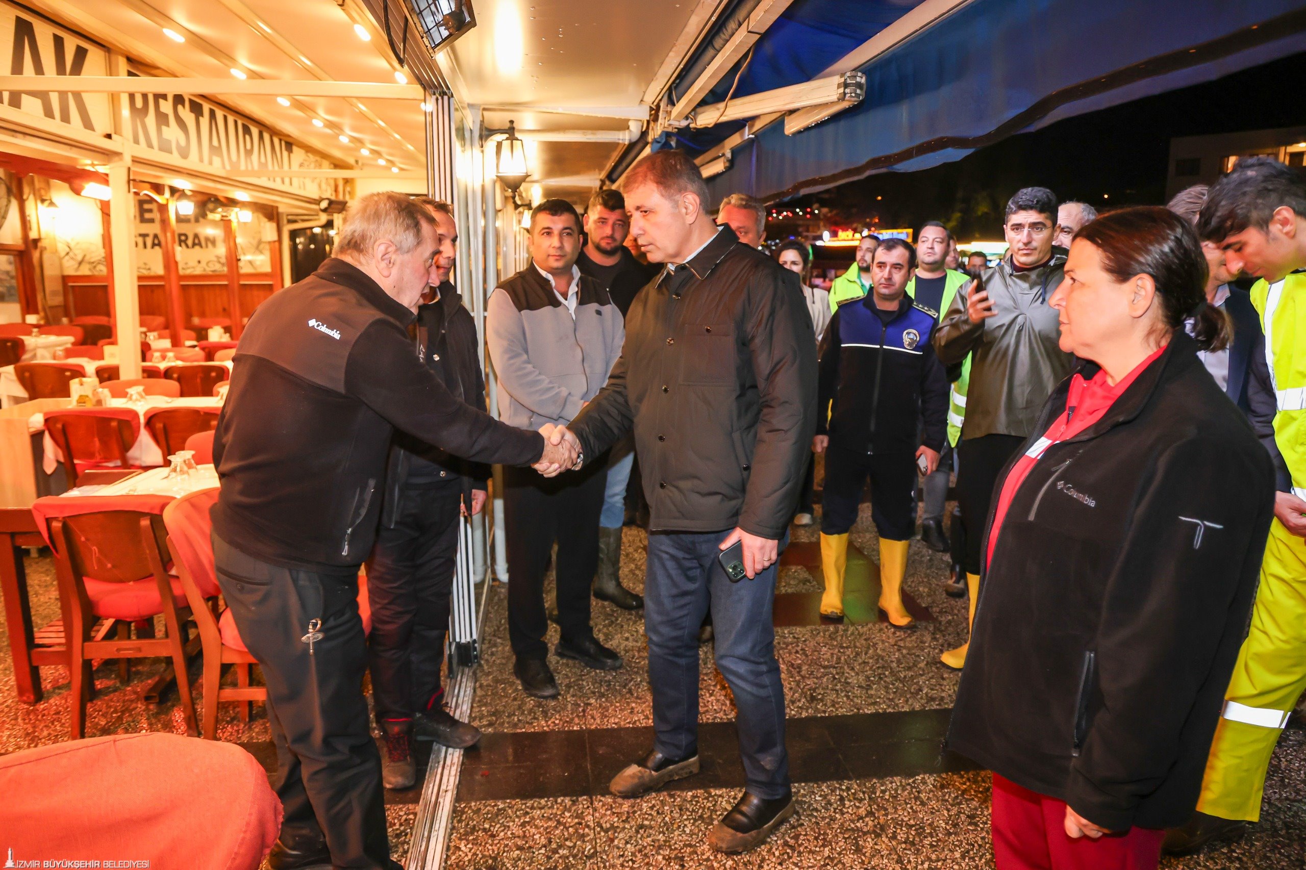 Başkan Tugay Yeni Foça sahilde ekiplerin yürüttüğü su tahliyesi, mazgal temizleme, kanal açma gibi çalışmaları inceledi. Başkan Tugay, deniz taşması sonucu bölgede yaşanan durum hakkında bilgi aldıktan sonra Foça merkeze geldi. Burada esnafı ziyaret eden Başkan Tugay, eksikliklerin giderilmesi için ilgili birimlere talimat verdi. Esnafın yanı sıra Foça sokaklarında evleri su basan yurttaşlarla da bir araya gelen Başkan Tugay, talepleri ve ihtiyaçları dinledi.