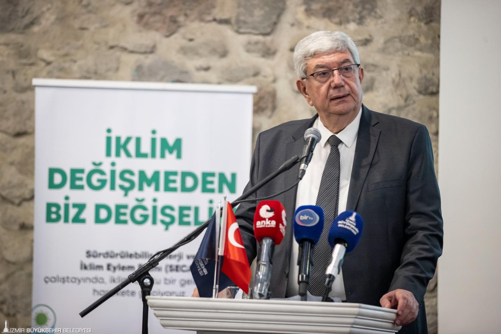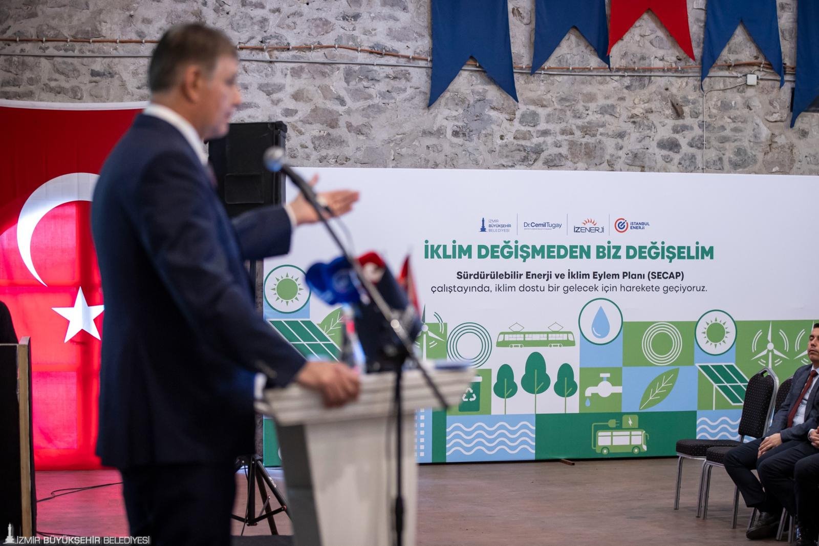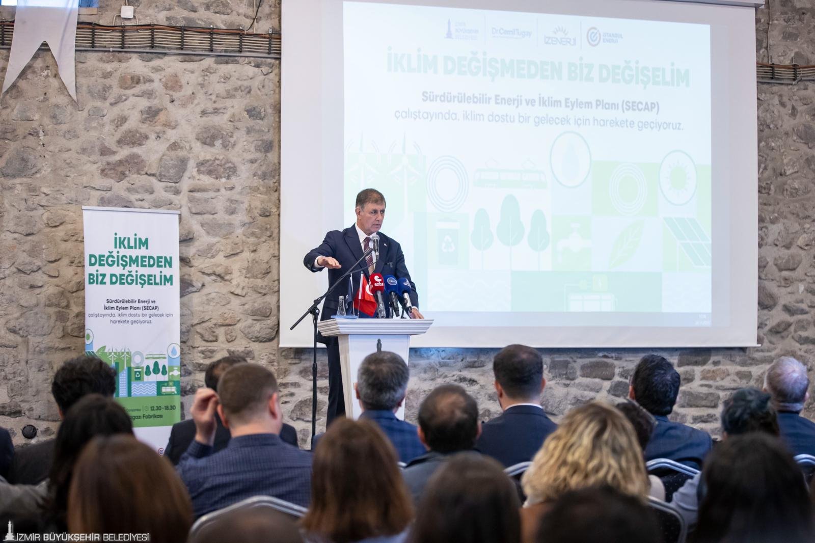 İzmir Büyükşehir Belediyesi, iklim değişikliği ile mücadele kapsamında 2020 yılında hayata geçirdiği İzmir Sürdürülebilir Enerji ve İklim Eylem Planı’nı (SECAP) güncelliyor. Bu kapsamda İzmir Büyükşehir Belediyesi İklim Değişikliği ve Sıfır Atık Dairesi Başkanlığı ile İzmir Büyükşehir Belediyesi iştiraki İZENERJİ AŞ tarafından Tarihi Havagazı Fabrikası’nda “İklim Değişmeden Biz Değişelim” temasıyla bir çalıştay düzenlendi. Çalıştayın ev sahipliğini İzmir Büyükşehir Belediye Başkanı Dr. Cemil Tugay yaptı.