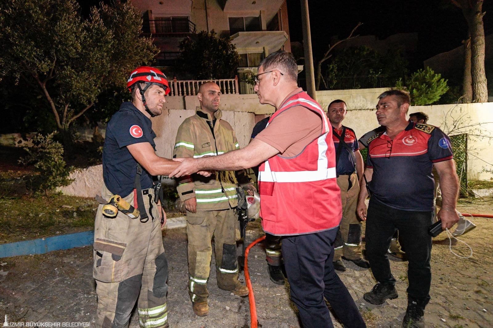 Başkan Tugay, “Biz görevimizi yerine getirmeye çalışıyoruz, elimizden geleni yapıyoruz. Bazen, bugün olduğu gibi anormal rüzgarlarda helikopterler uçamadı, arkadaşlarımız ayakta durmakta zorlandı. Tüm personelimize teşekkür ediyorum. Bu evler yanmadıysa onlara borçluyuz. Diğer bölgelerde de hasarın önlenmesinde çok büyük katkıları var. Orman ekipler de diğer ekipler de aynı şekilde. Buraya gelen tüm diğer şehirlerin itfaiyeleri de hiçbir zaman haklarını ödeyemeyeceğimiz, minnet dolu olduğumuz insanlar. Her birine ayrı ayrı teşekkür ediyorum” şeklinde konuştu.