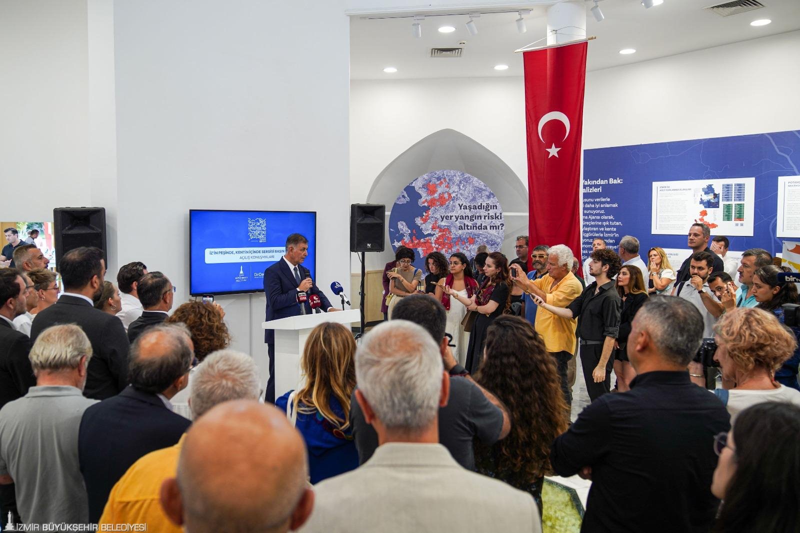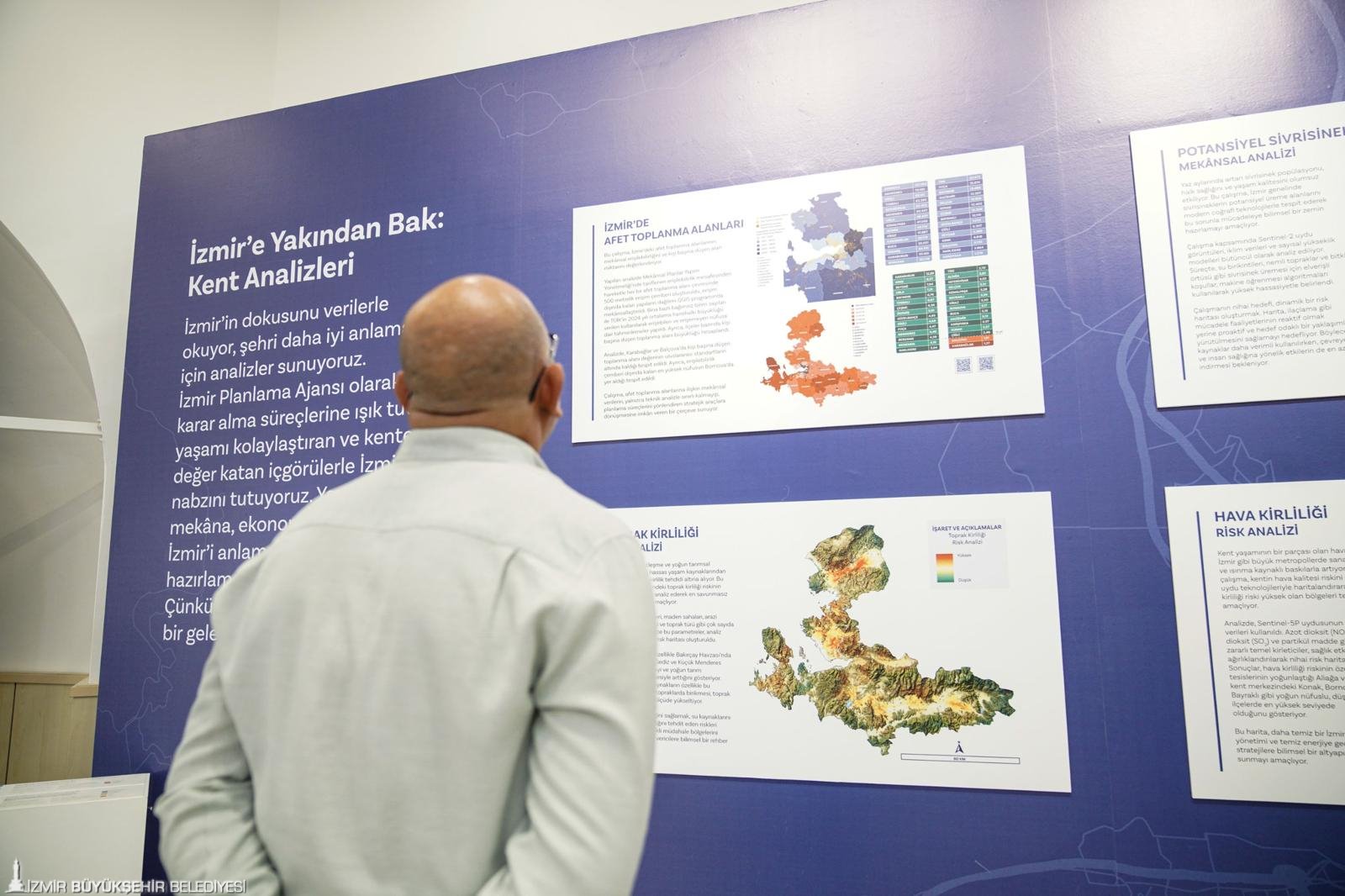 Koray Velibeyoğlu, sergide yer alan çalışmalar hakkında basın mensuplarını bilgilendirdi. Sergiyi 10 gün içinde 15 bin ziyaretçinin gezdiğini ifade eden Velibeyoğlu, sergide karekod ile İzmir’in sorunları ve ihtiyaçlarına dair yapılan anketler hakkında verileri anlattı. Ardından basın mensuplarını ankete katılmaya davet eden Velibeyoğlu, canlı olarak cep telefonları aracılığıyla basın mensuplarının görüşlerini aldı. Canlı ekranda basın mensuplarının İzmir ile ilgili ankete dair verileri yansıtılırken en önemli sorunlar arasında deprem, ulaşım, iklim krizi, çevre sorunları gibi konular yer aldı.