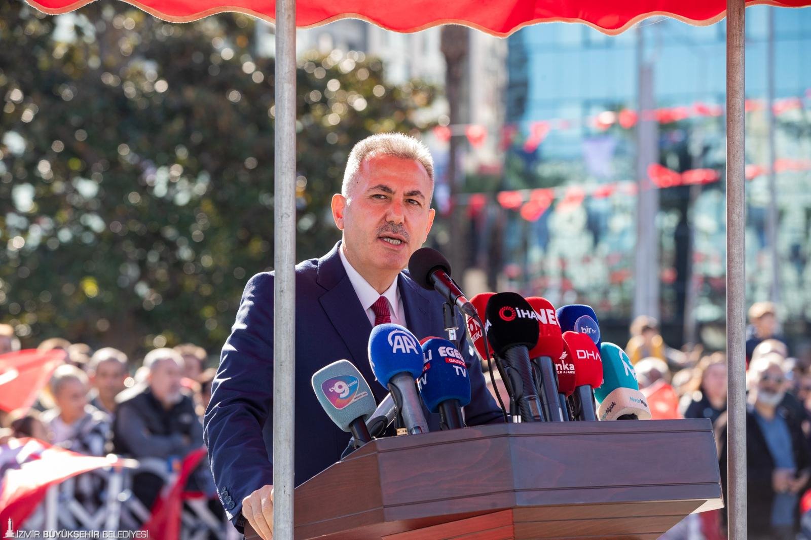 Törende konuşan İzmir Valisi Dr. Süleyman Elban, "Atatürk sadece vatanı kurtarmak ve Cumhuriyet'i kurmakla bu işin yetmeyeceğini biliyordu. Ancak her alanda başarı göstererek, çalışarak medeni ülkelerin geçilebileceğini biliyordu. Türkiye Cumhuriyeti Devleti çok kısa süre içinde çok büyük atılımlara imza attı. Türkiye Cumhuriyeti Devleti dimdik ayağa kalktı. İnşallah bizle de eğitimde, bilimde, savunma alanında, sanayide, tarımda, kısaca her alanda çok çalışarak, çok gayret ederek, yorulmadan mücadele ederek medeni ülkeleri çok kısa zamanda yakalayıp onların üzerine çıkma hedefindeyiz. Bu güzel vatanın kurtarılmasında, bu güzel Cumhuriyet’in ilan edilmesinde emeği geçen başta Cumhuriyet’imizin kurucusu Gazi Mustafa Kemal Atatürk ve silah arkadaşları olmak üzere bu ülkenin kurulmasında ve korunmasında emeği geçen tüm ecdadımızı rahmetle anıyorum. Milletimiz kıyamete kadar bahtiyar, devletimiz payidar olsun” ifadelerini kullandı.