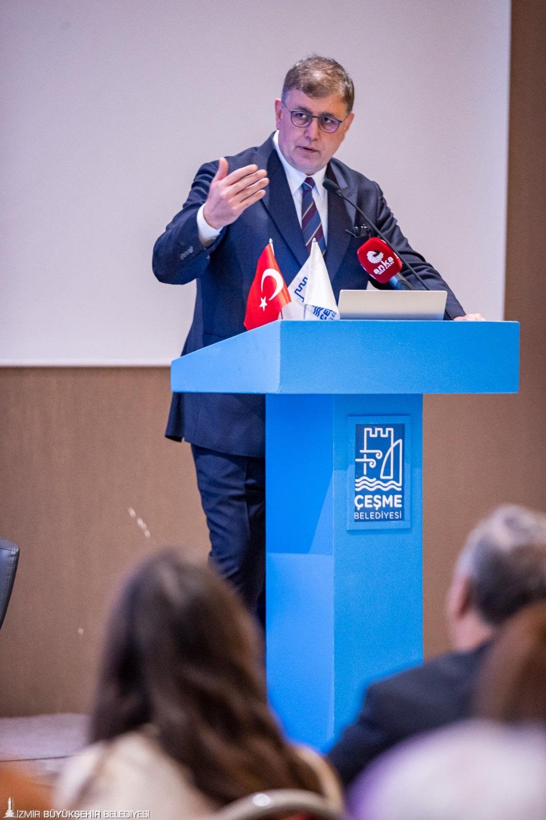 Toplantının açılış konuşmasını yapan Başkan Dr. Cemil Tugay, “Çeşme’yi Türkiye’de kime sorsak ‘turizmin merkezi’ der. Böyle bir yerde nitelikli tarımı konuşmak üzere bu toplantıyı düzenleyen başkanımıza teşekkür ediyorum. Bu bir vizyondur” dedi.