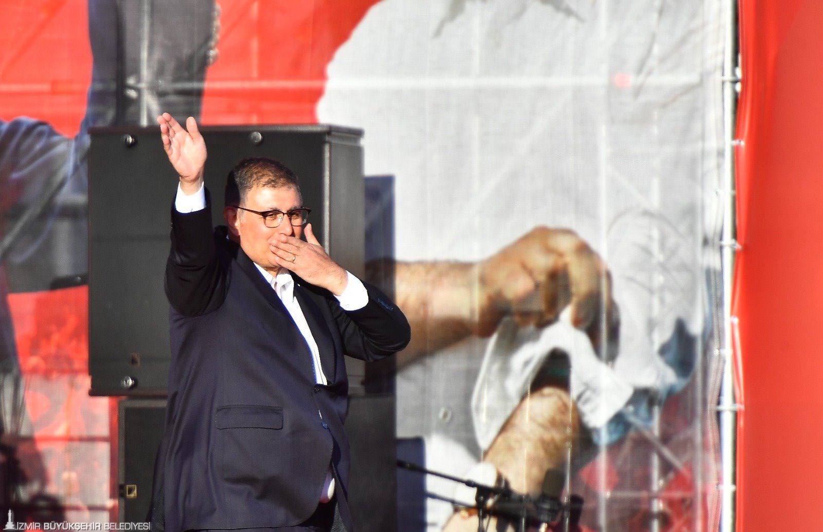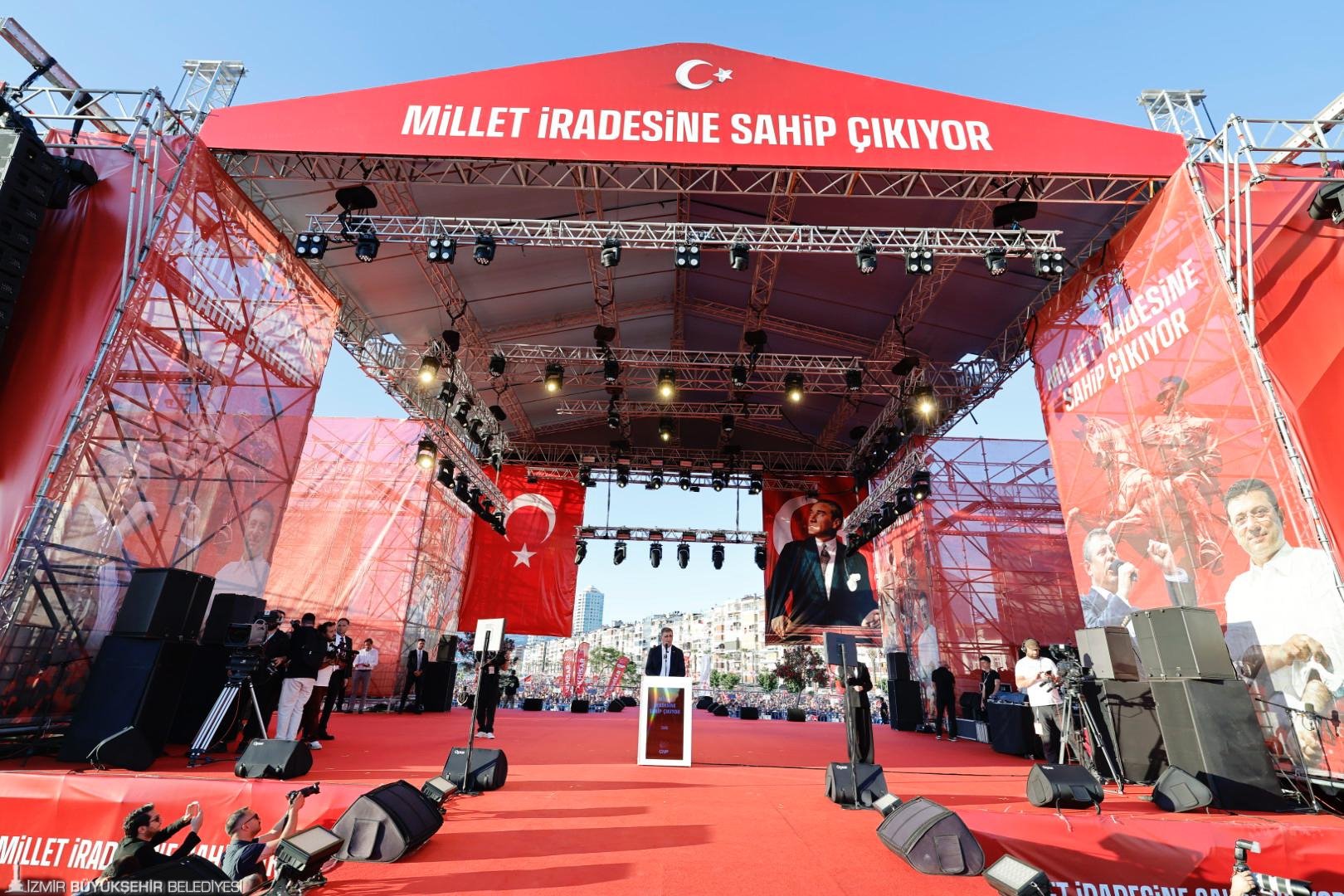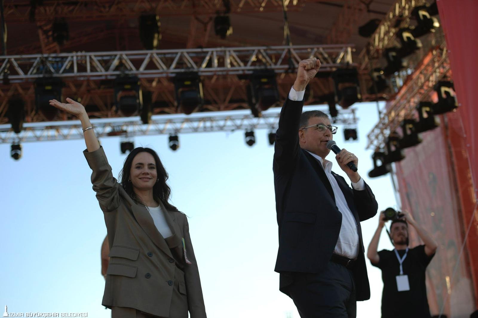 Sevginizi bu millete vermeye hazır mısınız?’ Ekrem Başkan’ımıza ve onunla beraber cezaevinde tutulan tüm yoldaşlarımıza buradan selam söylüyoruz. Onlara hep beraber selam söylüyor muyuz? Önümüzdeki günlerde yapacağımız bu mücadeleyi daha da büyütmeye hazır mıyız İzmir, hazır mıyız Türkiye? Yolumuz açık olsun kardeşlerim.”