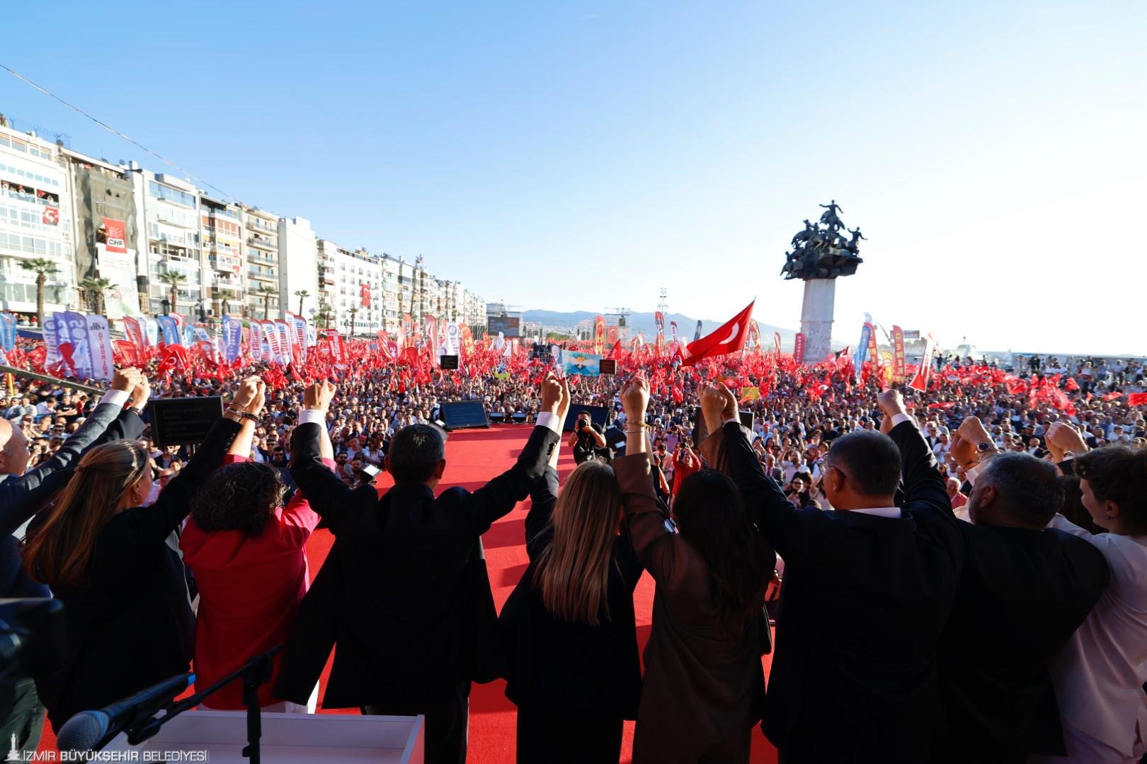 CHP tarafından 19 Mayıs Atatürk’ü Anma Gençlik ve Spor Bayramı’nda organize edilen “Millet İradesine Sahip Çıkıyor İzmir Mitingi”, Gündoğdu Meydanı’nda büyük bir coşkuya sahne oldu. CHP Genel Başkanı Özgür Özel ve eşi Didem Özel, eski CHP Genel Başkanı Hikmet Çetin, İzmir Büyükşehir Belediye Başkanı Dr. Cemil Tugay ve eşi Öznur Tugay, Ekrem İmamoğlu’nun eşi Dilek İmamoğlu, CHP İzmir İl Başkanı Şenol Aslanoğlu ve eşi Duygu Aslanoğlu, CHP Parti Meclisi (PM) ve Yüksek Disiplin Kurulu (YDK) Üyeleri, milletvekilleri, belediye başkanları, parti mensuplarının yer aldığı tarihi mitingde yurttaşlara seslenen Başkan Tugay, “Türkiye elbette büyük ve güçlü bir ülke ama yanlış yönetilince yoksulların ve işsizlerin ülkesi olduk. Cumhuriyet kurulduğu yıllarda idealist, vatansever yöneticileri vardı. Halk da onların etrafında kenetlenmişti. İşte bu şekilde Türkiye hızla büyümüş ve yükselmişti ama şimdi; hata üstüne hata yapıyor, acısını çiftçisiyle, emeklisiyle, öğrencisiyle, işçisiyle, memuruyla ve en önemlisi iş bulamayan gençleriyle tüm halkımız çekiyor. Gençlerimiz başka ülkelerde kendisine gelecek arıyor. Onlara ‘Giderlerse gitsin’ diyor birileri. İçimiz acıyor, çünkü gidenler bizim geleceğimiz. Bu yanlışlara azim ve kararlılıkla hep beraber ‘dur’ diyeceğiz değerli kardeşlerim ve büyüklerim. Türkiye kaybettiği her şeyi tekrar geri kazanacak. Çalışarak başaracağız. Kendimize, halkımıza, değerlerimize inanarak bunu başaracağız” diye konuştu.