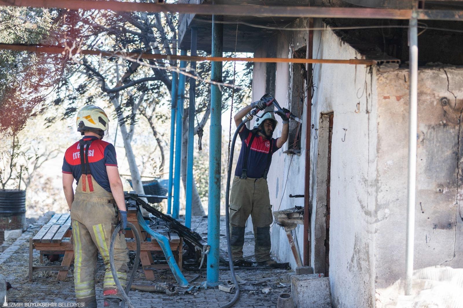 İzmir İtfaiyesi gece boyunca devam eden yangına 28 arazöz, 17 su tankeri, iş makinaları ve toplam 120 personel ile yangına müdahale etti. Yangında iki katlı bir ev ile altı hayvan damı tamamen, bir konteyner yapı ise kısmen yandı. Bir kasalı kamyonet tamamen zarar gördü. Yangında bazı kümes hayvanları da telef oldu. Köy alanı etrafındaki zeytin ağaçları zarara uğradı. İzmir Büyükşehir Belediyesi İtfaiye Dairesi Başkanlığı ekipleri, son 48 saatte 9’u orman yangını olmak üzere toplam 289 yangına müdahale etti.