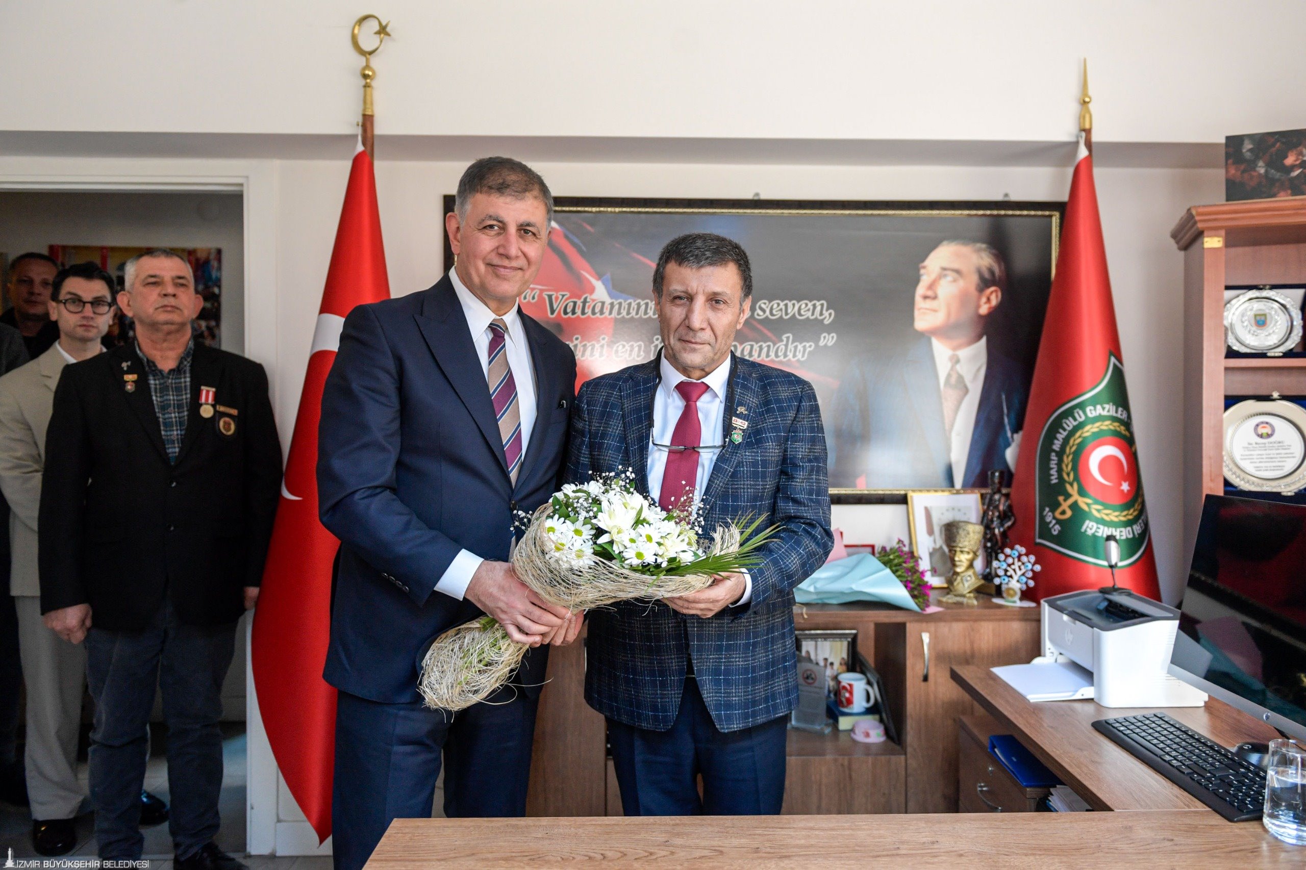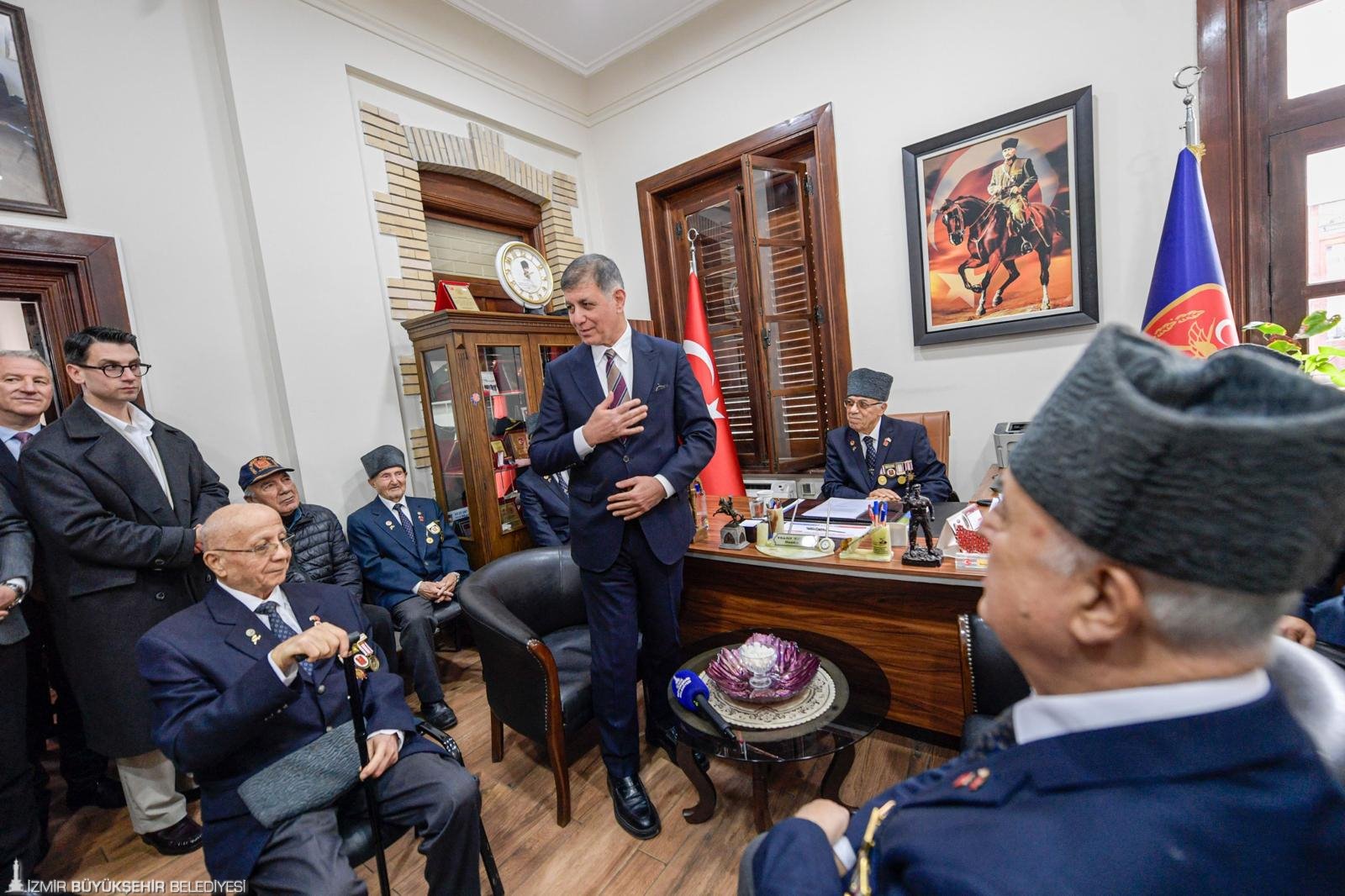 Başkan Dr. Cemil Tugay, ikinci ziyaretini Türkiye Harp Malulü Gaziler, Şehit Dul ve Yetimler Derneği İzmir Şubesi’ne yaptı. Şube Başkanı Recep Doğru, “Burası bizim şefkat yuvamız, kader arkadaşlarımızla bir araya geldiğimiz yer. Bizimle buluşmanız çok önemli. İlginiz ve alakanız, gerçekten en üst seviyede. Her türlü sorunumuza yardımcı oluyorsunuz” dedi. Tugay ise, “İhmal etmememiz lazım. Sizin iyi günlerinizi görerek hep birlikte olalım. Bizim için önemlisiniz, laf olsun diye değil. Talebim yok, sadece iyiliğinizi istiyorum” şeklinde konuştu.
