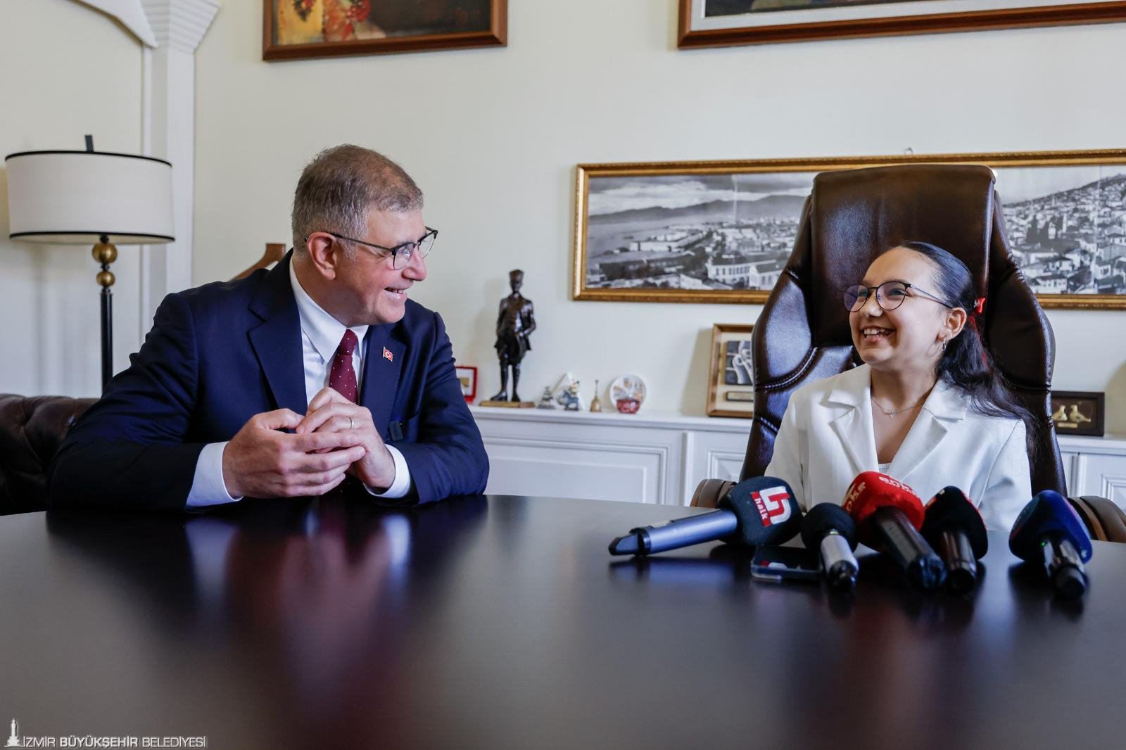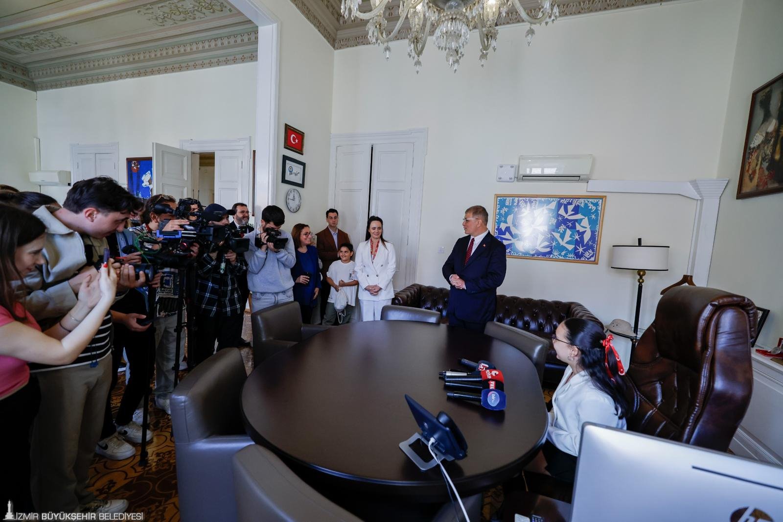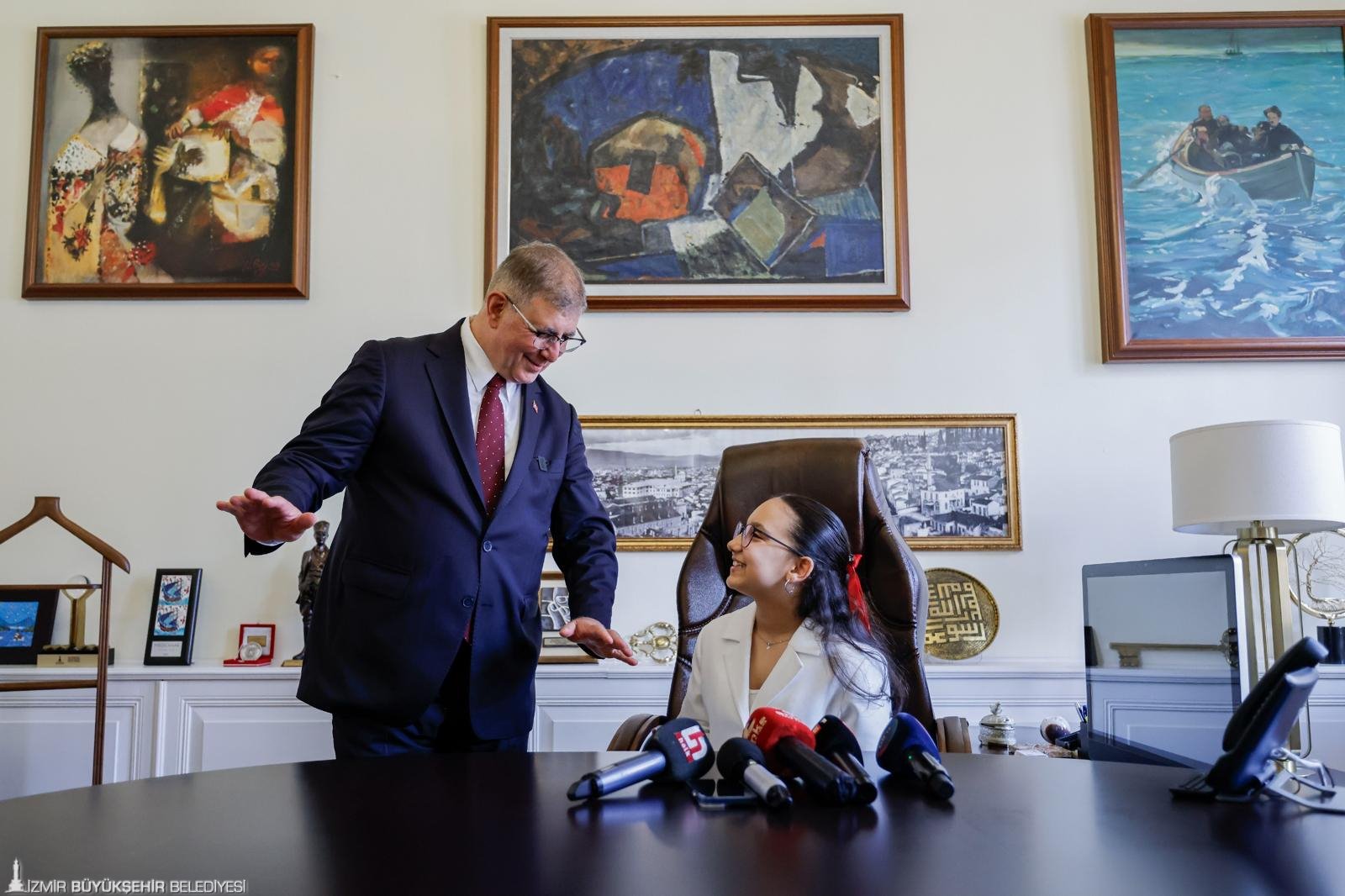 İzmir Büyükşehir Belediye Başkanı Dr. Cemil Tugay, Ulu Önder Gazi Mustafa Kemal Atatürk'ün dünya çocuklarına armağan ettiği 23 Nisan Ulusal Egemenlik ve Çocuk Bayramı'nda koltuğunu İzmir Çocuk Meclisi sözcüsü, Atakent Erdoğan Kibarer Ortaokulu 6. sınıf öğrencisi 12 yaşındaki Derin Taş'a devretti. Makamında eşi Öznur Tugay ile Derin Taş ve ailesini ağırlayan Başkan Tugay, “Bugün sana koltuğumuzu teslim edeceğim. Yüreğindeki dilekler gerçekleşsin. Senin gibi güzel çocuklarımız böyle güzel görevlerde olacaklar. Senin burada olman onlara da ilham versin” dedi.