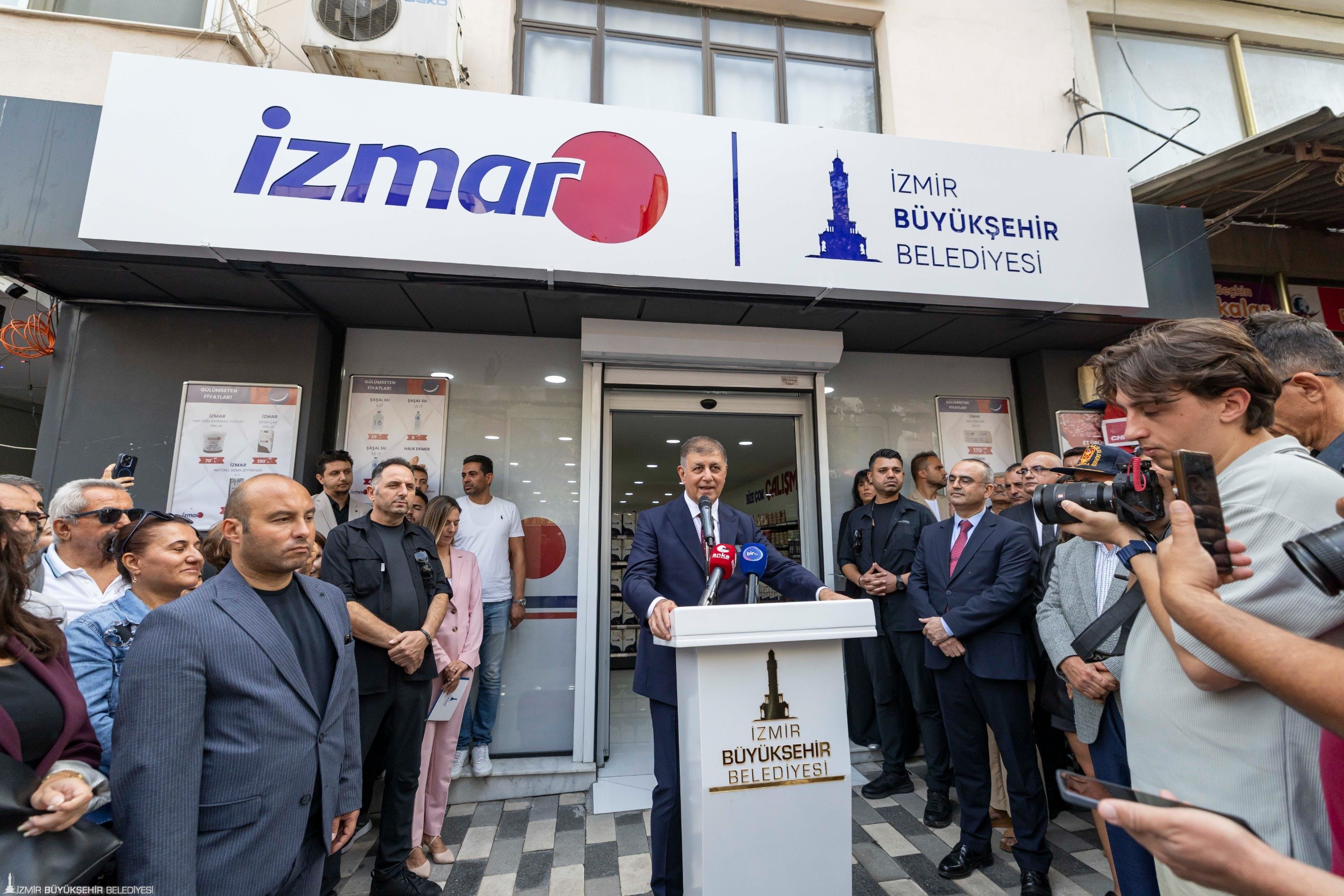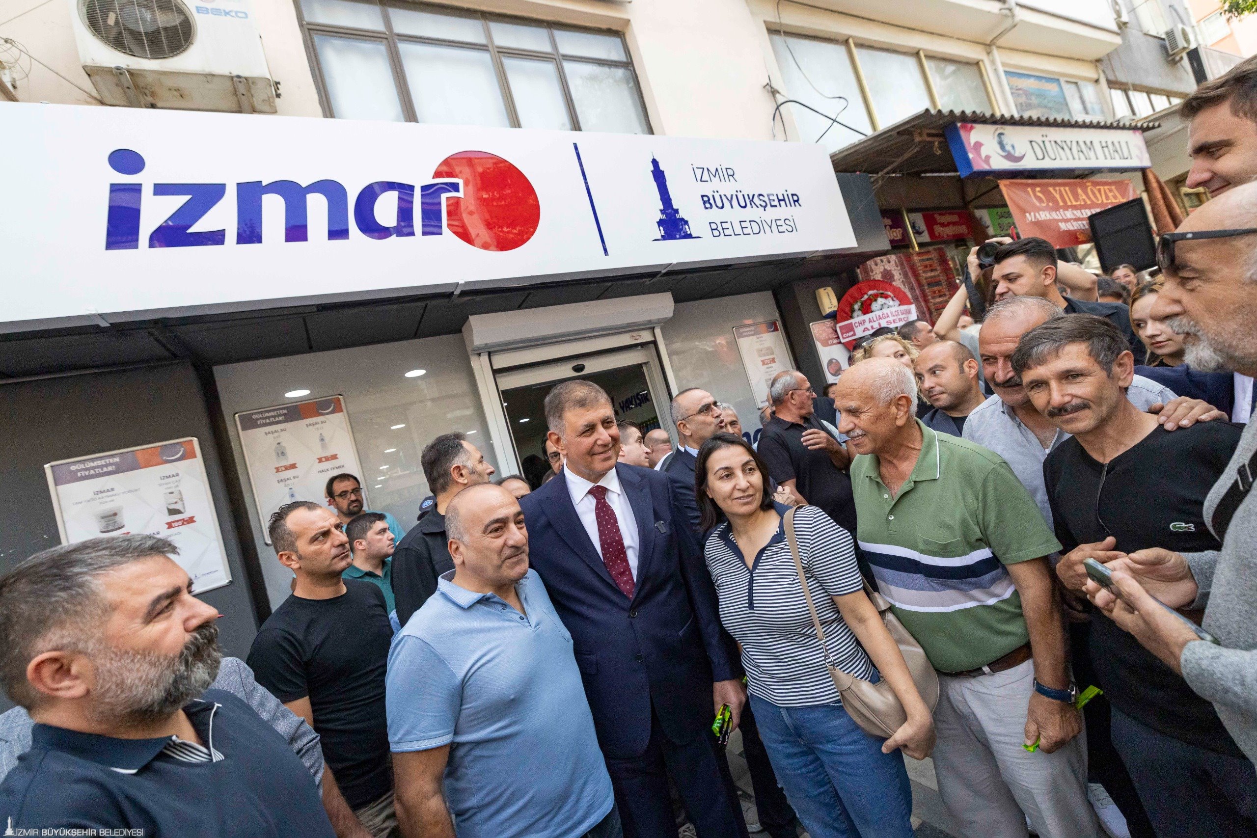 İzmir Büyükşehir Belediye Başkanı Dr. Cemil Tugay’ın İzmirlileri enflasyona karşı korumak ve güvenli alışverişle buluşturmak amacıyla hizmete açtığı tanzim satış mağazaları İZMAR, 11’inci şubesini Aliağa’da hizmete açtı. İzmir Büyükşehir Belediyesi’nin iştiraki İZTARIM AŞ tarafından hızla kent geneline yayılan İZMAR’ın yeni mağazası, Aliağa Fevzi Paşa Caddesi üzerinde İzmirli ile buluştu. Mağazanın açılış törenine İzmir Büyükşehir Belediye Başkanı Dr. Cemil Tugay, Kınık Belediye Başkanı Sema Bodur, Cumhuriyet Halk Partisi (CHP) geçmiş dönem milletvekili Atilla Sertel, CHP Aliağa İlçe Başkanı Ali Serçe, Menemen İlçe Başkanı Hüseyin Özbey, İzmir Büyükşehir Belediyesi bürokratları, meclis üyeleri, muhtarlar ve çok sayıda Aliağalı katıldı.