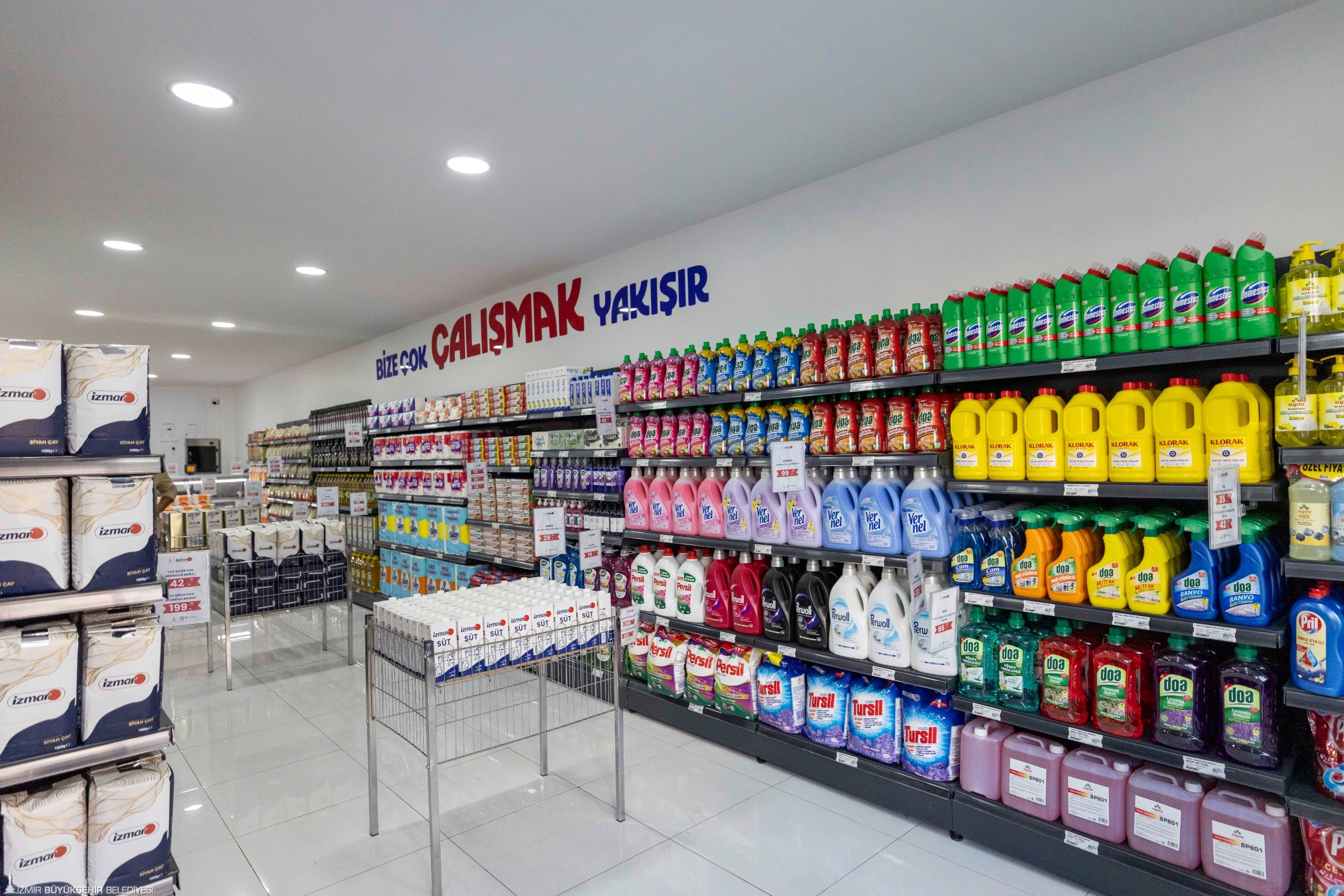 İZMAR’larda İzmirlilere güvenli gıdanın yanı sıra temizlik ürünlerinden kişisel bakıma kadar temel tüketim ürünlerini kâr amacı gütmeden satışa sunuluyor. İZTARIM tarafından Bayındır Süt Fabrikası’nda İzmirli üreticilerden alınan sütlerin işlenmesiyle üretilen İZMAR markalı süt ve süt ürünleri, Ödemiş Et Entegre Tesisi’nde tamamen yerli besiden hazırlanan et ve et ürünleri, Halk Ekmek ürünleri sağlıklı ve uygun fiyata satışa sunuluyor. Kendi bünyesinde üretilen ürünlerin yanı sıra Mordoğan Kooperatifi iş birliğiyle, Giresun Tirebolu Kooperatifi ortaklığıyla siyah çay ürünleri İZMAR markasıyla tüketiciye ulaşırken üreticiye de can suyu oluyor. İZMAR mağazaları son olarak iklim kriziyle mücadeleye destek ve sürdürülebilir bir çevre için yüzde yüz geri dönüştürülebilir materyalden üretilen 4 farklı türde alışveriş torbasını satışa sundu. Küçükten büyüğe sırasıyla 7,50 TL, 14,5 TL, 17,5 TL ve 195 TL’ye satışa sunulan torbaların en büyüğü ısı yalıtımlı plaj çantası olarak da kullanılabiliyor.