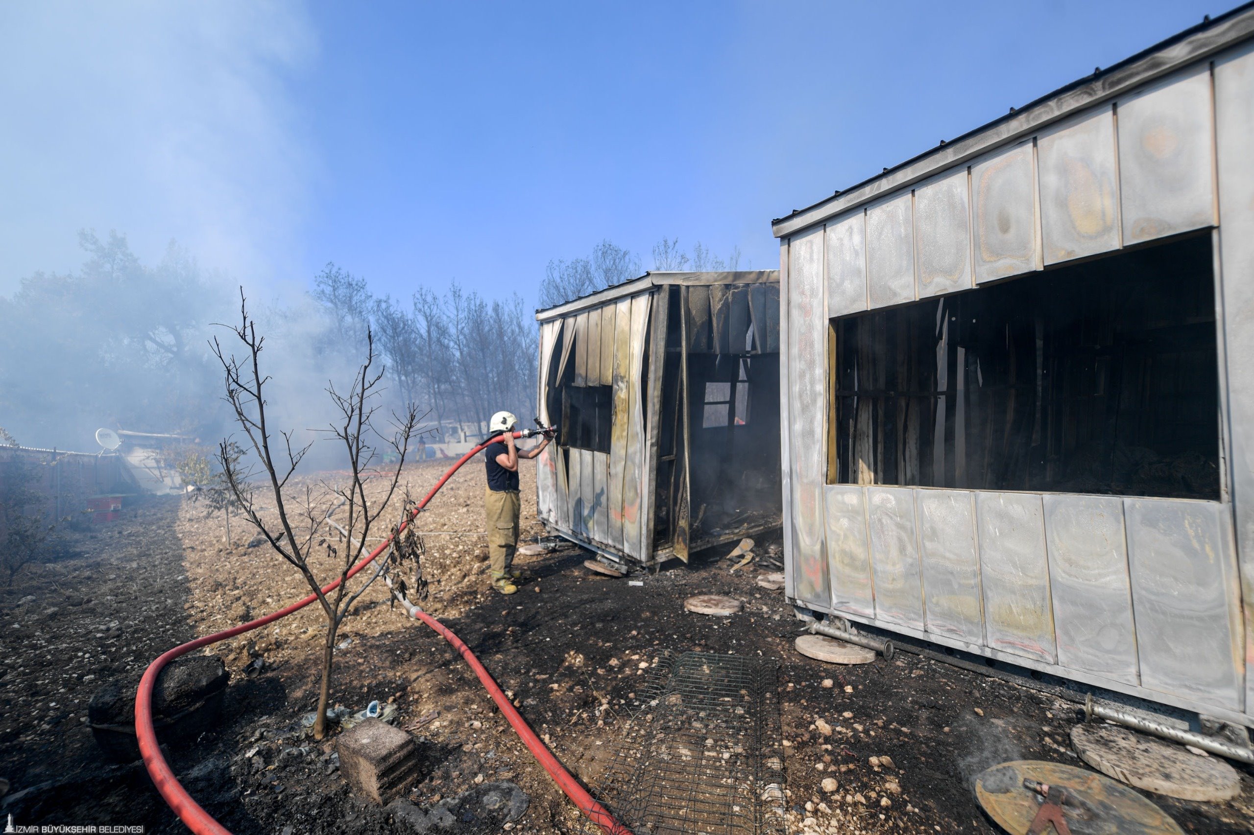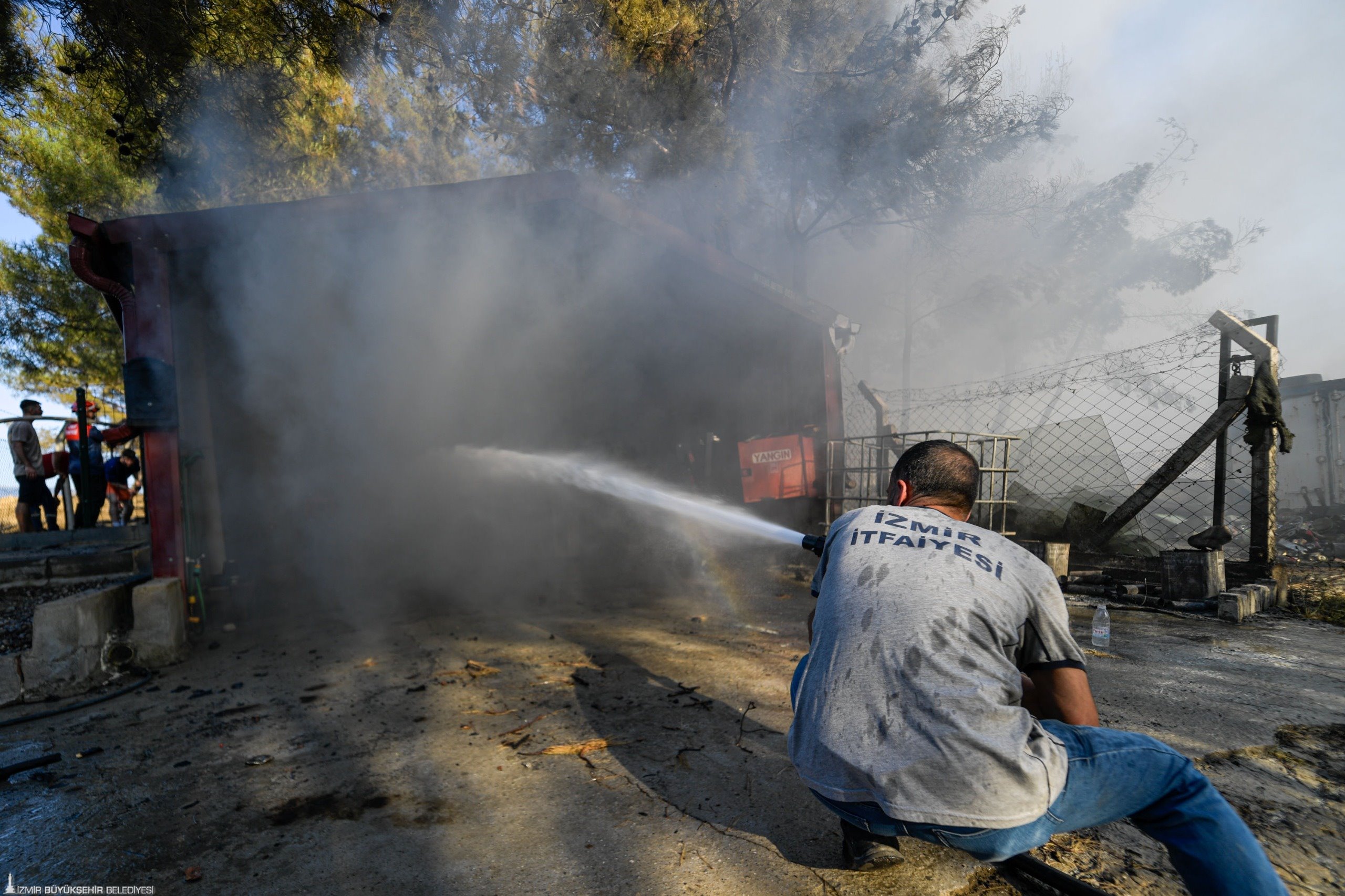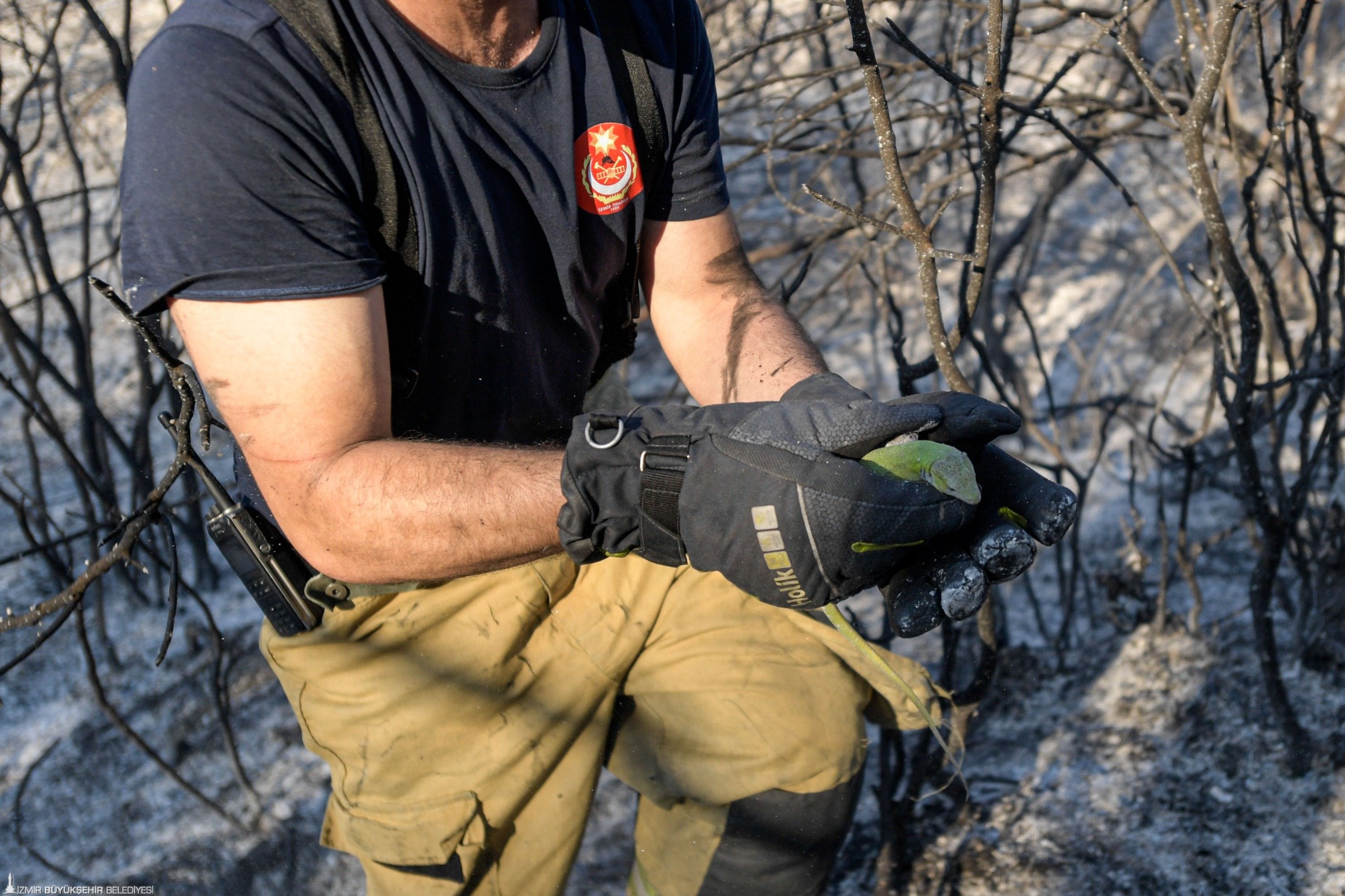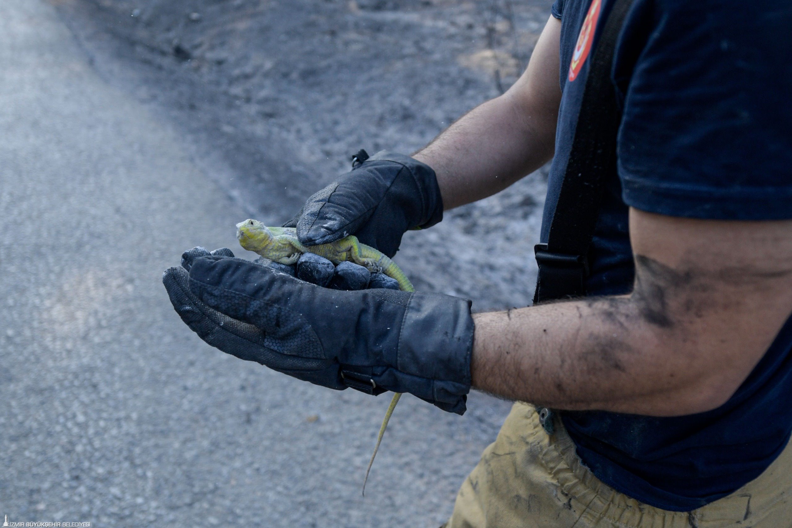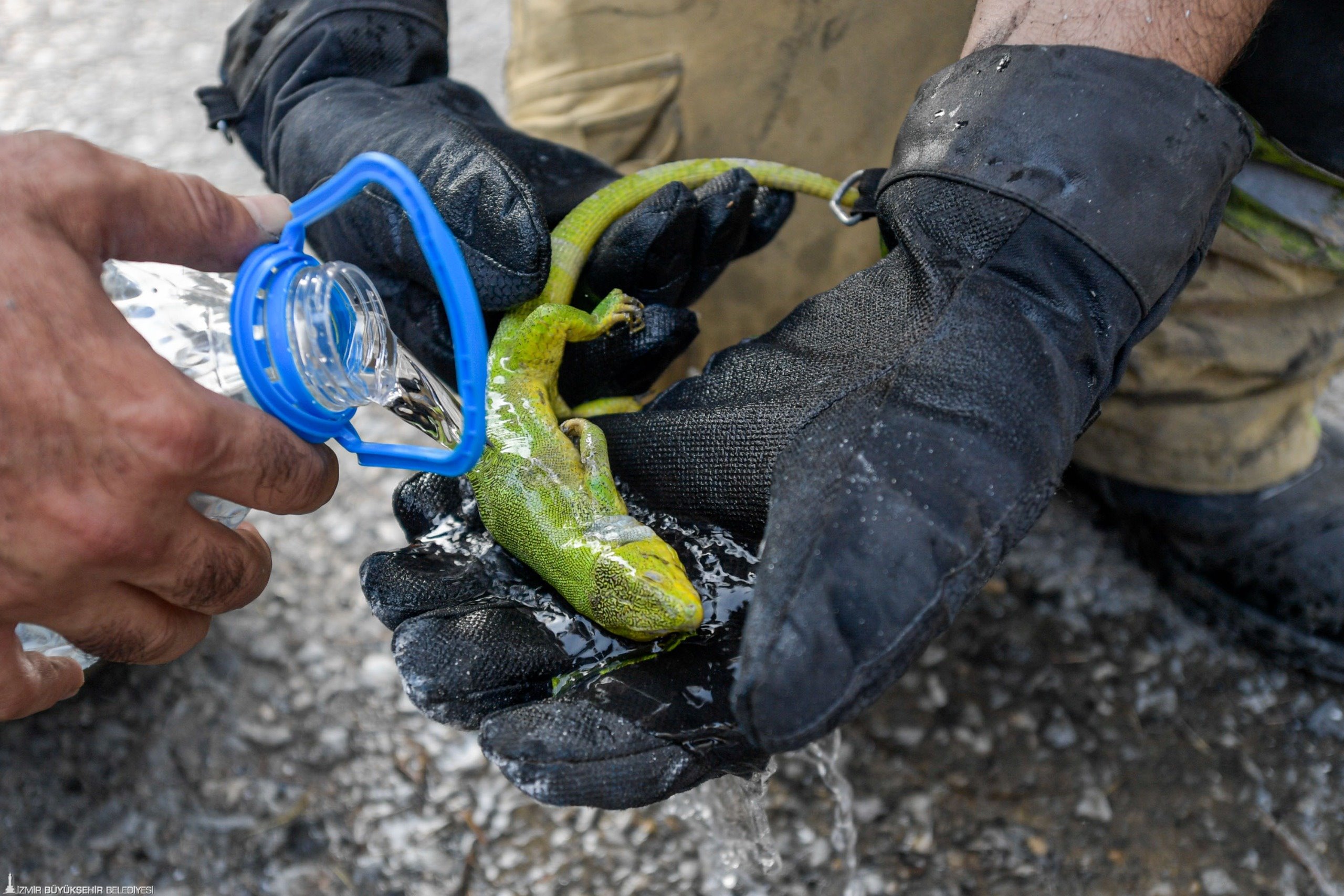 İzmir Büyükşehir Belediyesi İtfaiye Dairesi Başkanlığı ekipleri, yanan alanlarda zarar gören ve kaçmaya çalışan yerli yeşil kertenkeleyi kurtardı. Kertenkeleyi sıcak alandan alarak yıkayan ekip, sahada bulunan ve zarar gören canlıları toplayan İzmir Büyükşehir Belediyesi Veteriner İşleri Dairesi ekiplerine tedavi için teslim etti.