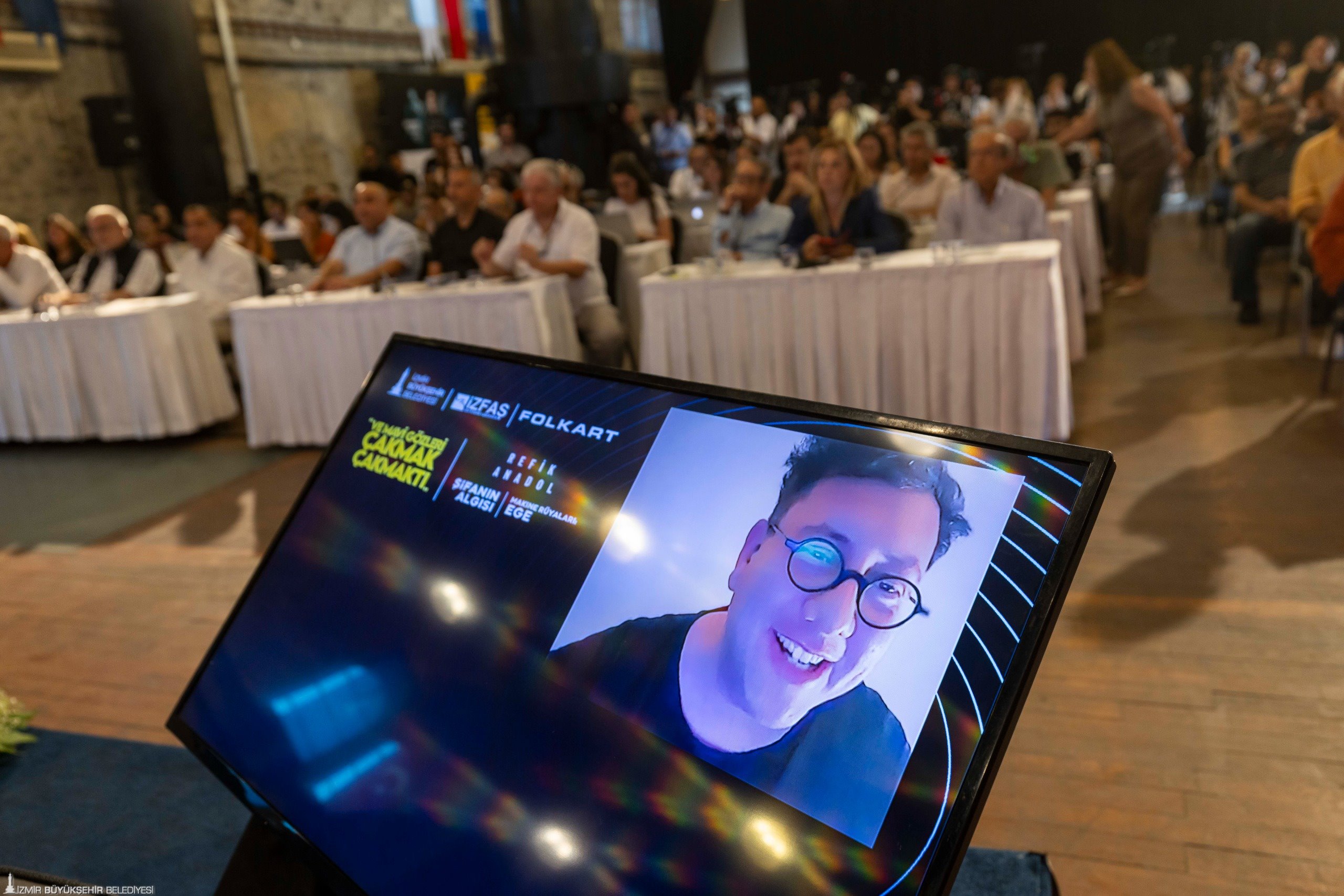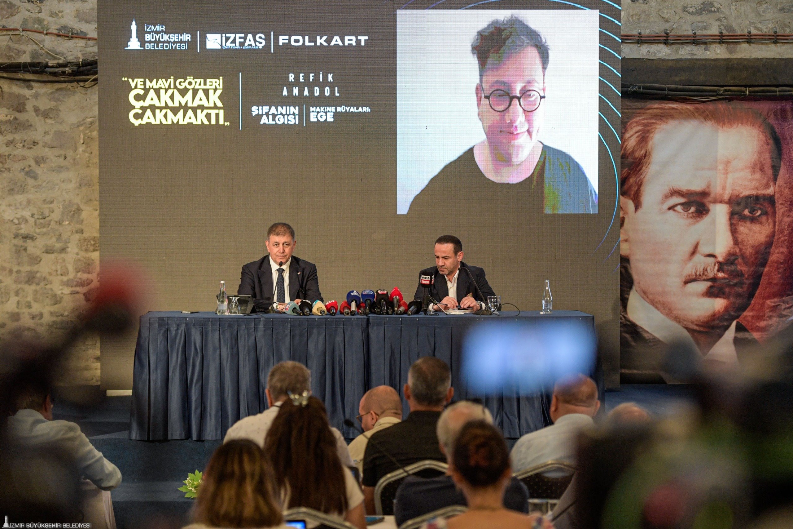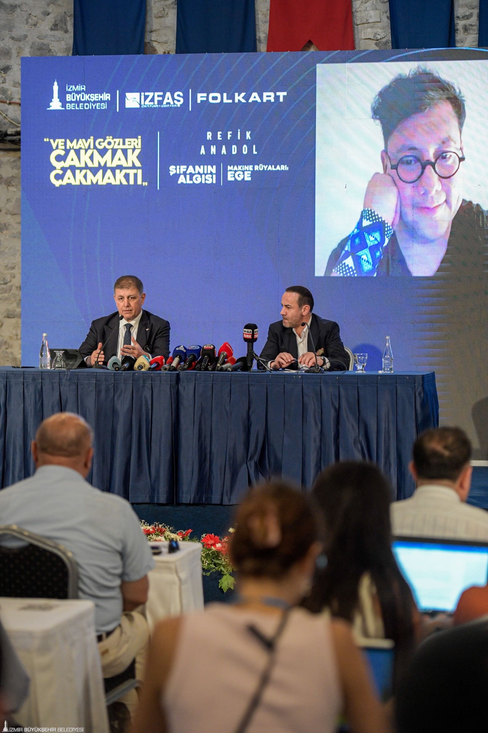 Toplantıya çevrim içi katılan dünyaca ünlü sanatçı Refik Anadol da hem Başkan Dr. Cemil Tugay ve Mesut Sancak’a hem de toplantıyı takip eden basın mensuplarına duygularını ve eserlerinin içeriğini anlattı. Anadol, “Çok heyecanlıyım. Bu pek bilinmiyor ama hayatımın 19 yazını Seferihisar’da yaşamış biri olarak öğrendiğim kadarıyla ‘İzmirliyim’ diyebiliyormuşum. En iyi fikirlerimizi Türkiye’ye getirmeye önem gösteriyorum, bu sebeple bu sergi çok anlamlı. İnsan ve makine ilişkisinin tamamen değiştiği döneme girdik. Bu eseri de İzmir’de paylaşmak çok anlamlı. 10 yıl önce yapay zekâ ile çalışmaya başladım. Dünya yeni yeni yapay zekânın ne olduğunu ve kullanıldığında kıymetli bir düşünce biçimi olarak başarılı olduğunun farkına varıyor. İkinci eser de dünyada ilk defa, ilk örneği olan eser olması anlamında çok özel. Sergimiz yapay zekâ ağlarıyla Ege Denizi’nin görkemli hareketlerini, İzmir’in rüzgârlarının hareket sağladığı, doğayı görünür kılan yapay zekâ algoritması ile şiirsel eser olarak ortaya çıkıyor. Sergimizde geçmiş ve geleceğe dair hayal kurabilmek çok anlamlı” ifadelerini kullandı. Anadol, sergi boyunca genç sanatçılar için uzaktan bir atölye yapacağını, burada yapay zekâ üzerinden işi nasıl ürettiğini ve insan zihninin hareketlerinin nasıl olduğunu gösteren bilgiler vereceğini kaydetti. Başkan Tugay ise bu çalışma için organizasyonu yürüteceklerini duyurdu.