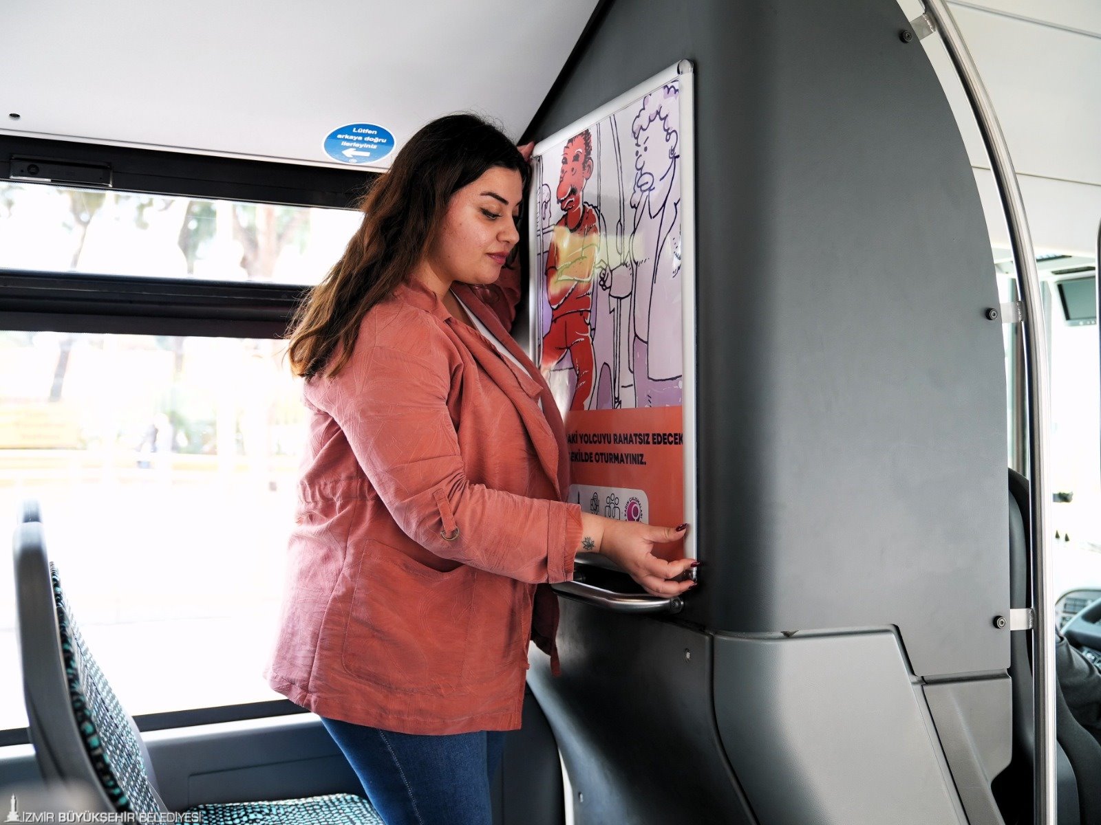 İzmir’in otobüsleri ve durakları, Yerel Eşitlik Eylem Planı’nın “Ulaşım” başlığında geliştirilen çalışma kapsamında hem şiddete karşı hem de güvenli yolculuk hakkında bilgilendirme işlevi görüyor. İzmir Büyükşehir Belediyesi Kadın Çalışmaları Şube Müdürlüğü ve ESHOT ortaklığında başlatılan projede, 410 otobüse acil durum hatlarını bildiren afişler asıldı. Afişte; 183 Şiddetle Mücadele Hattı, KADES mobil uygulama, İzmir Büyükşehir Belediyesi Kadın Dayanışma Merkezi (0232 293 42 93) ve 153 Hemşehri İletişim Merkezi numaraları yer alıyor. Çalışma kapsamında, otobüs duraklarında bulunan ekranlara da kadın yolcular için uygulanan projenin görseli yansıtıldı. Buna göre kadın yolcular, 22.00-06.00 saatleri arasında güzergâh üzerinde trafik güvenliğini tehlikeye atmayacak şekilde durak harici noktalarda inebiliyor. Kadın Çalışmaları Şube Müdürlüğü ekipleri, acil durum hatlarını bildiren afişlerin yanı sıra kadınların güvenli bir yolculuk yapması için farklı konularda bilgilendirici afişleri de otobüslere astı.